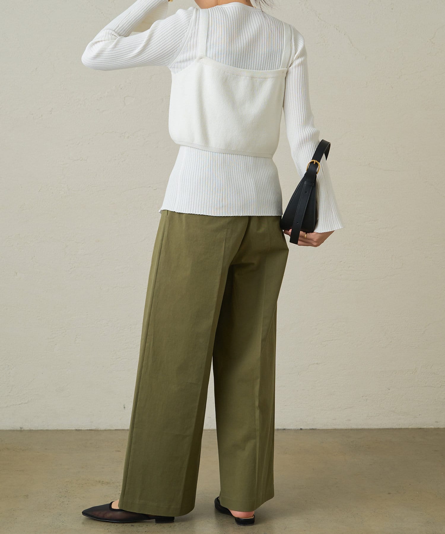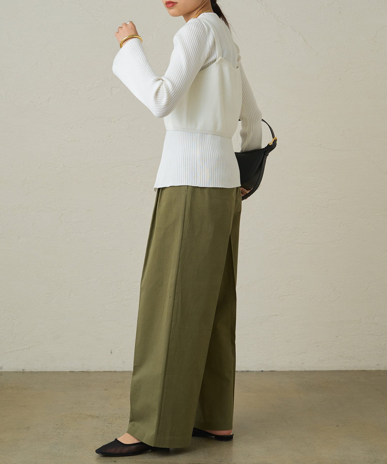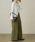 ビスチェのような女性らしさを強調するアイテムには、ハンサムなボトムやシャープな素材感をコーディネートにミックスする事でバランスのとれたスタイリングに仕上がります。