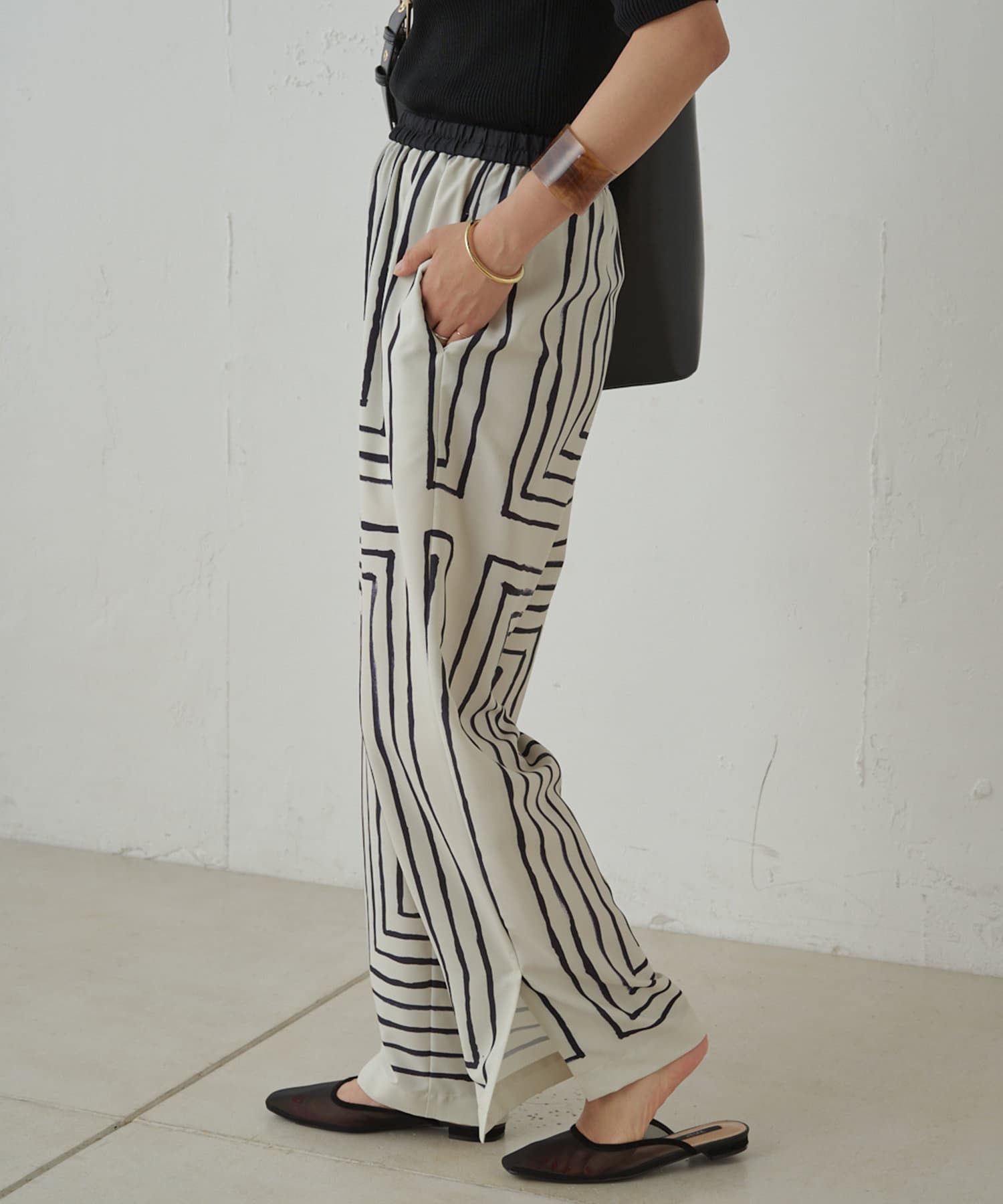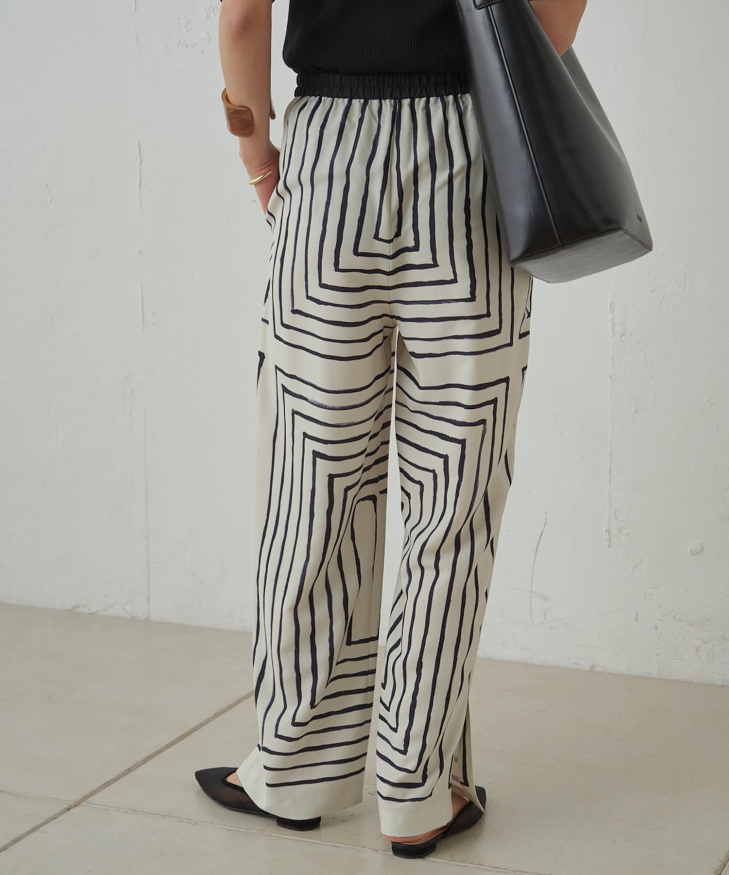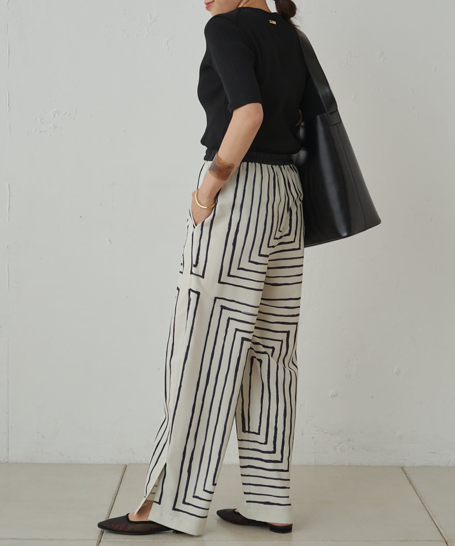 ウエストゴム仕様のイージーなシルエットに今年らしく裾にベンツ仕様のスリットを施しています。