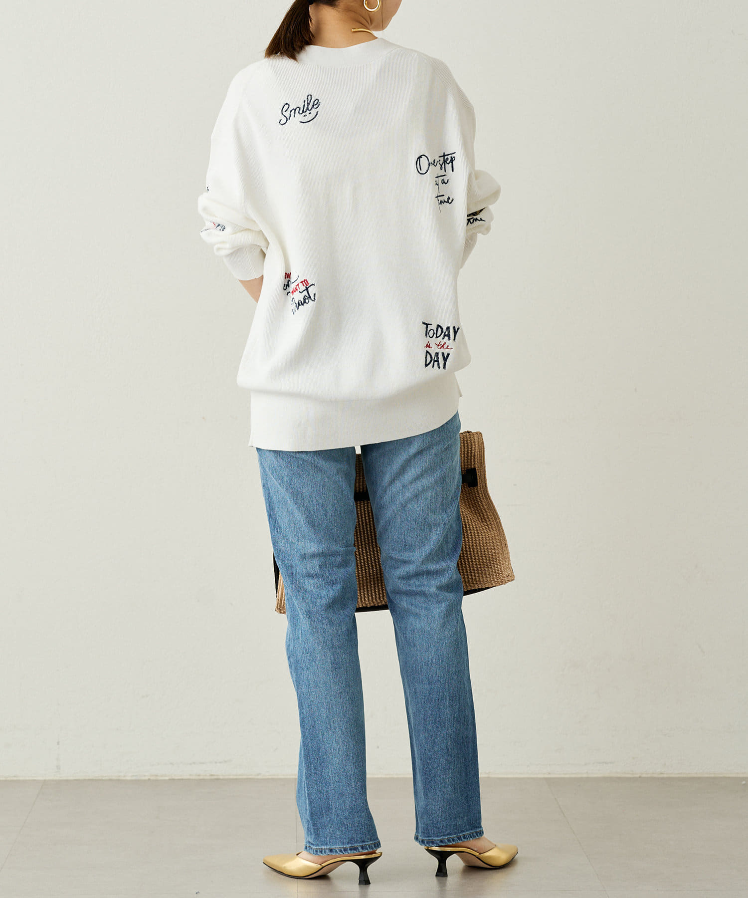 ニットやスウェットなど、幅広いトップスと合わせやすいデザインです。
