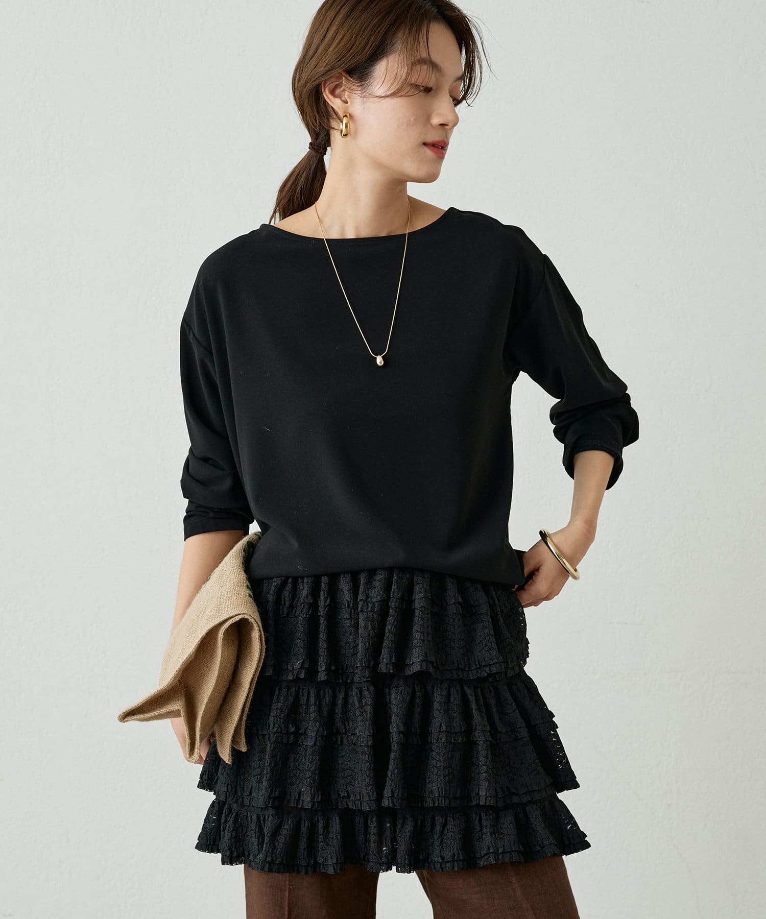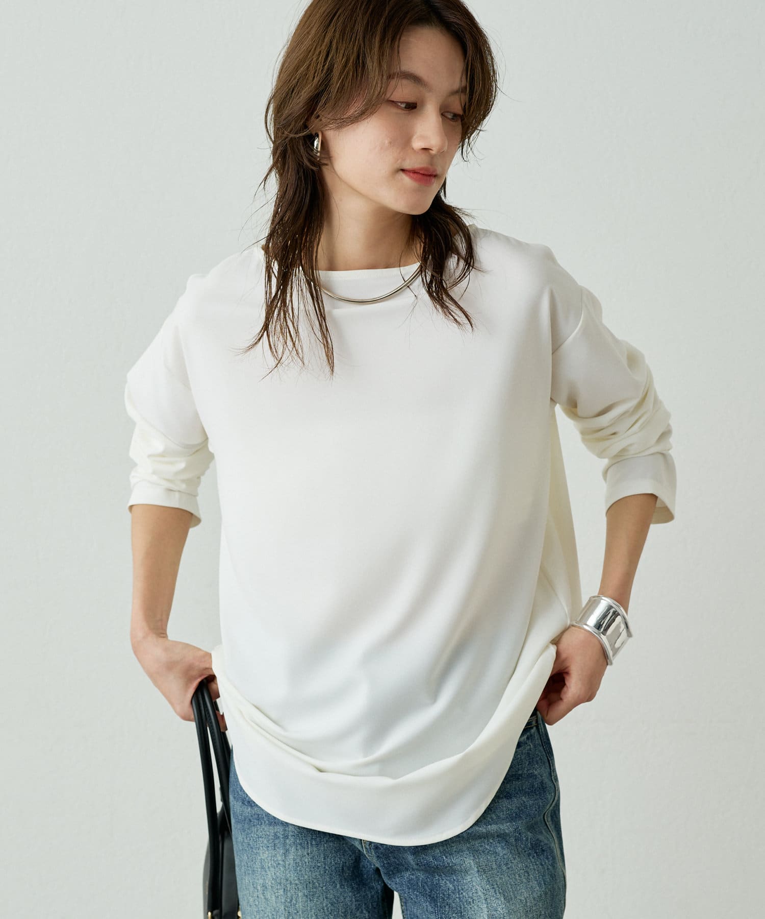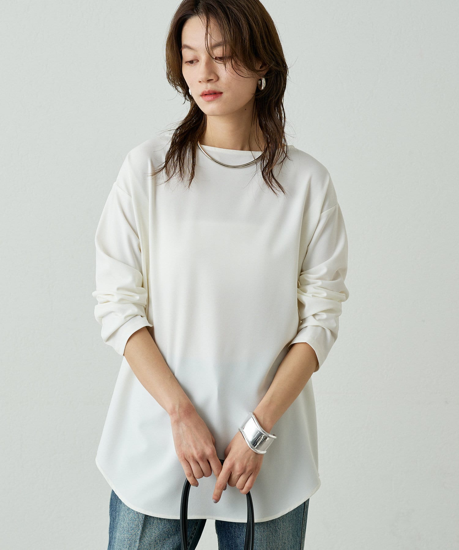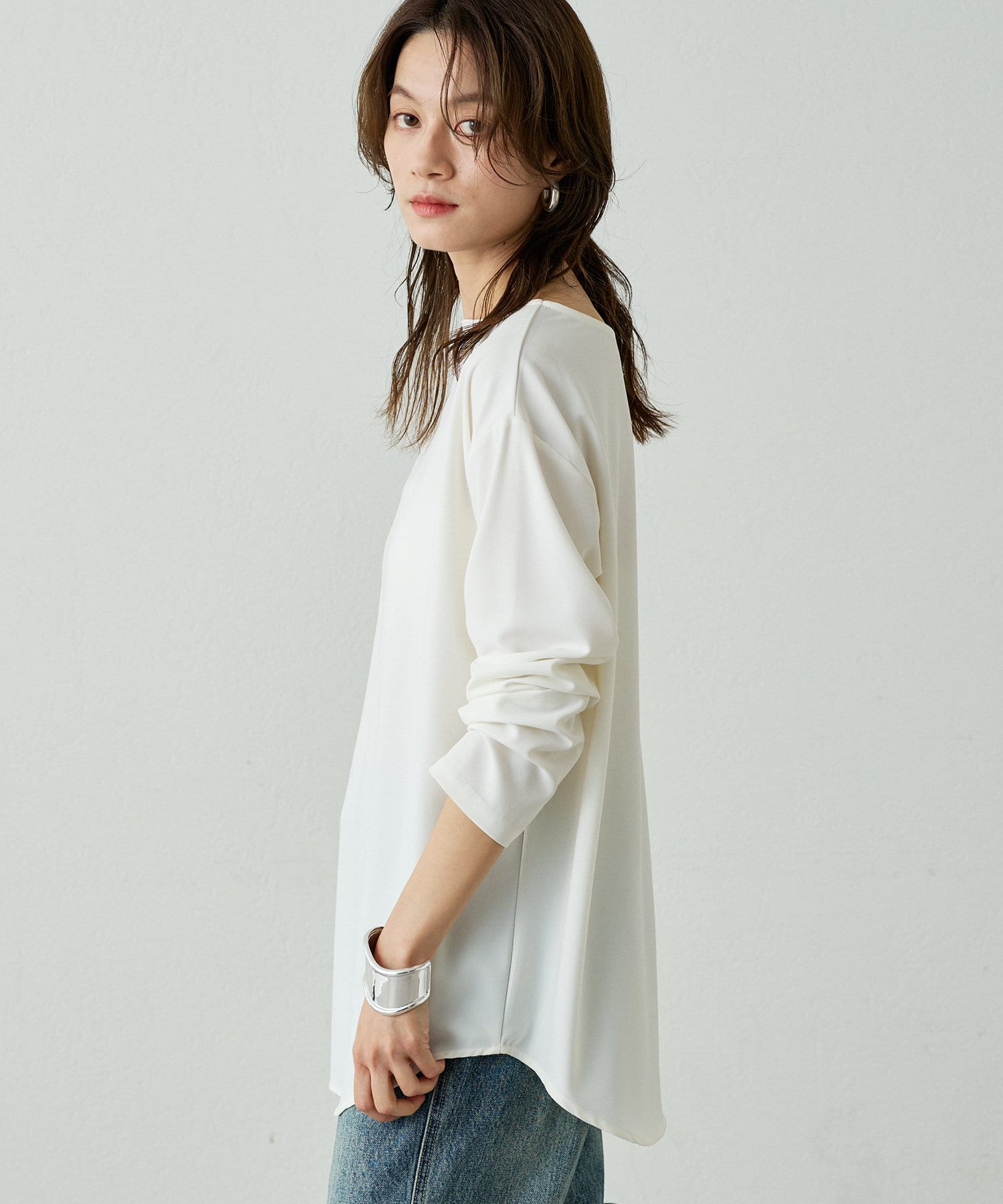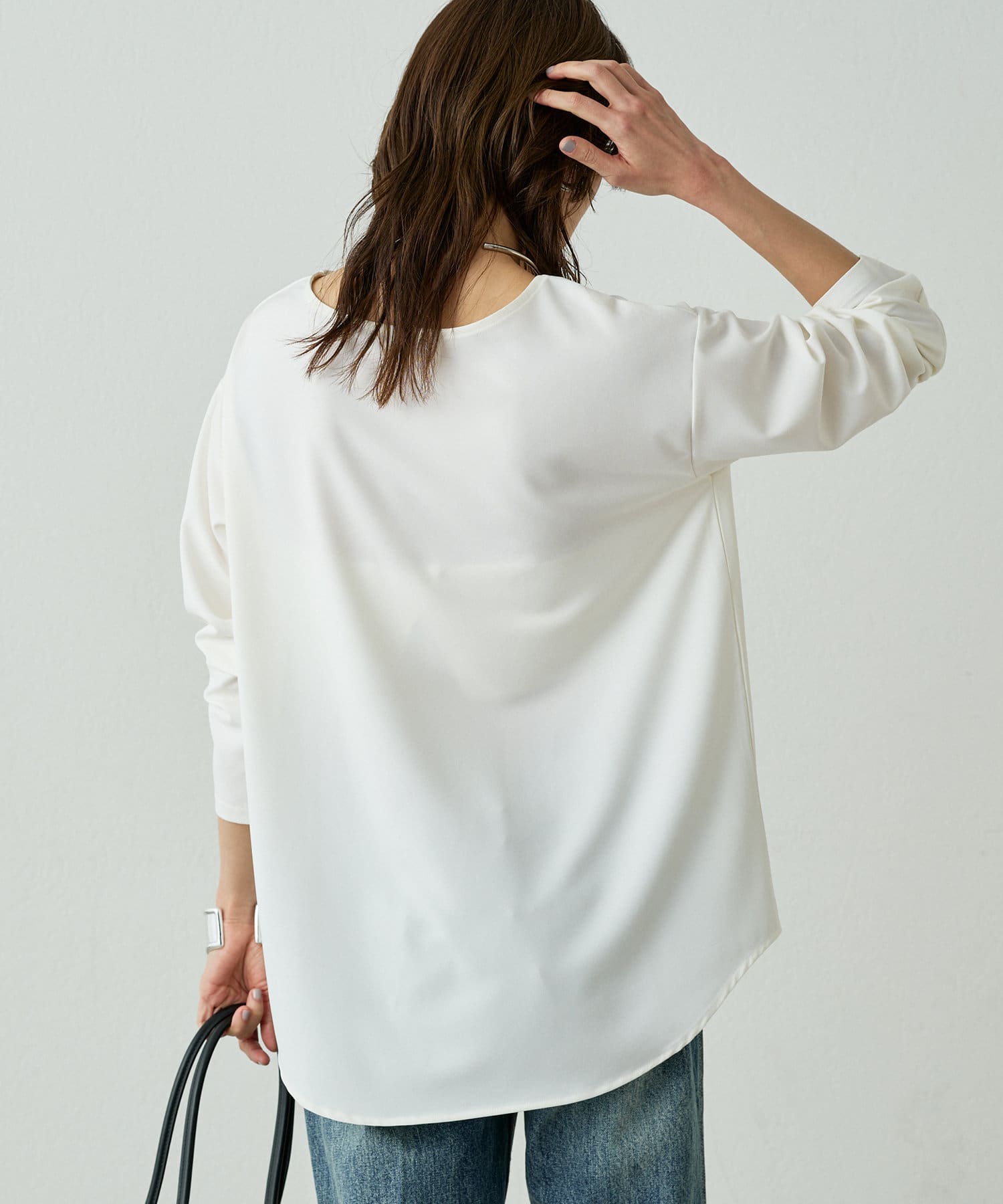 ほどよい首の開きと裾のカーブシルエットがシンプルながらも拘りのあるデザイン。