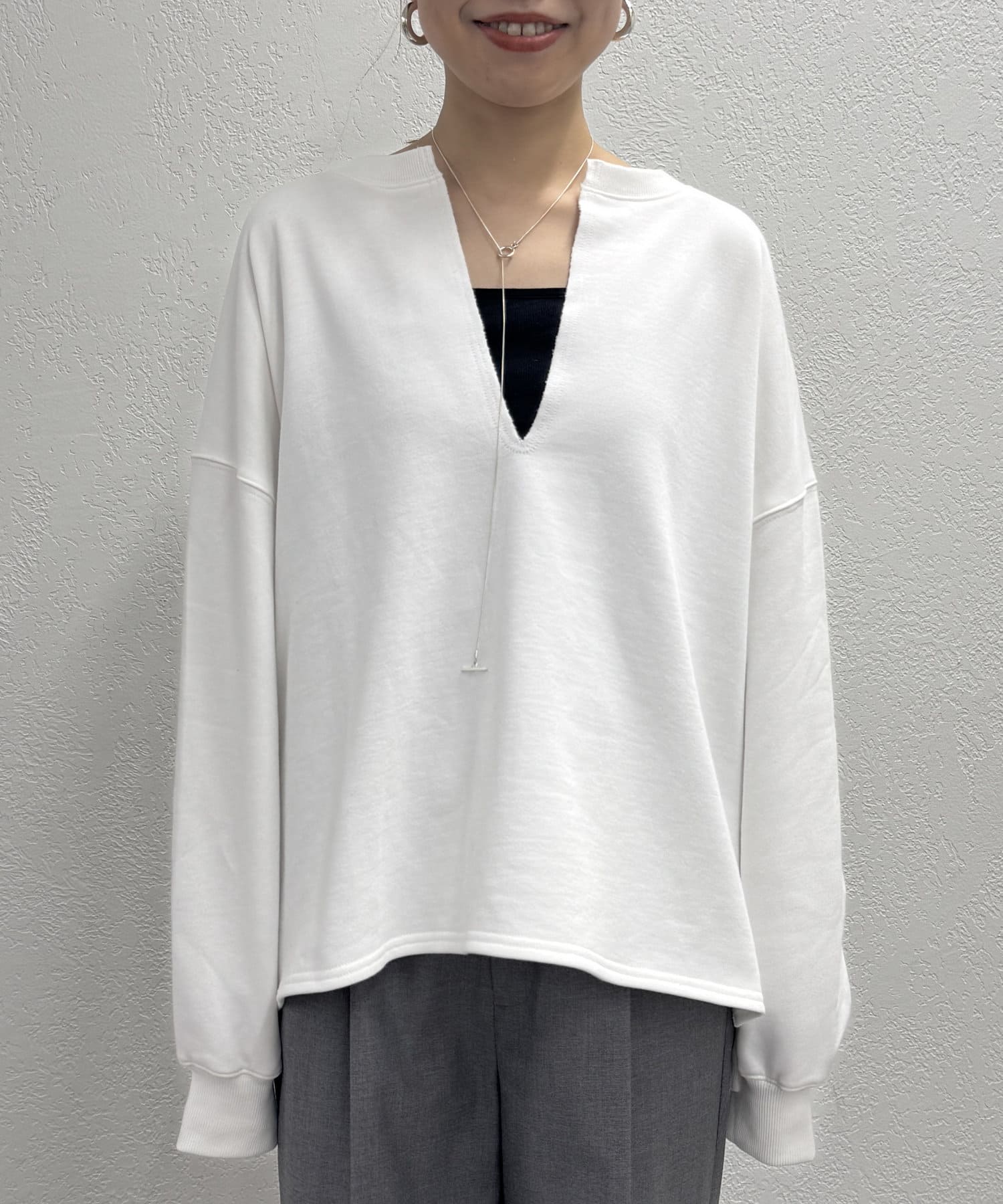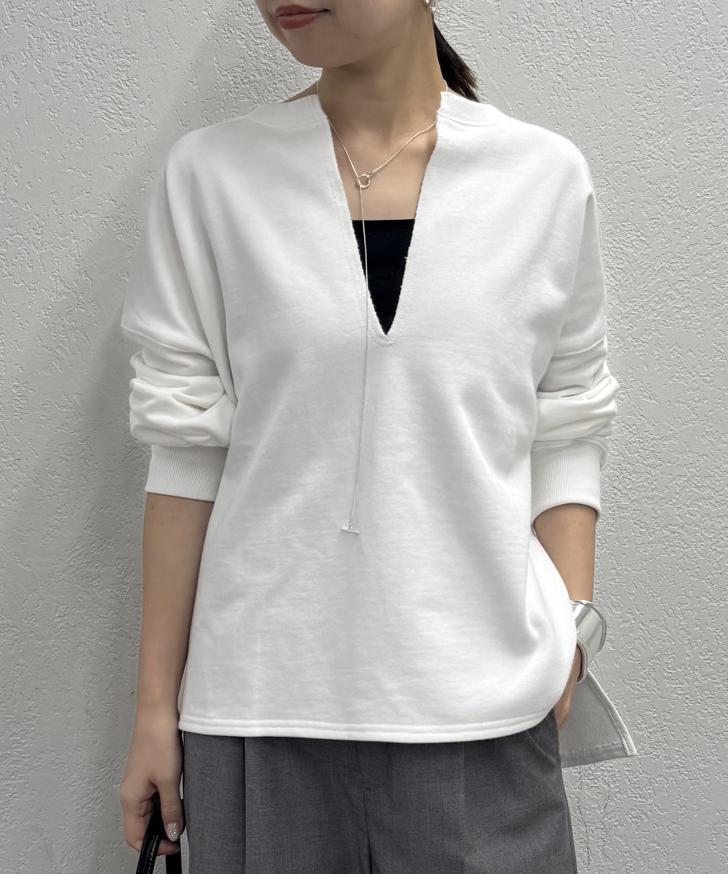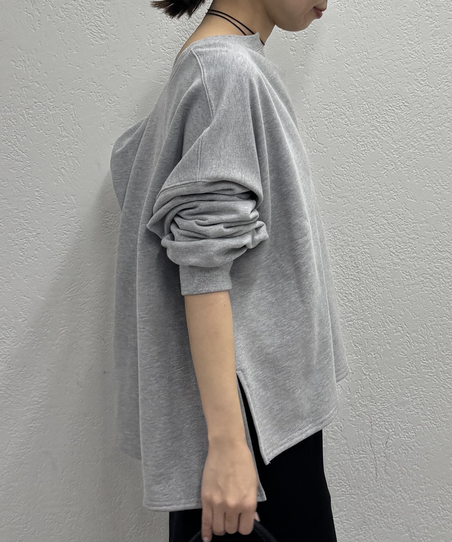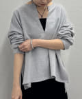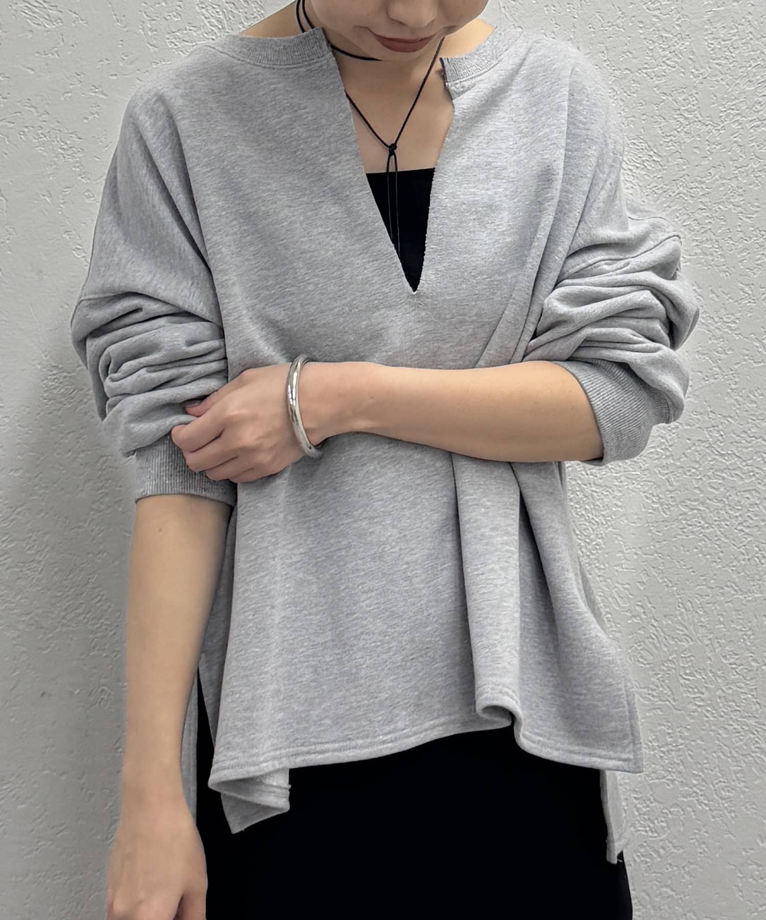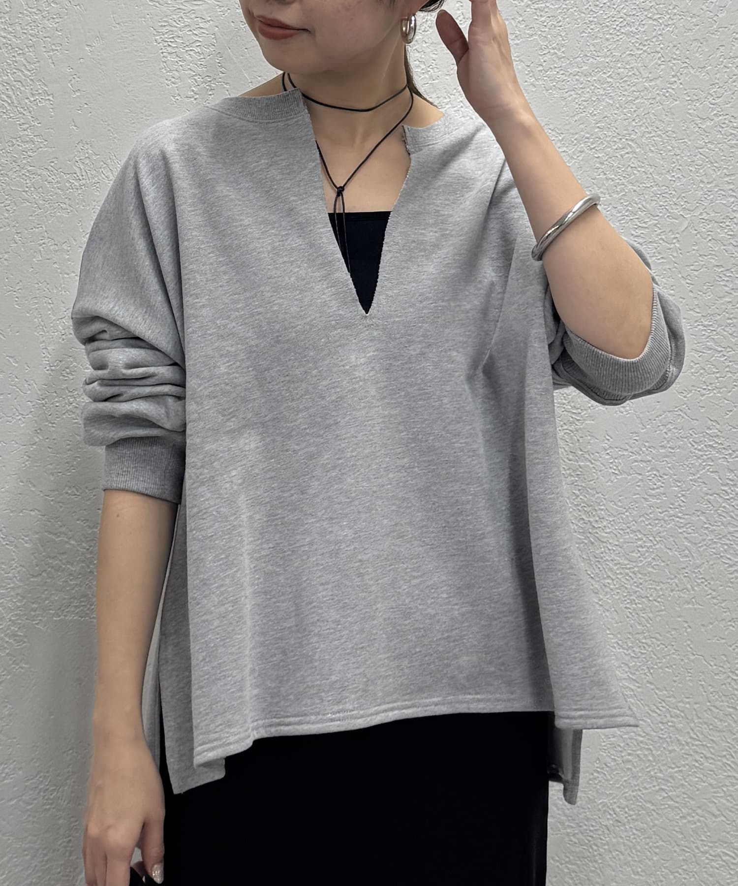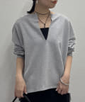 深めのスキッパーデザインで顔回りに抜け感が出るスウェット。