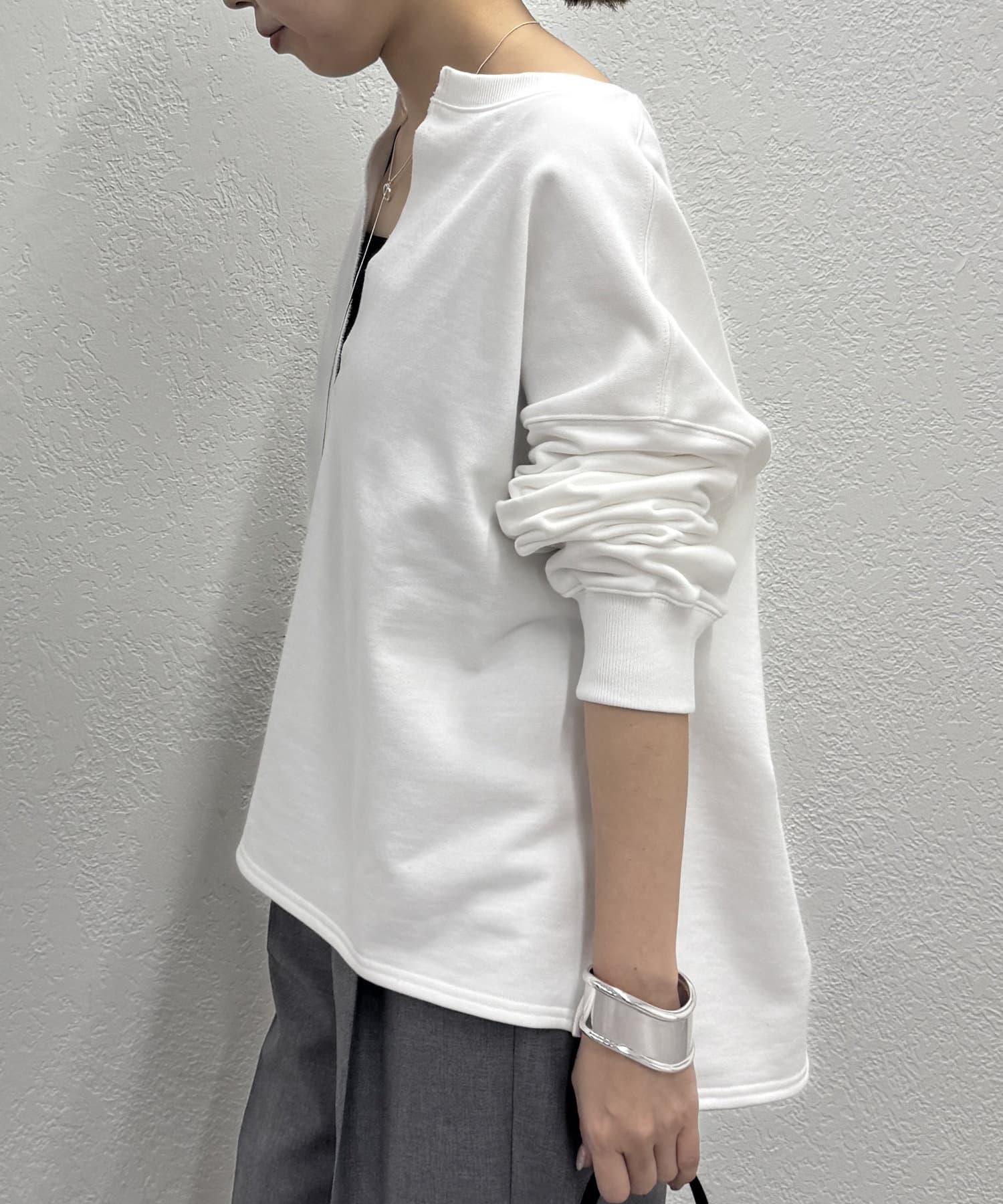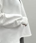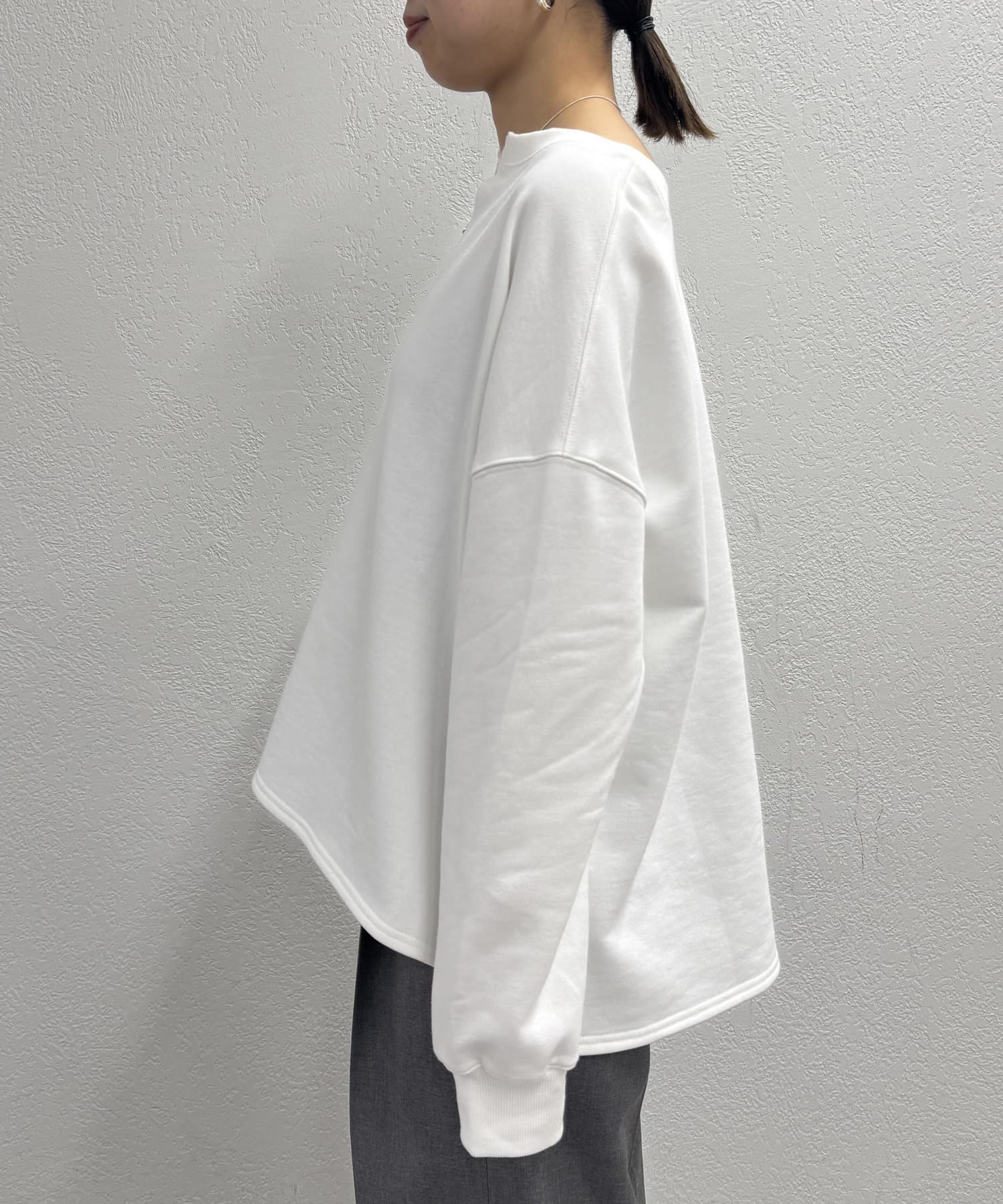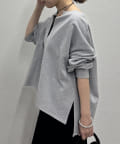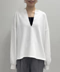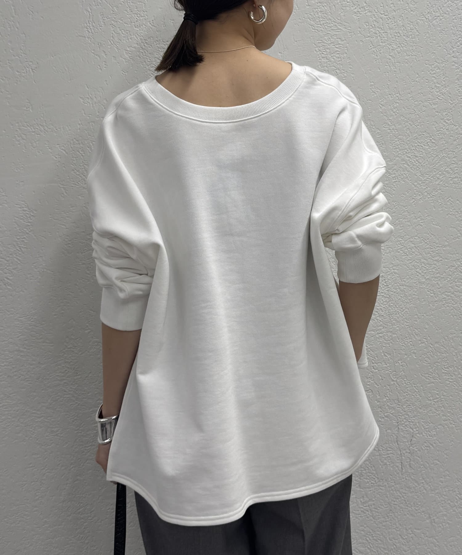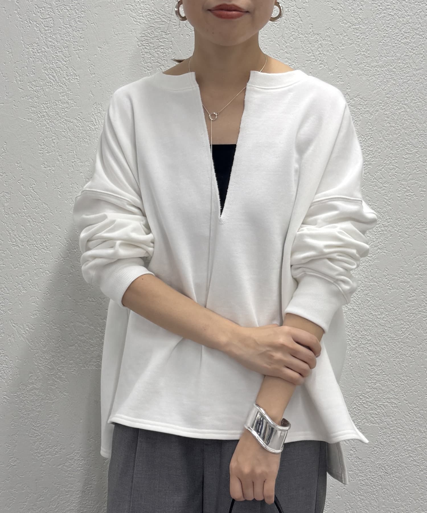深めのスキッパーデザインで顔回りに抜け感が出るスウェット。