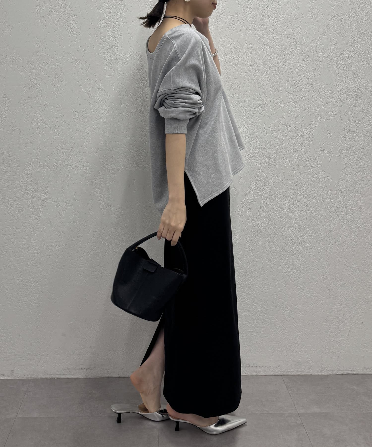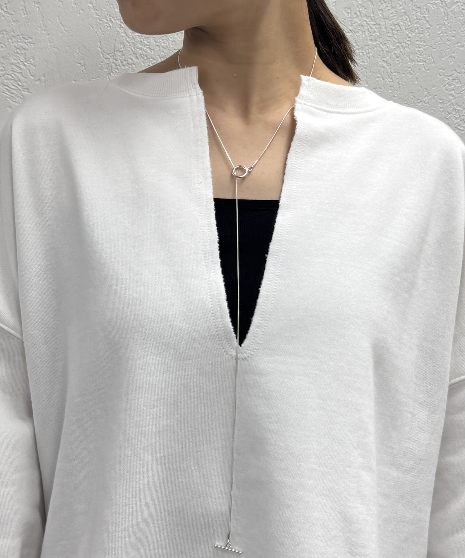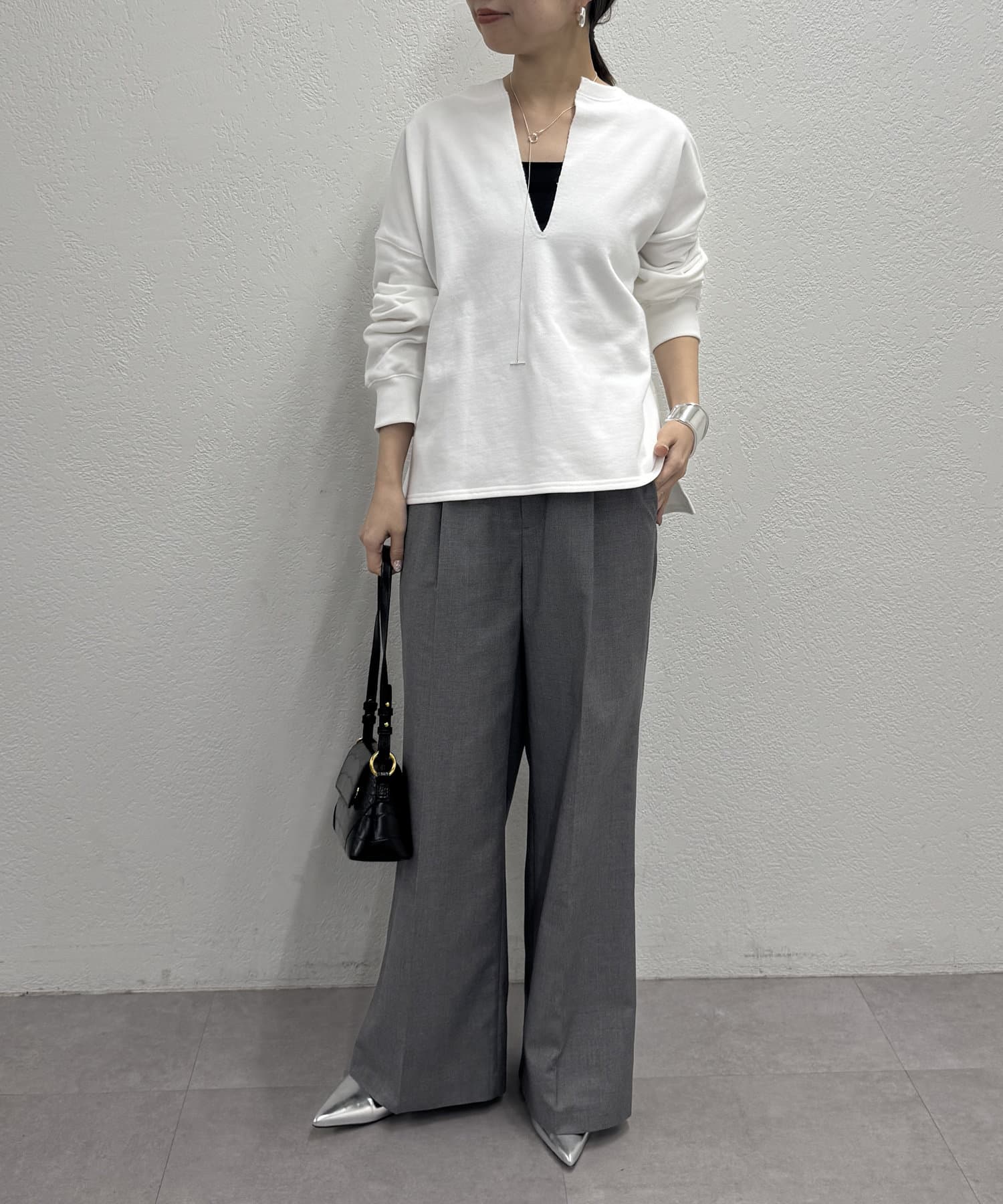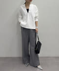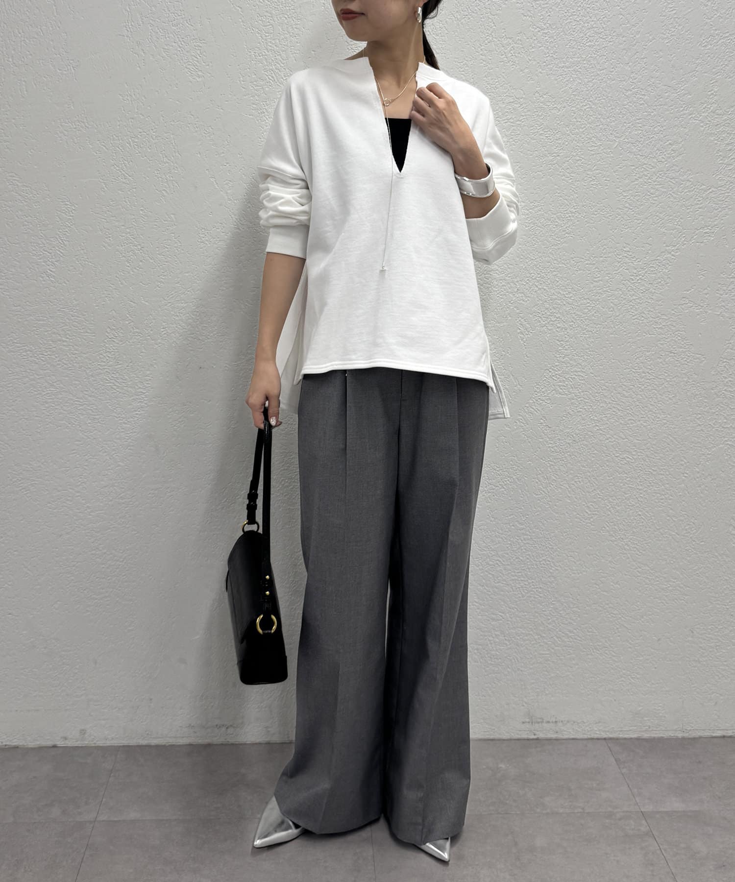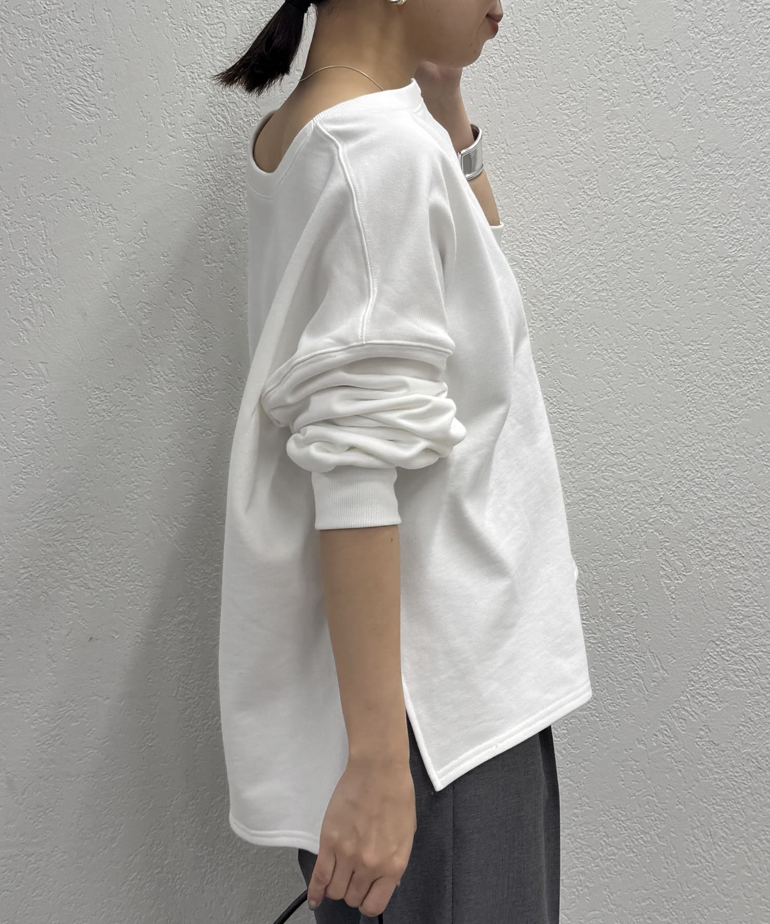 深めのスキッパーデザインで顔回りに抜け感が出るスウェット。
