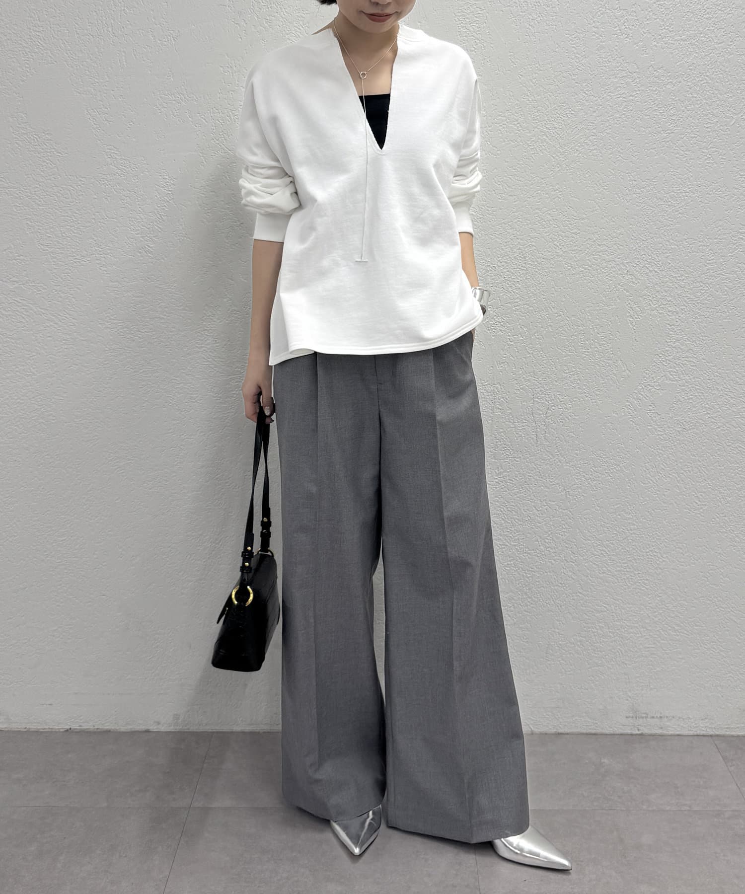 インナーにタンクトップやカットソーなど、レイヤードも楽しめます。