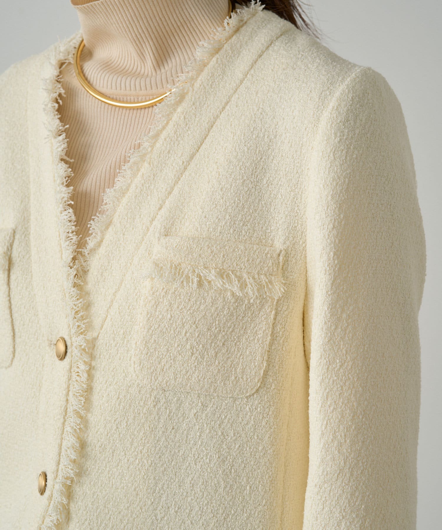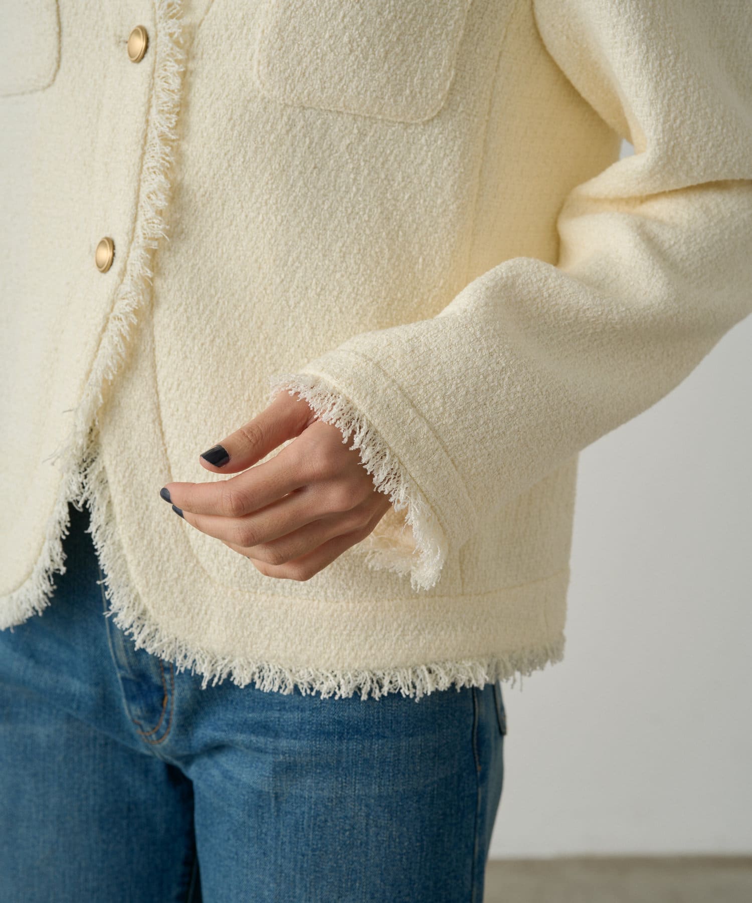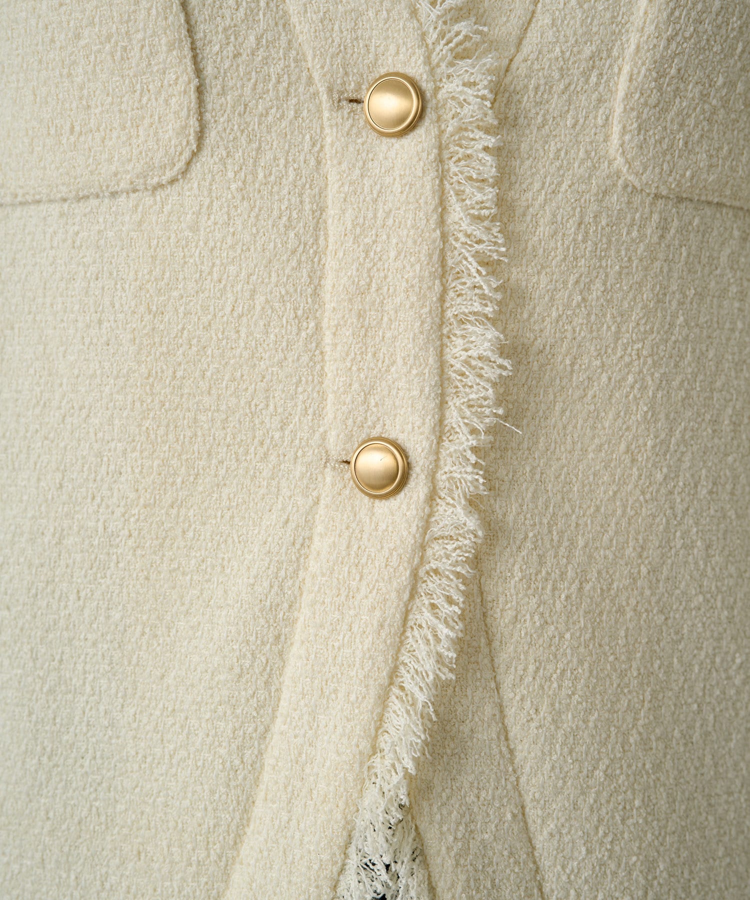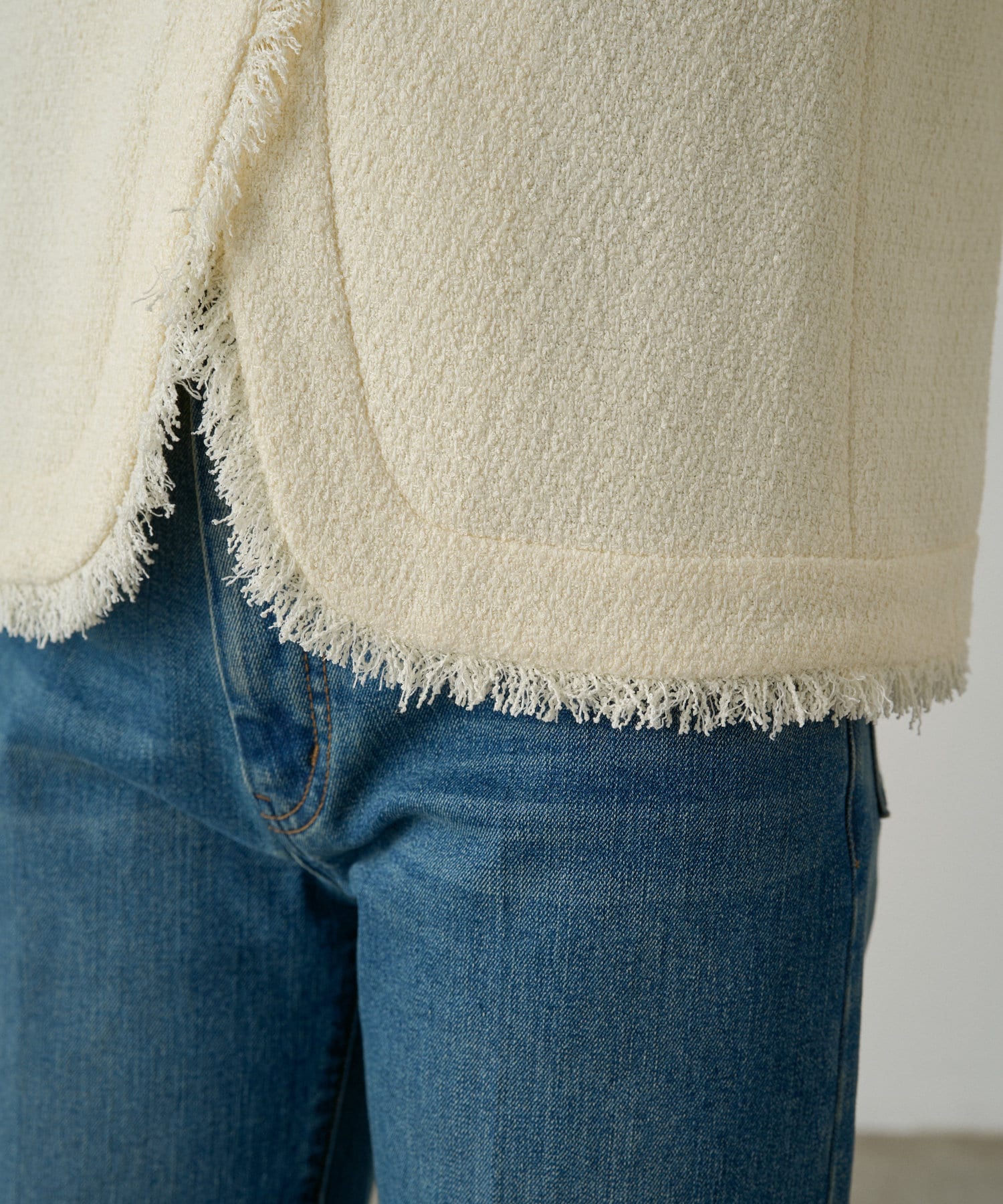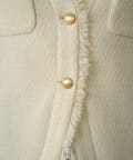 ポケットや袖口、前立て部分にフリンジ仕立てになっており、ゴールドボタンで華やかな印象に。