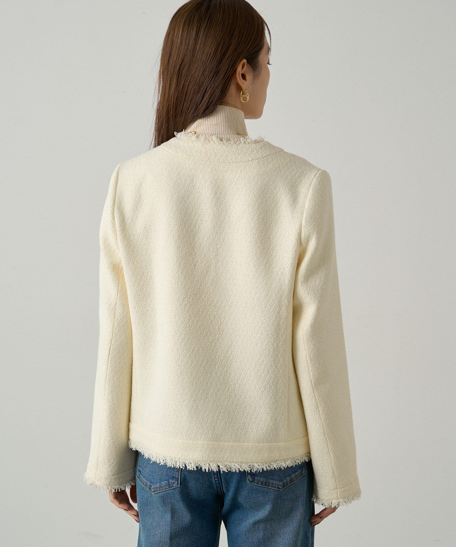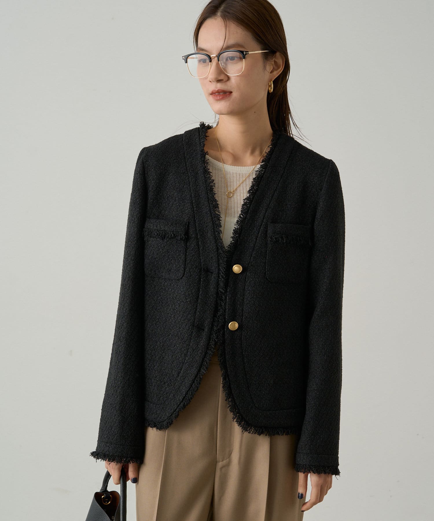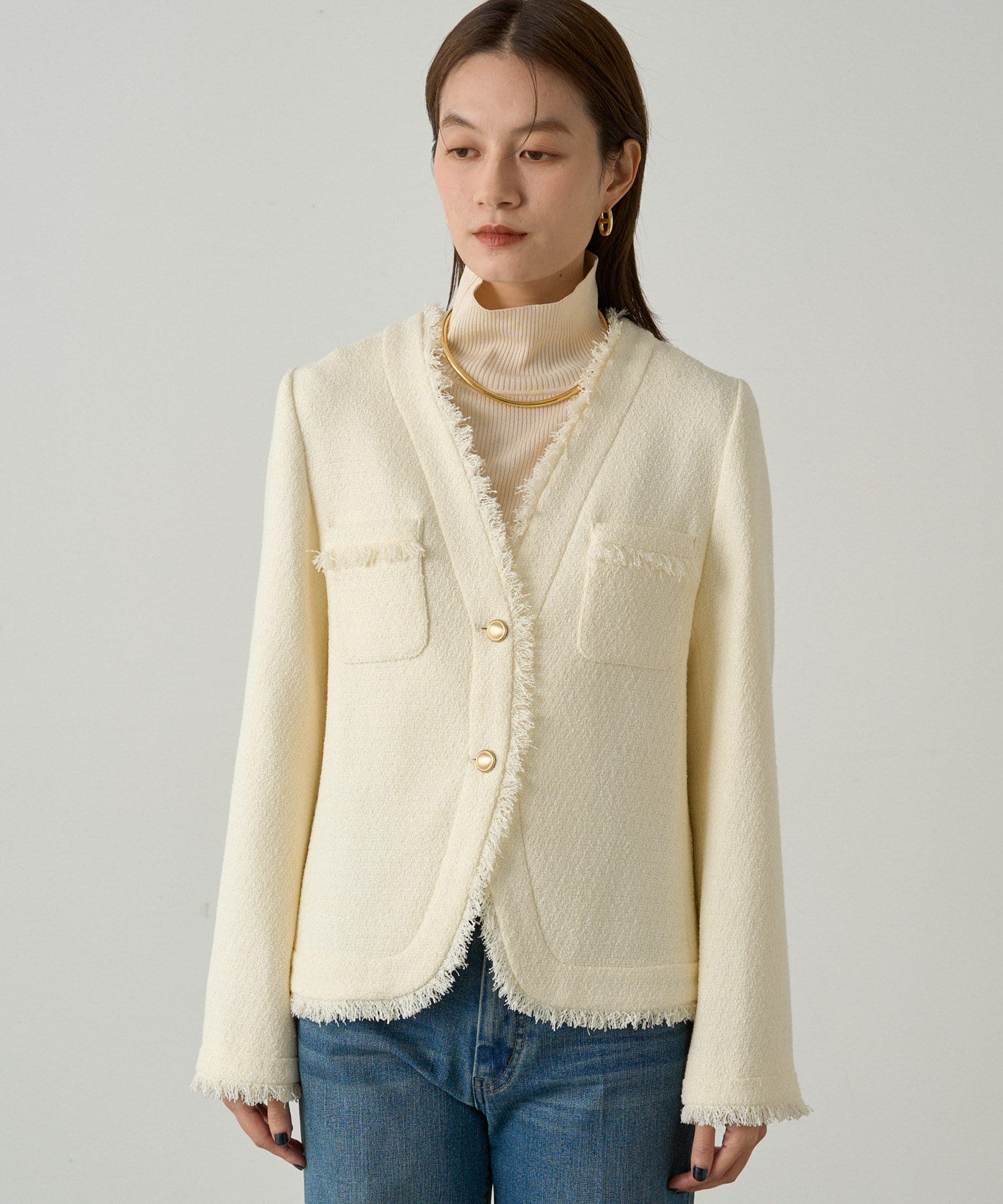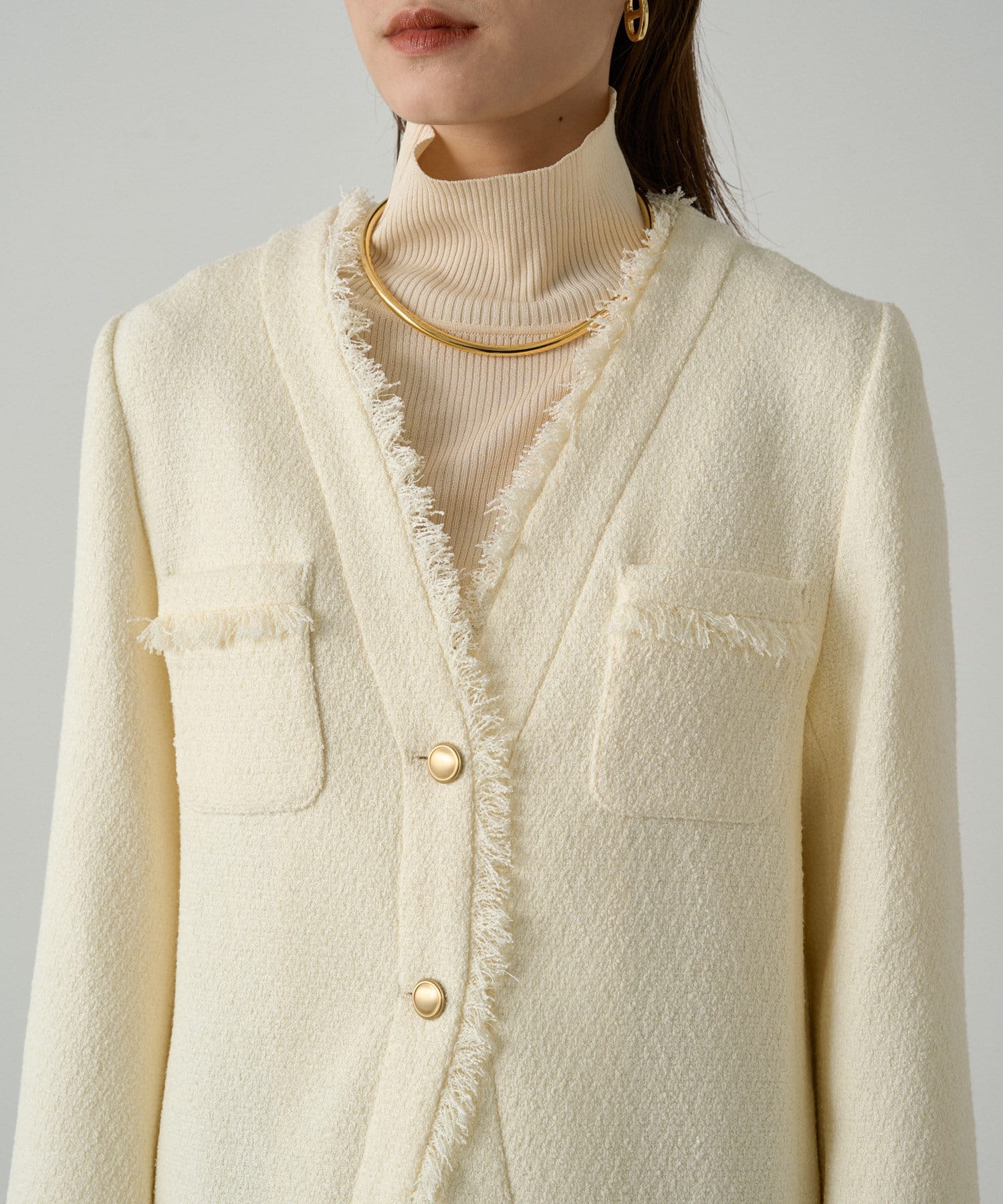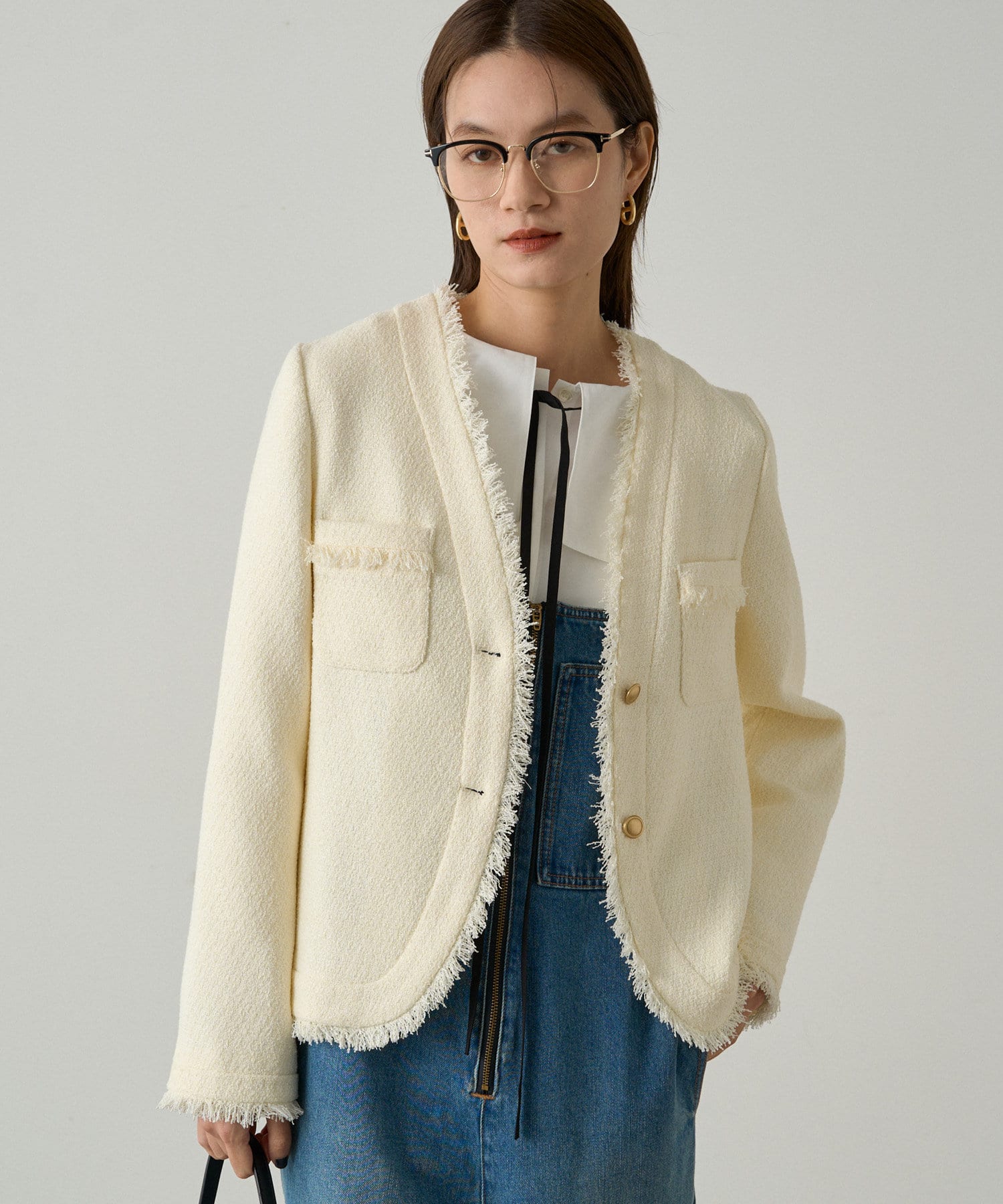 ポケットや袖口、前立て部分にフリンジ仕立てになっており、ゴールドボタンで華やかな印象に。