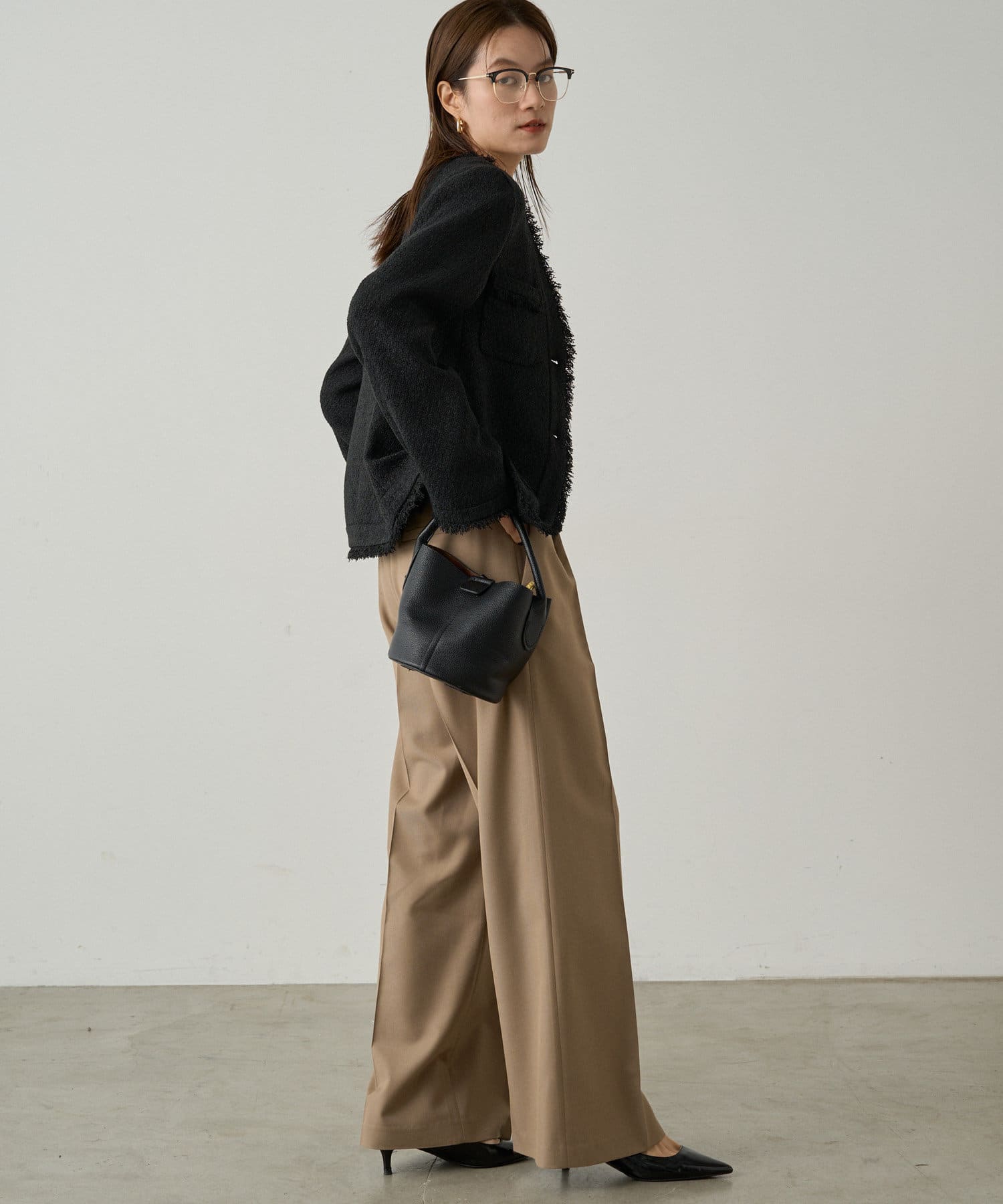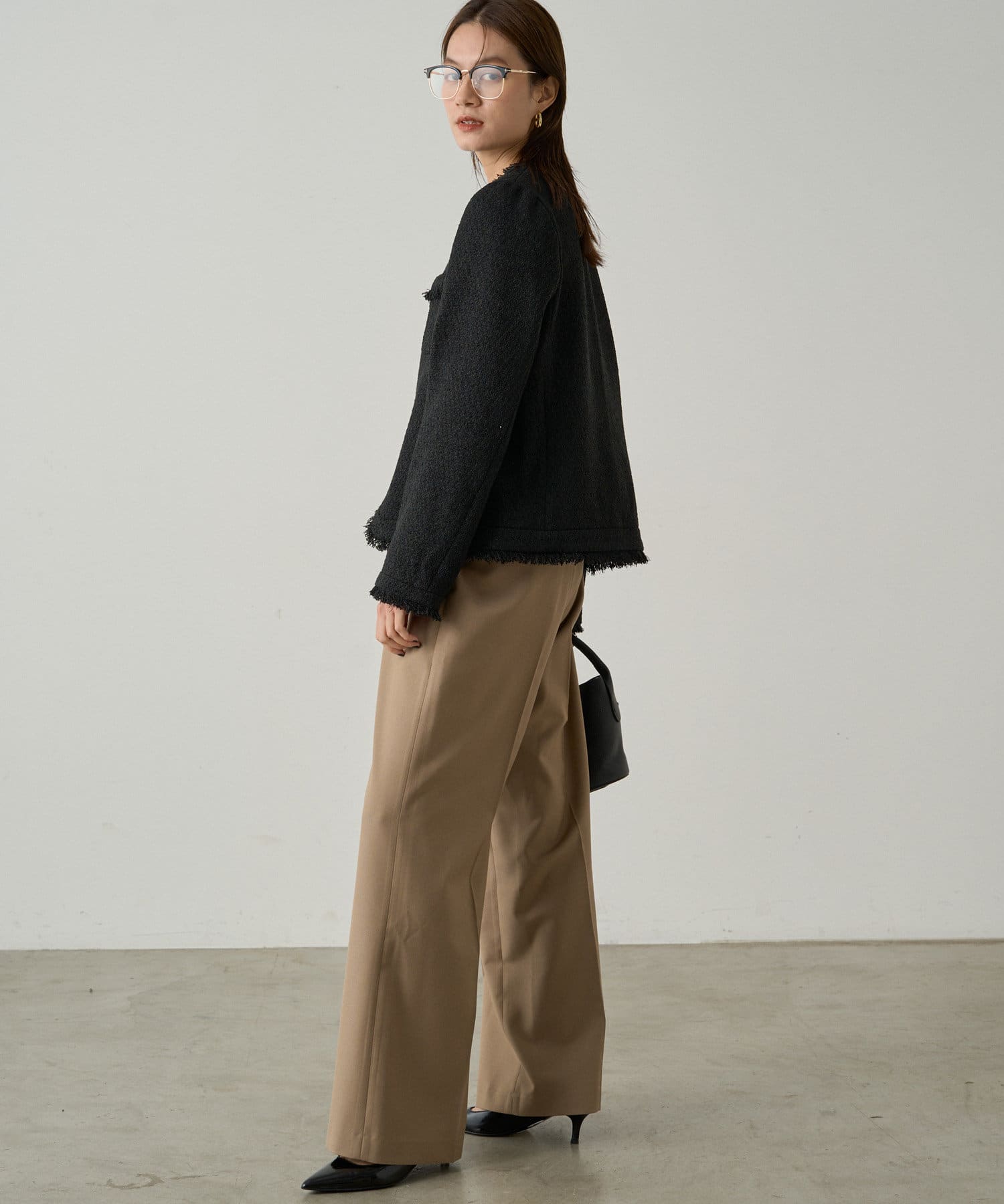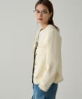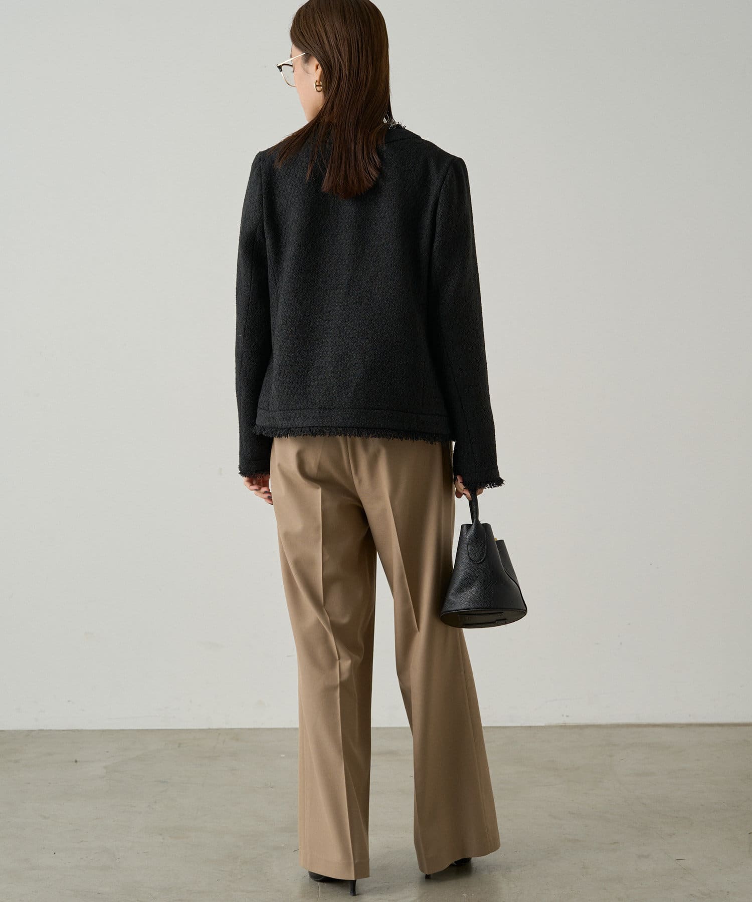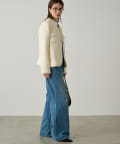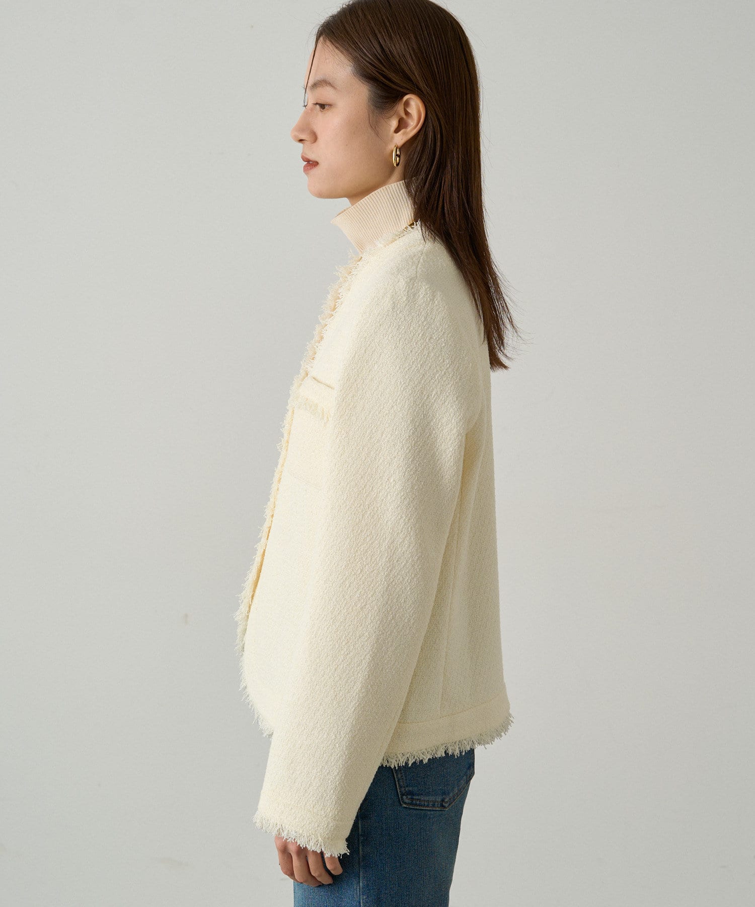 ポケットや袖口、前立て部分にフリンジ仕立てになっており、ゴールドボタンで華やかな印象に。