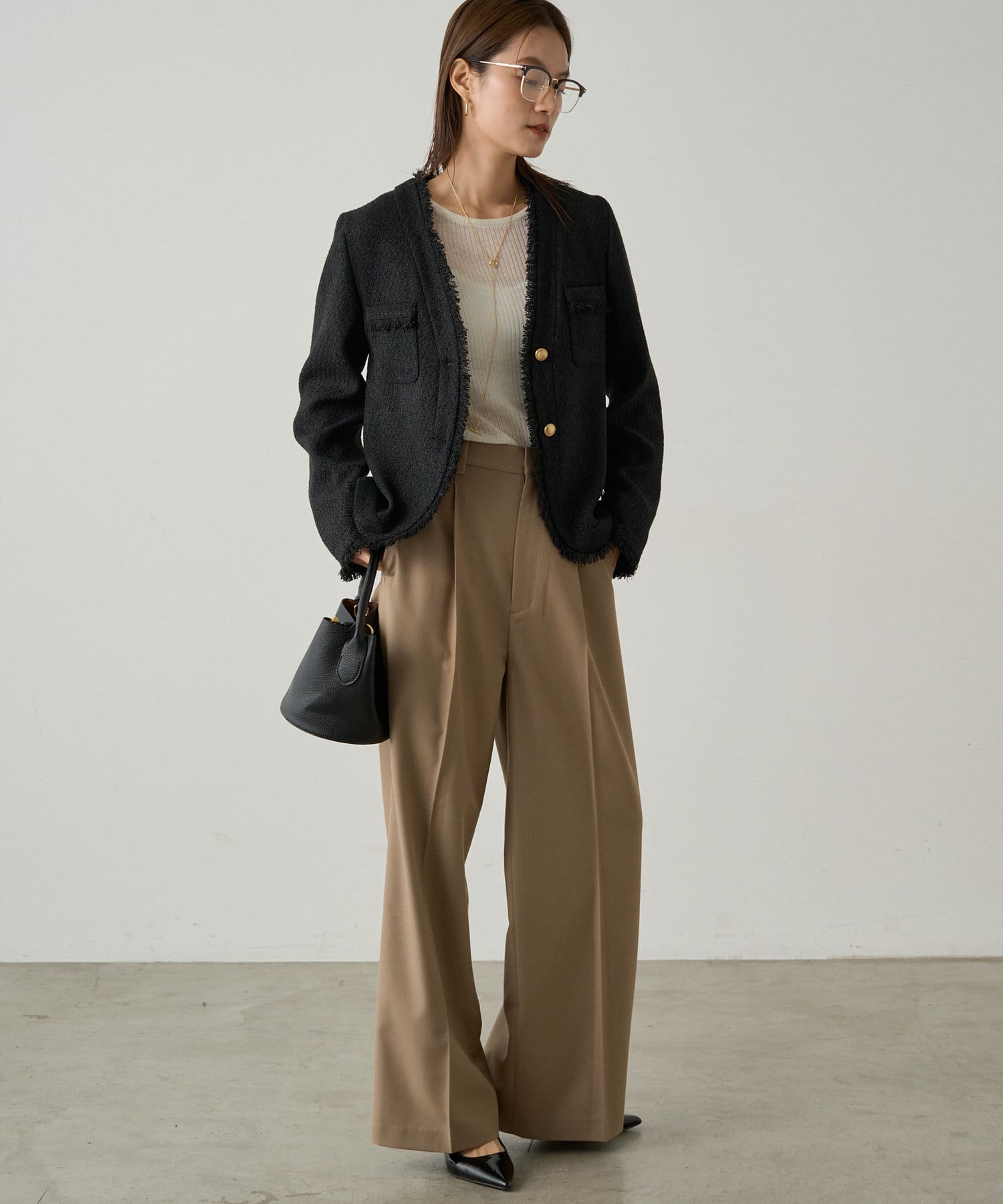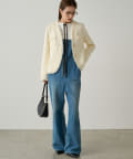 きちんと感のあるツイードジャケットは、デニムオールインワンなどカジュアルなアイテムと組み合わせ