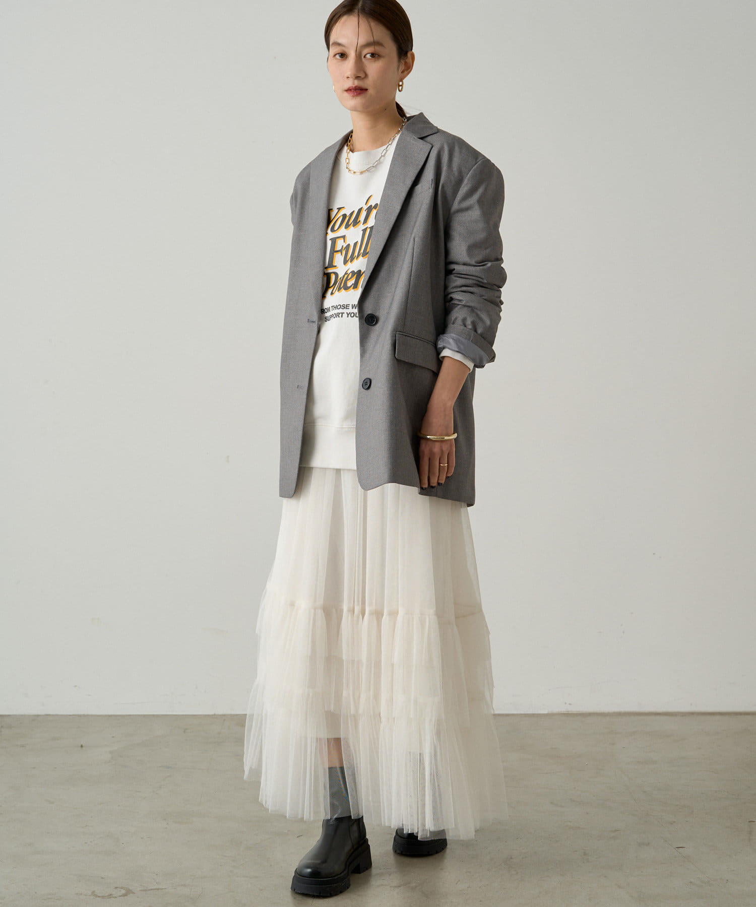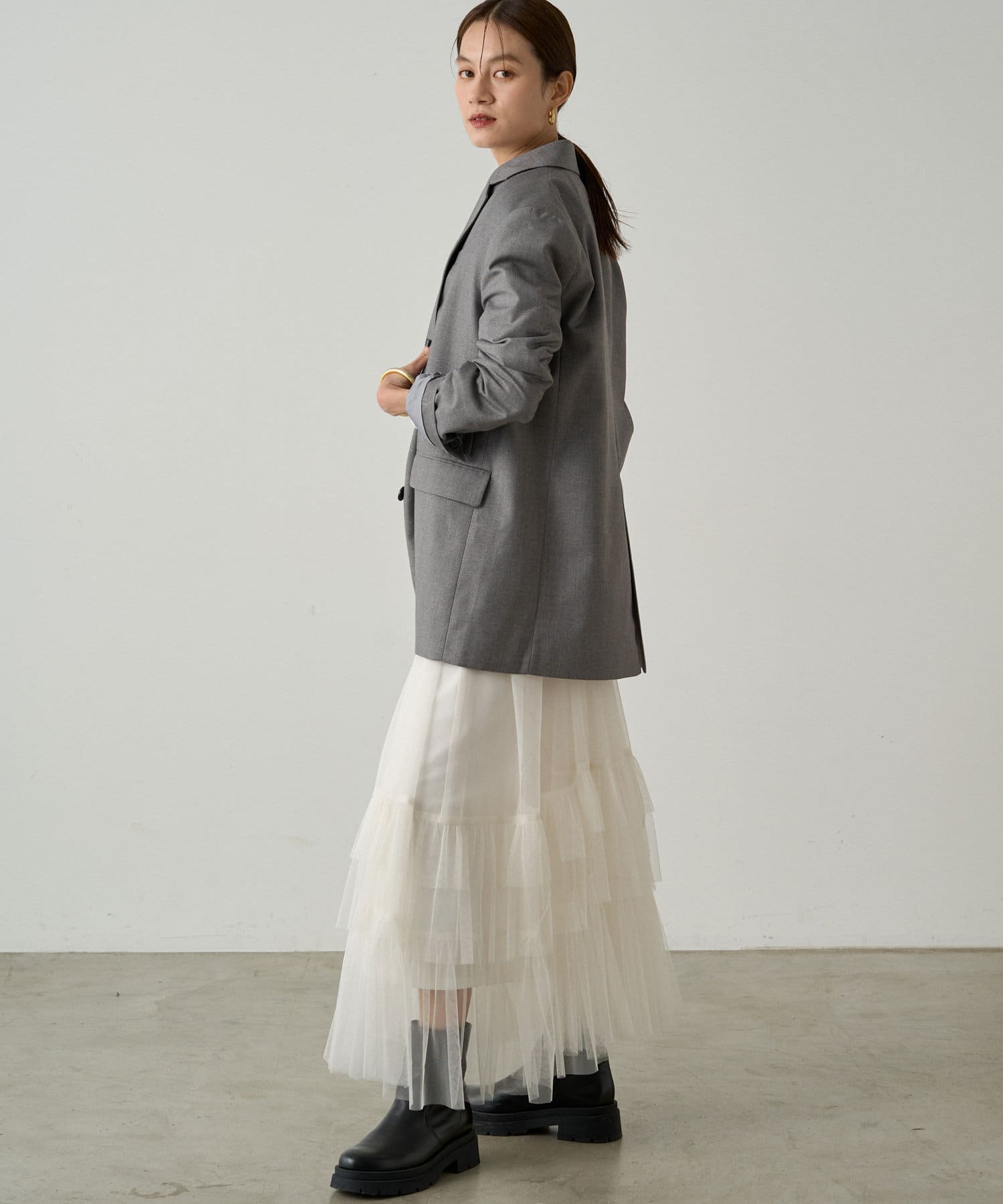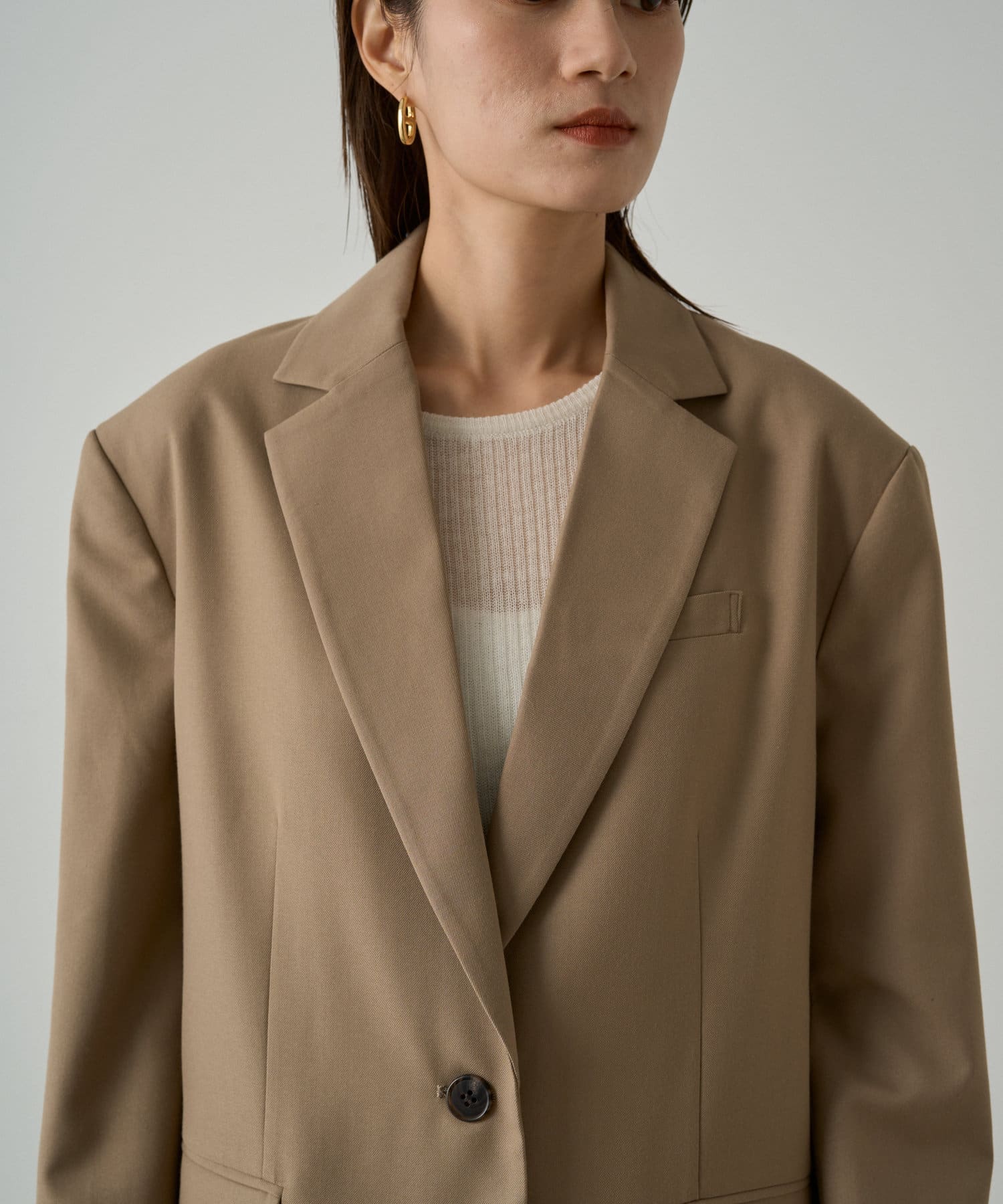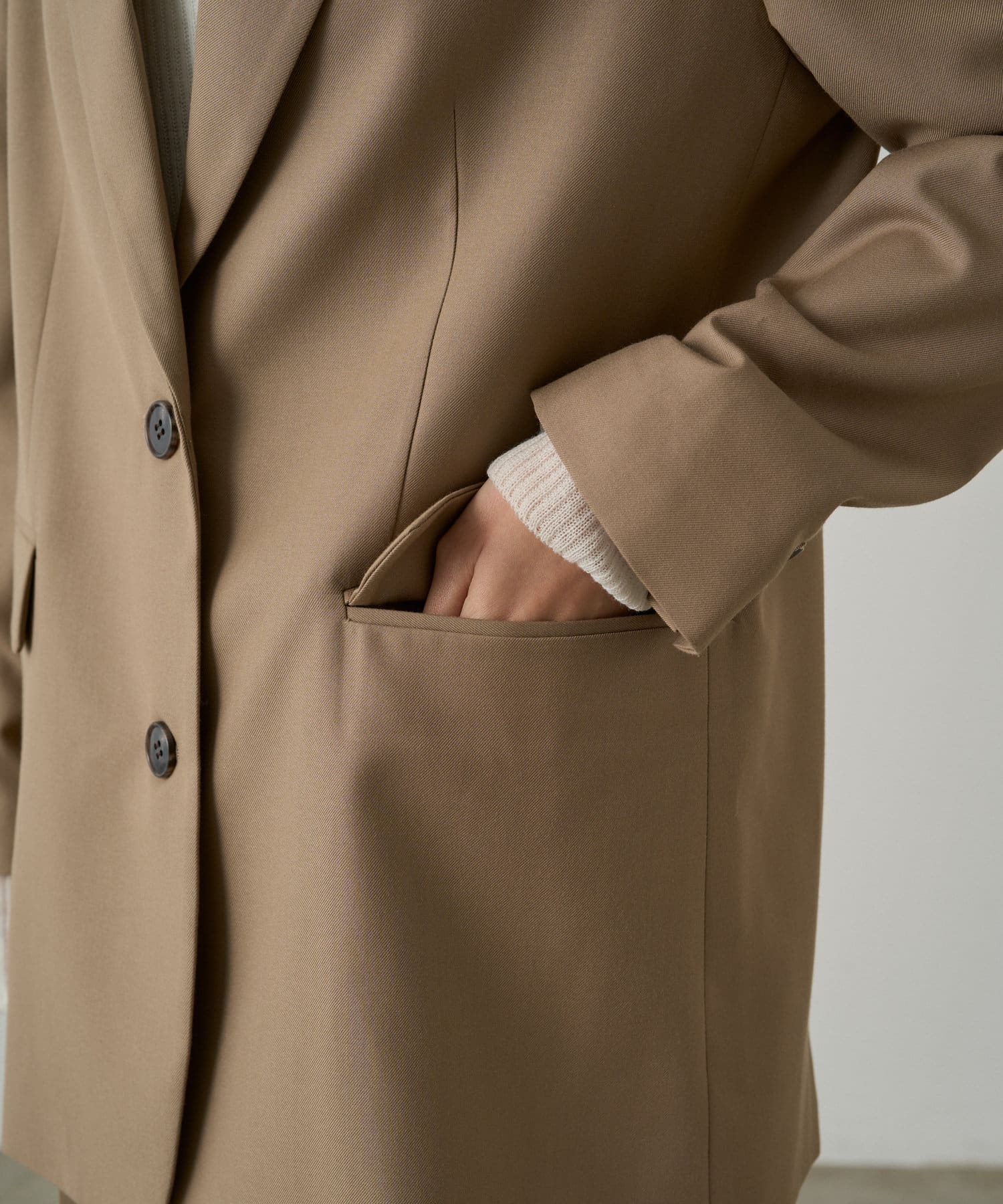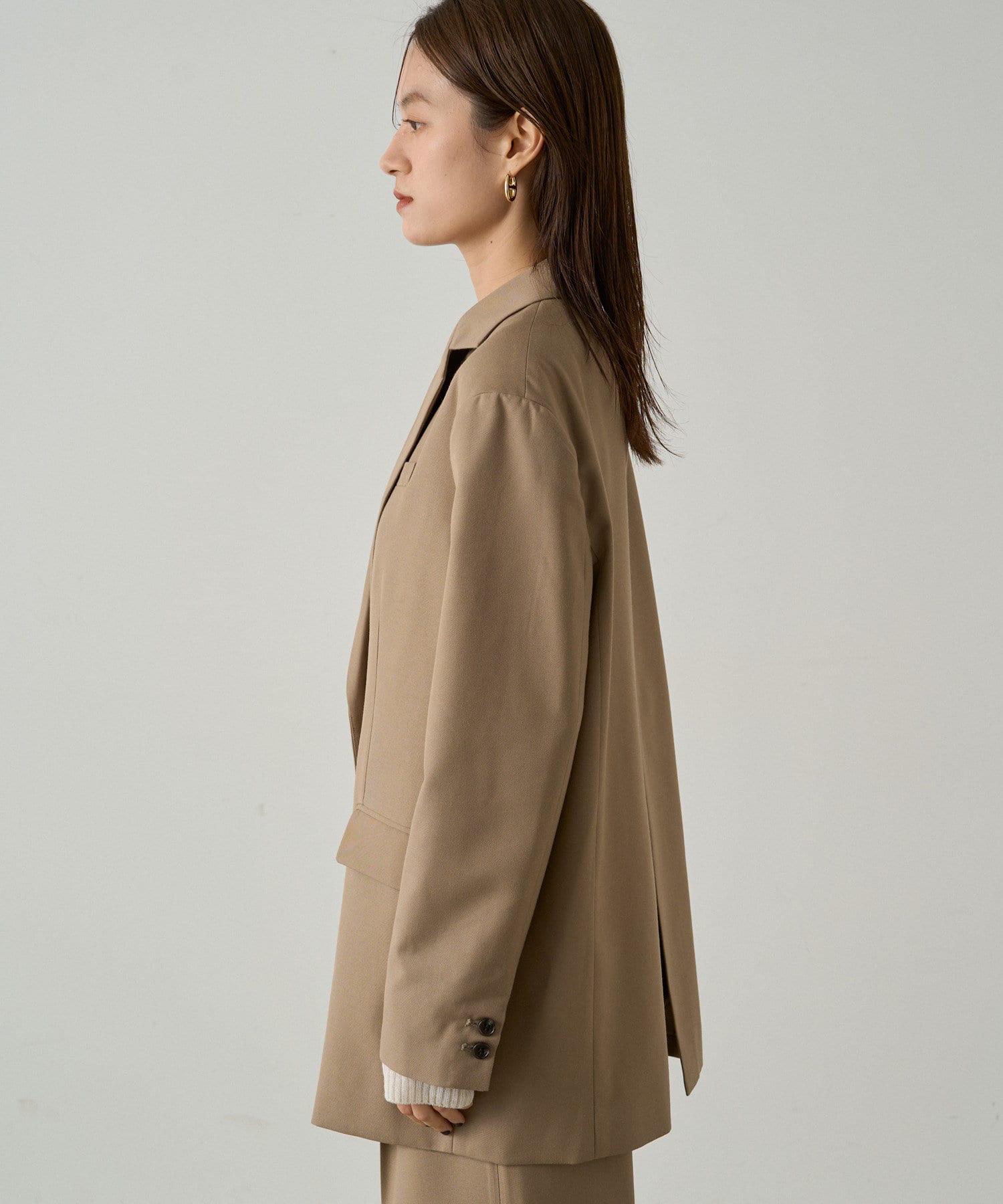 同素材のパンツと合わせたセットアップスタイルはオフィスやカジュアルな場面など様々なシーンで活躍してくれます。