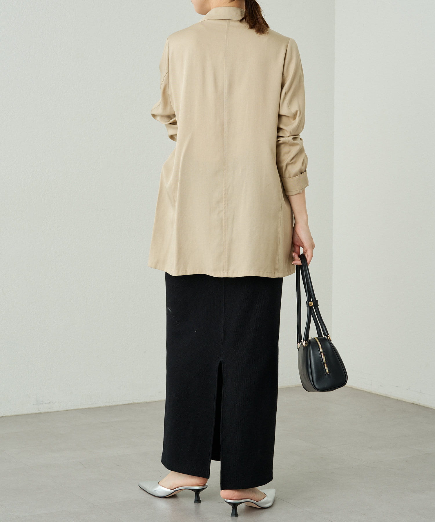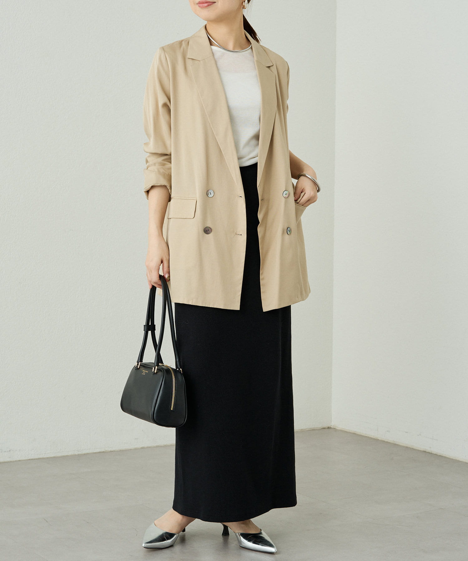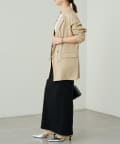 オンオフどちらにも着られるジャケットなので、オフィスにはタイトスカートやスラックススタイル、カジュアルにはデニムやロゴTなどと合わせたスタイルがおすすめ。