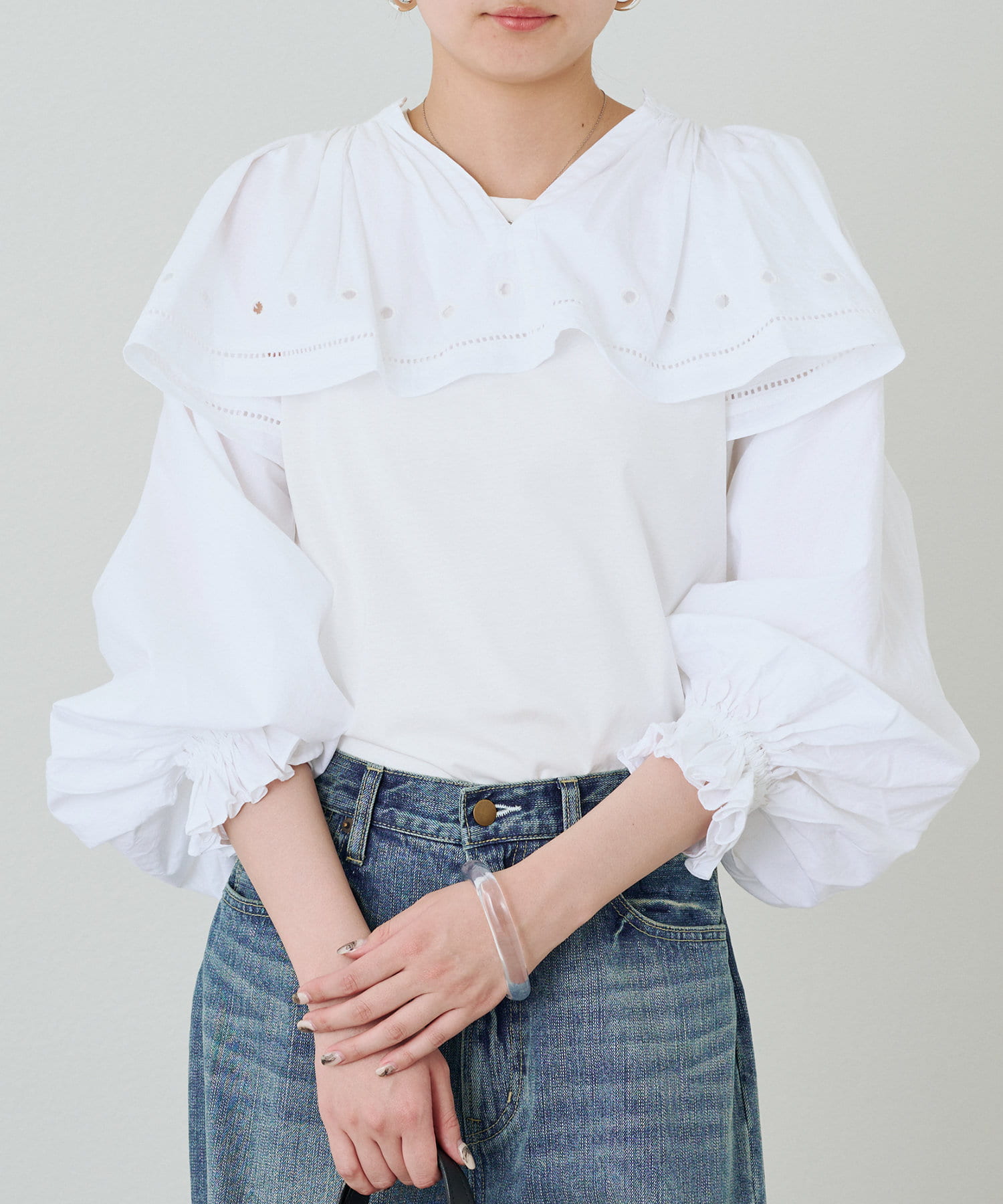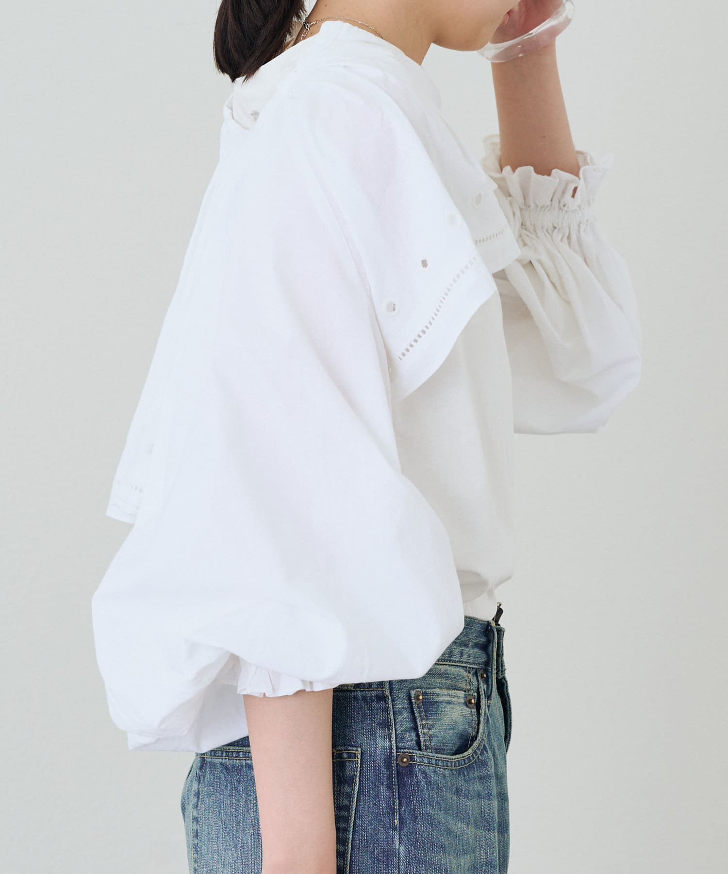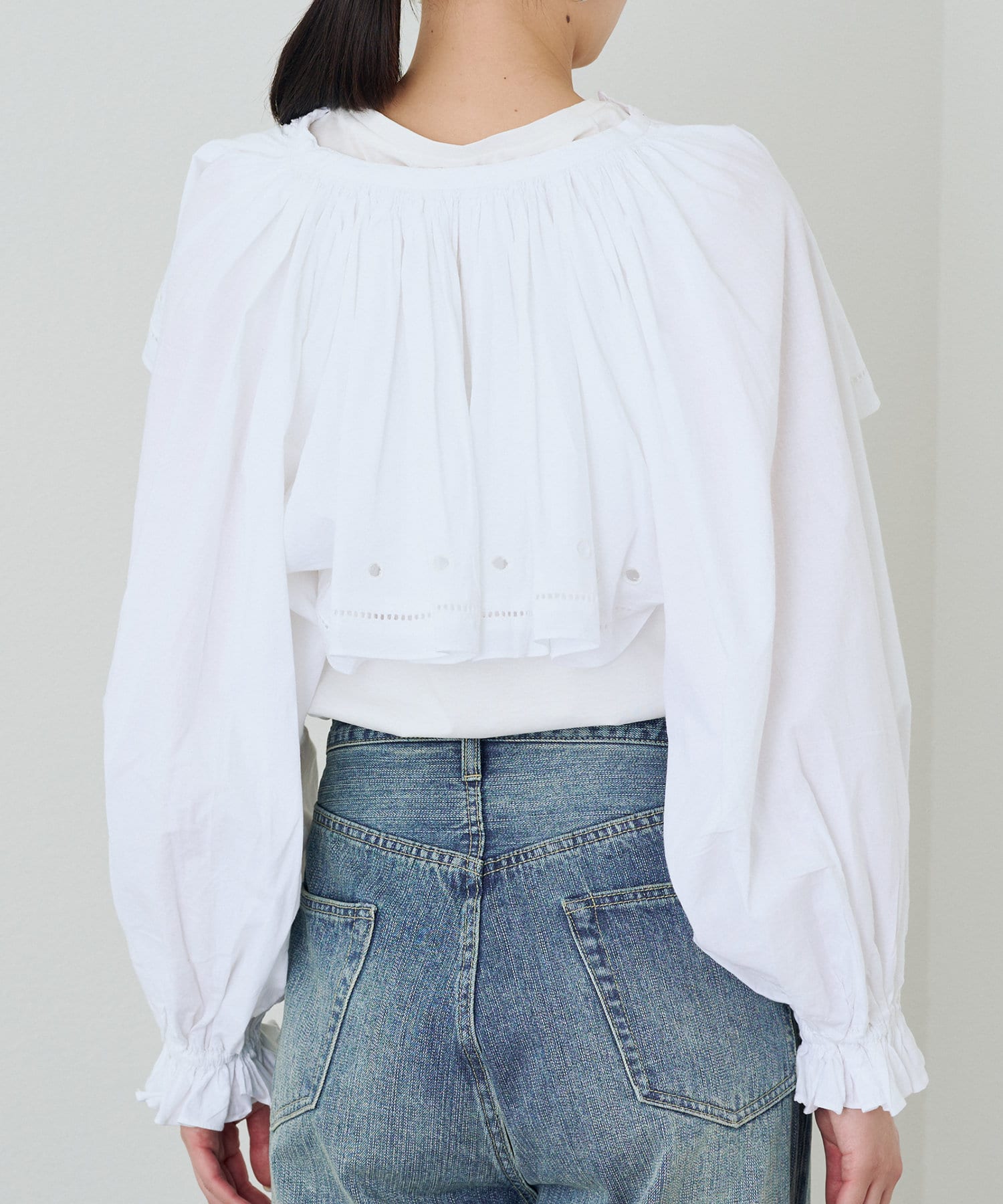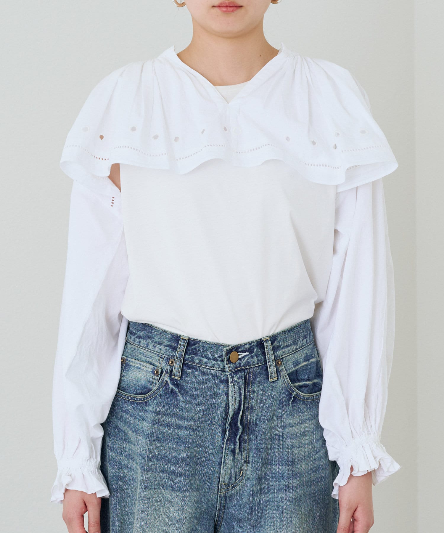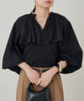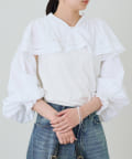 目を引く大胆なフリルと、繊細なディテールが織りなす、唯一無二のブラウス