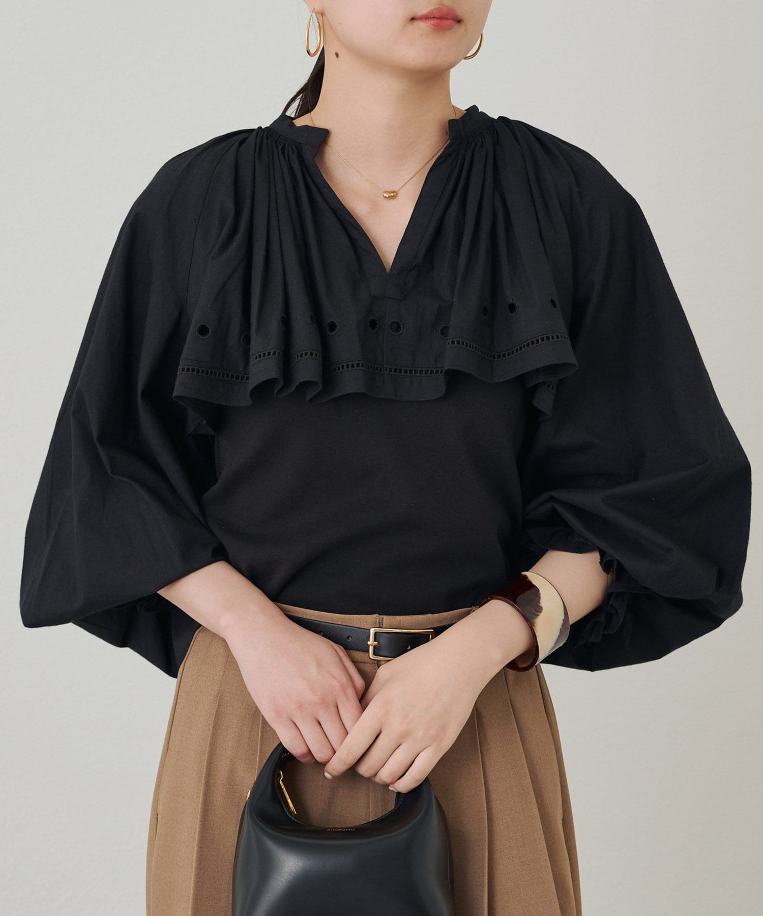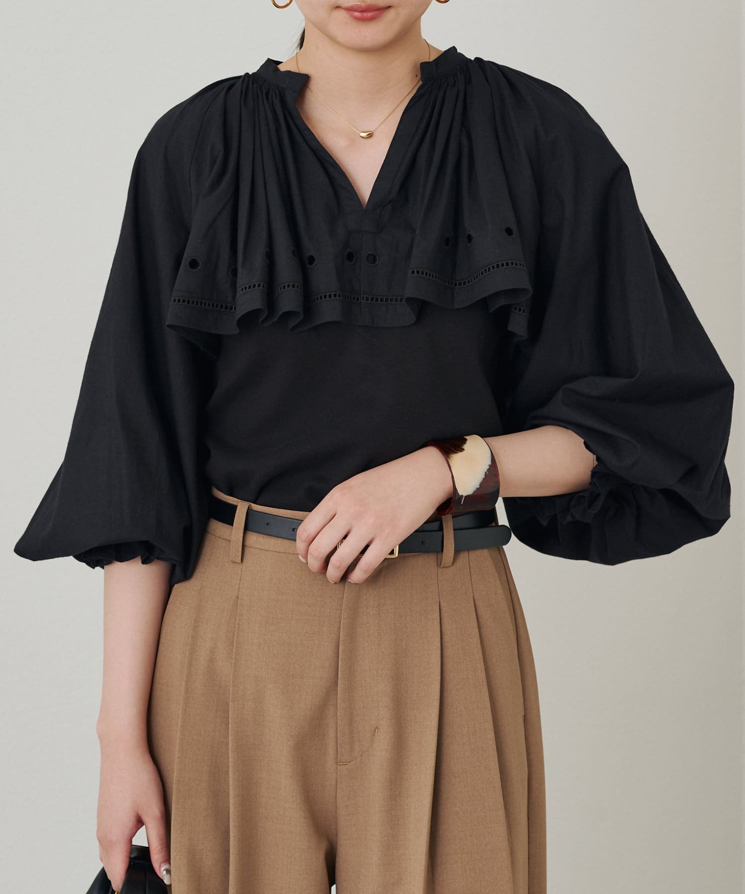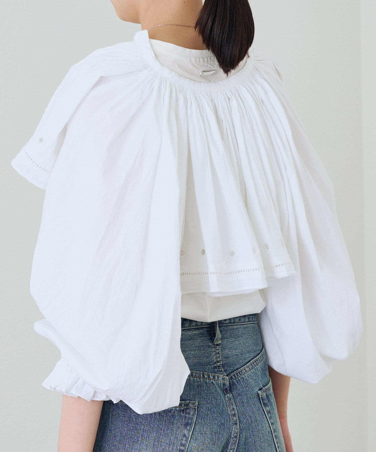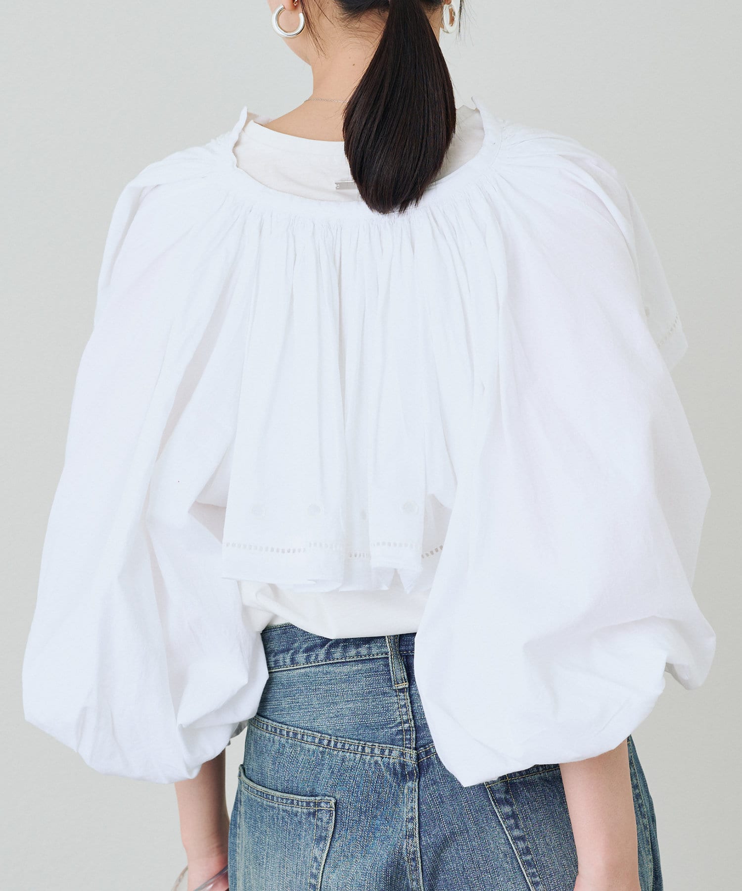 袖口にギャザーを寄せたボリュームスリーブは、トレンド感たっぷり。手首を華奢に見せる効果も期待できます。