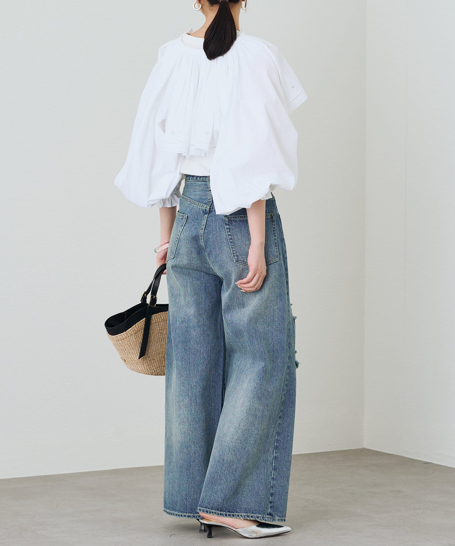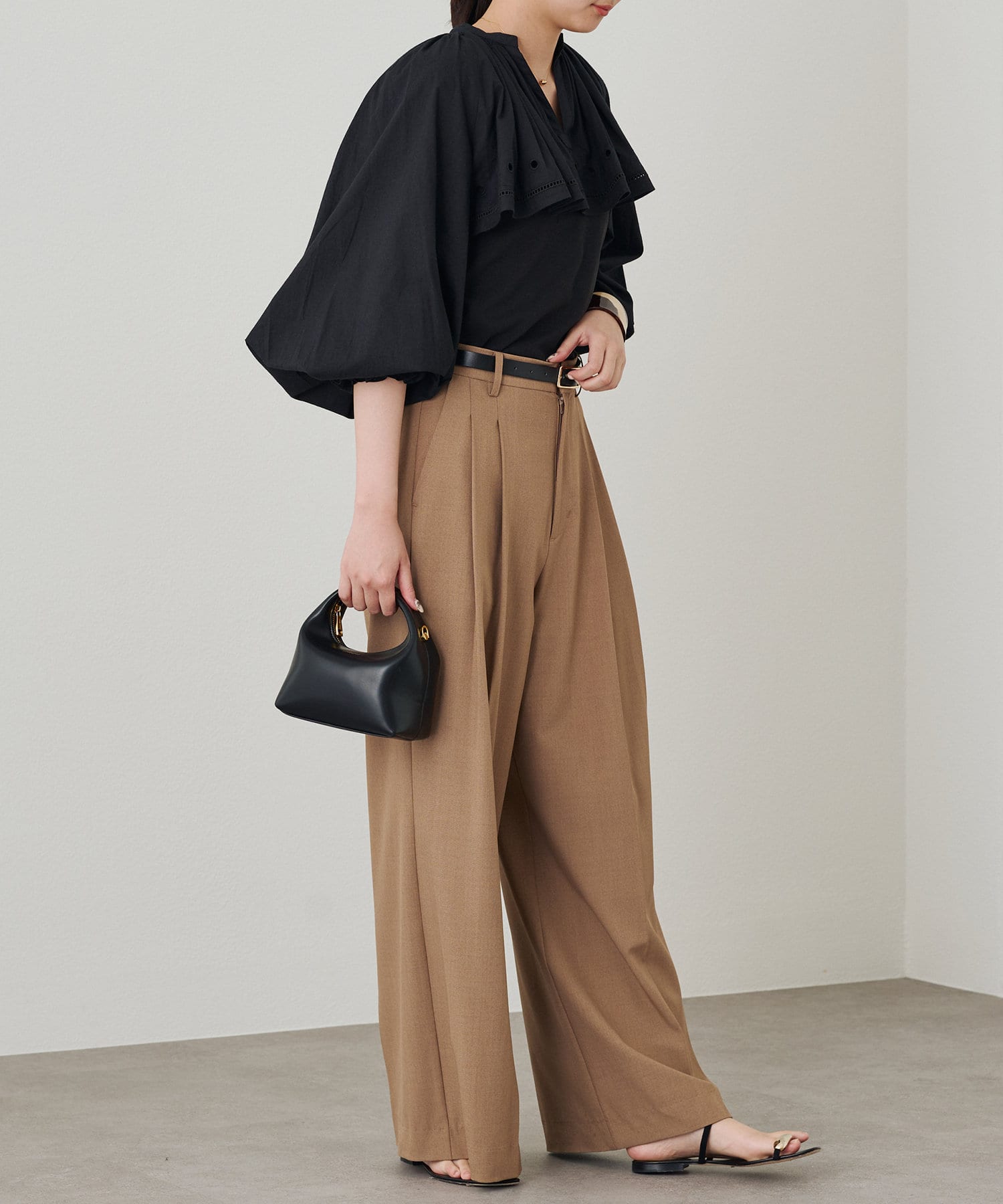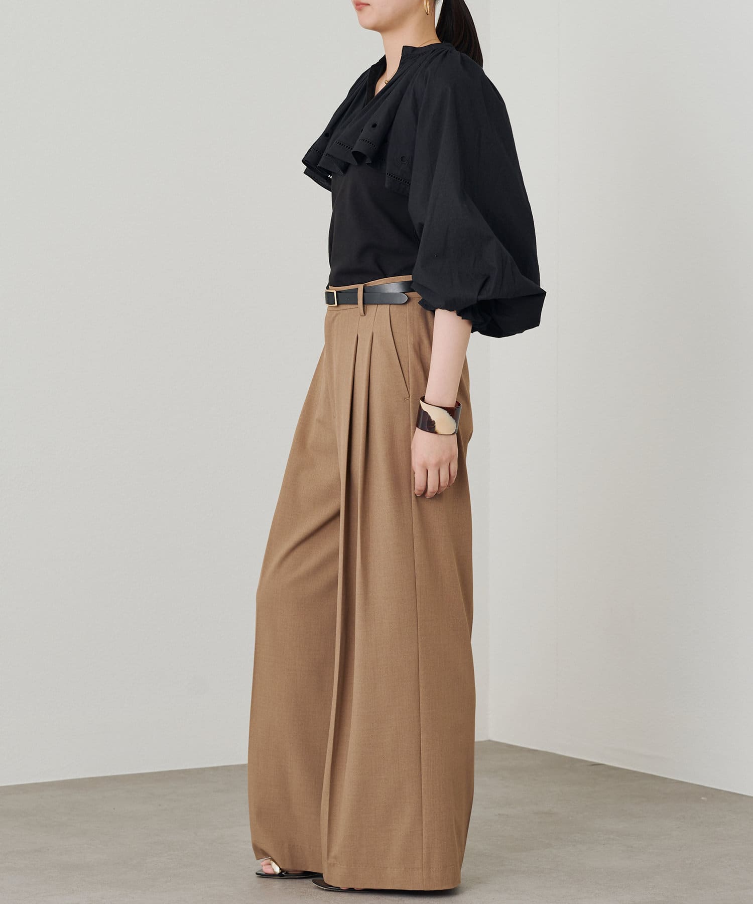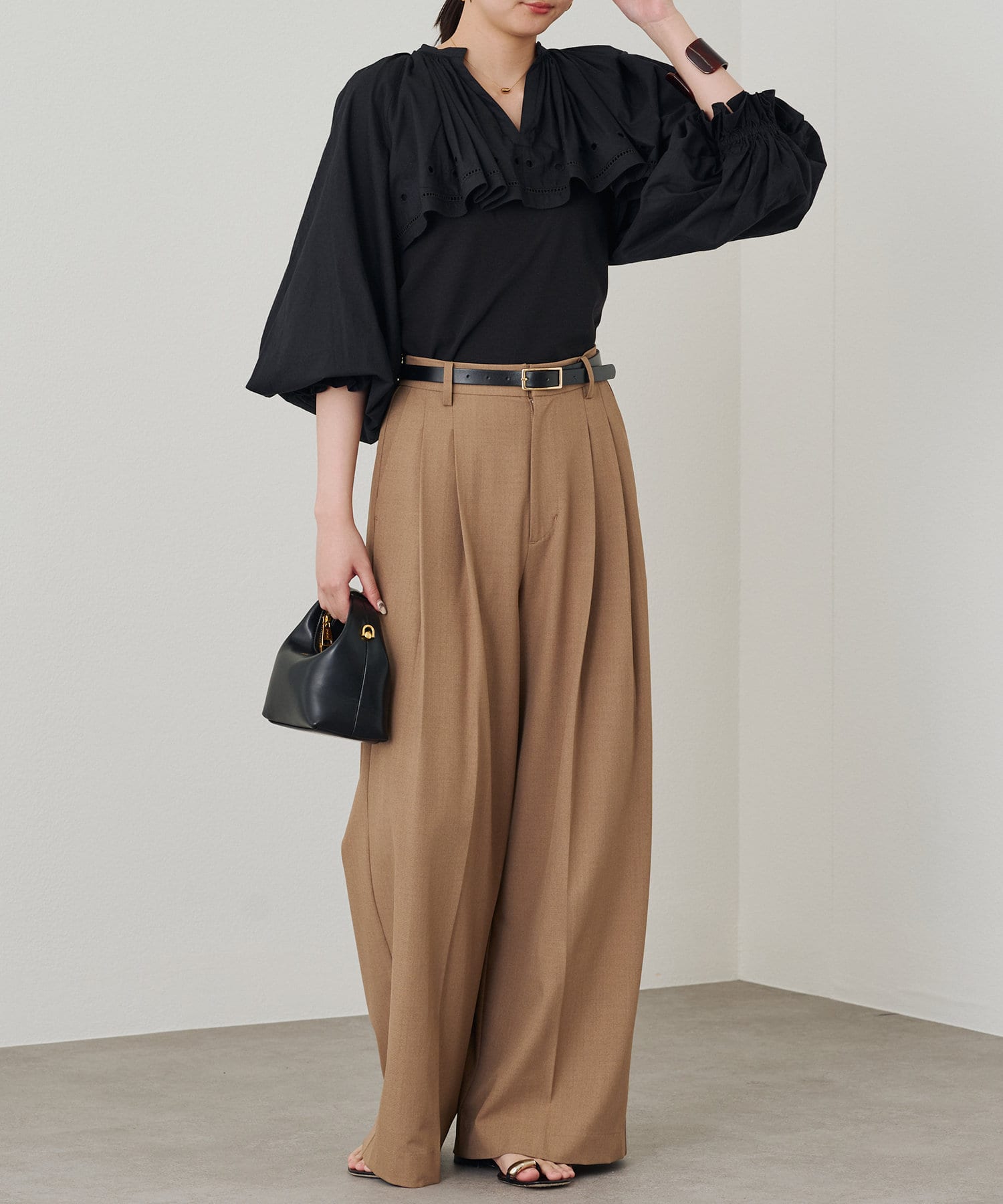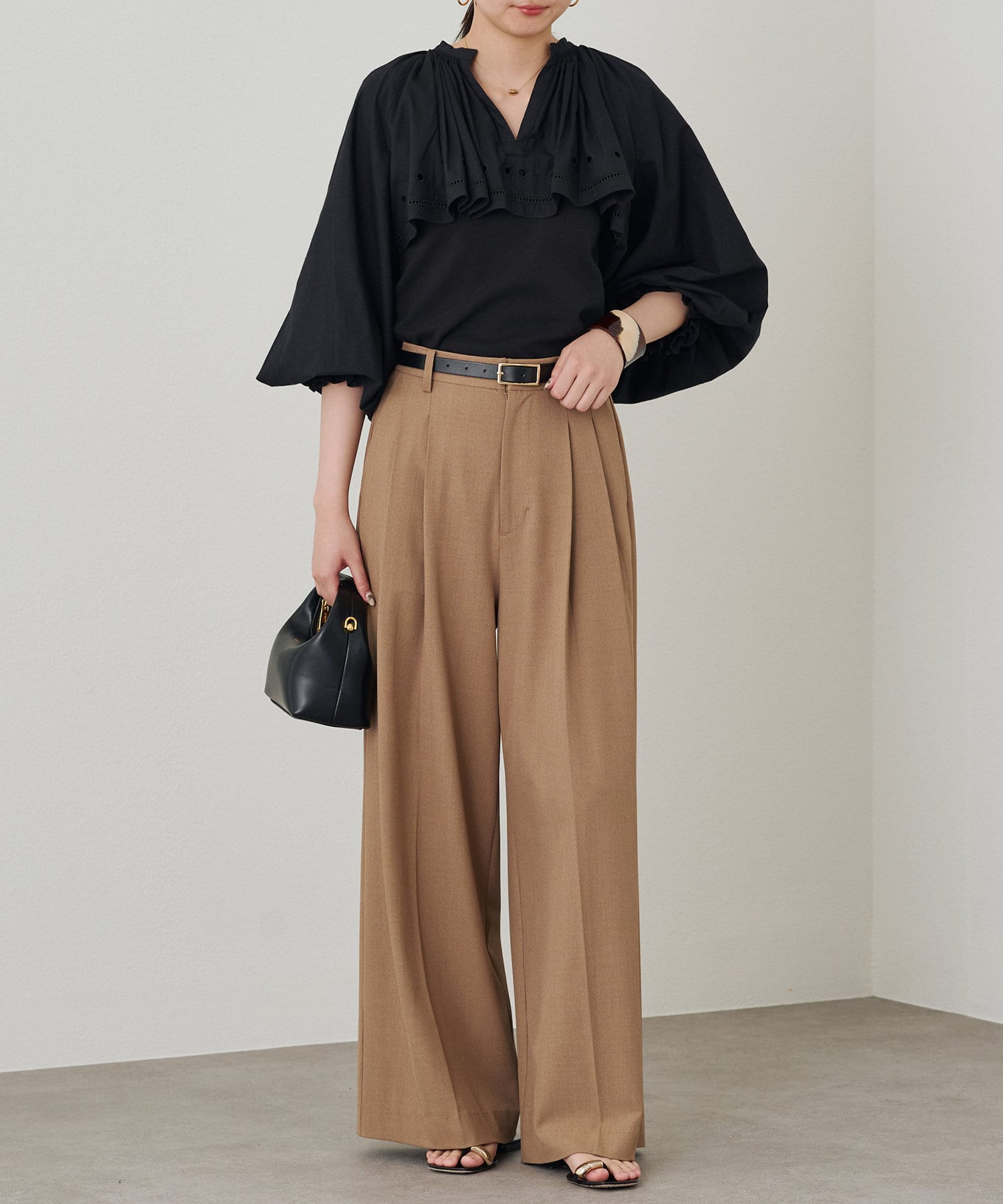袖口にギャザーを寄せたボリュームスリーブは、トレンド感たっぷり。手首を華奢に見せる効果も期待できます。