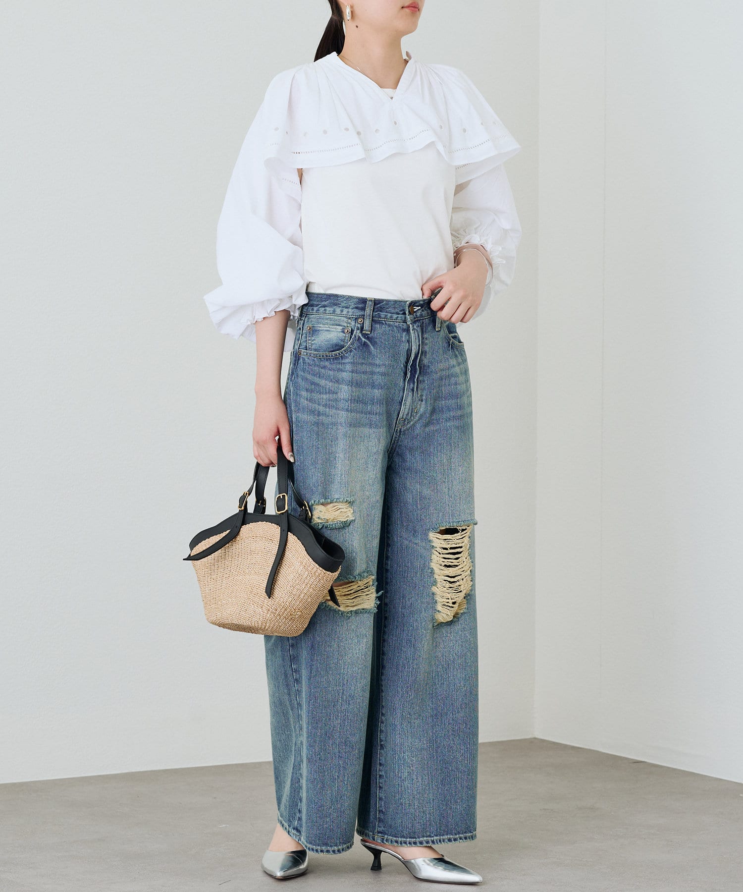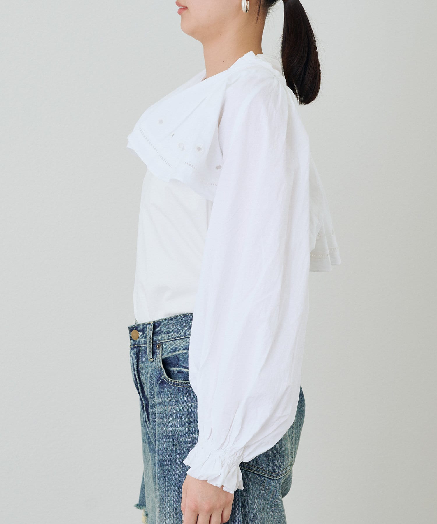 合わせるアイテムによって、様々な表情を見せてくれるのが、このブラウスの魅力です。