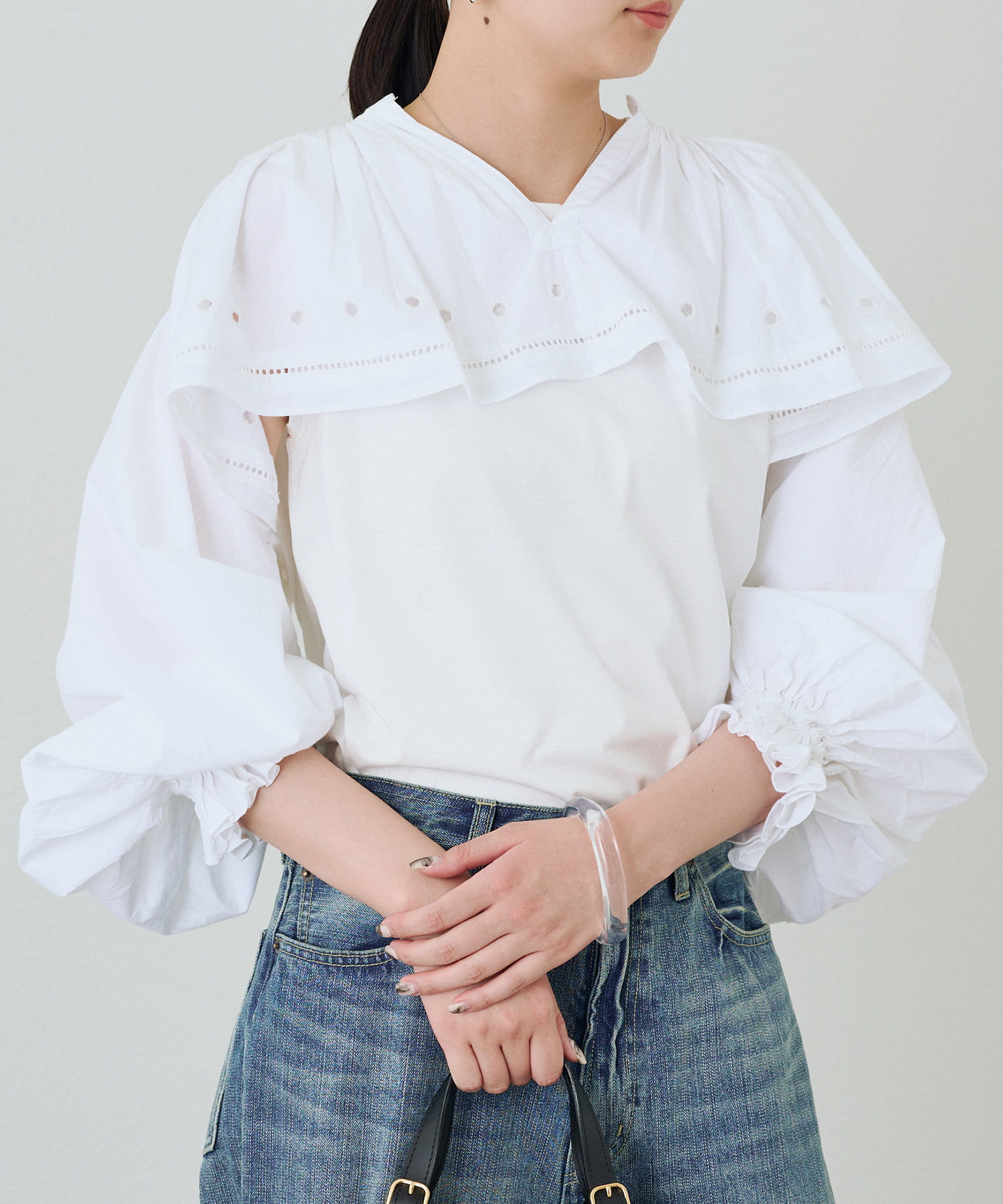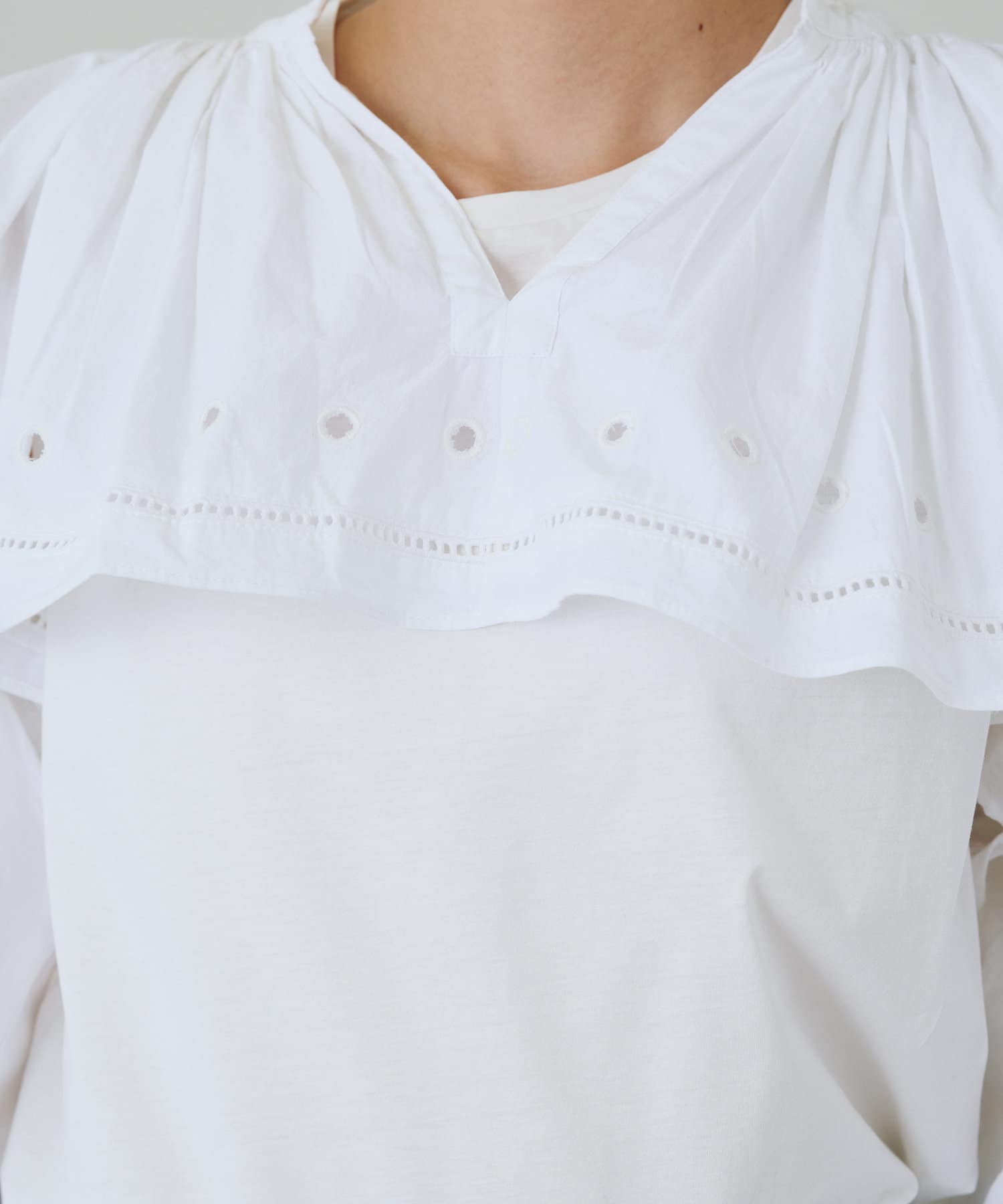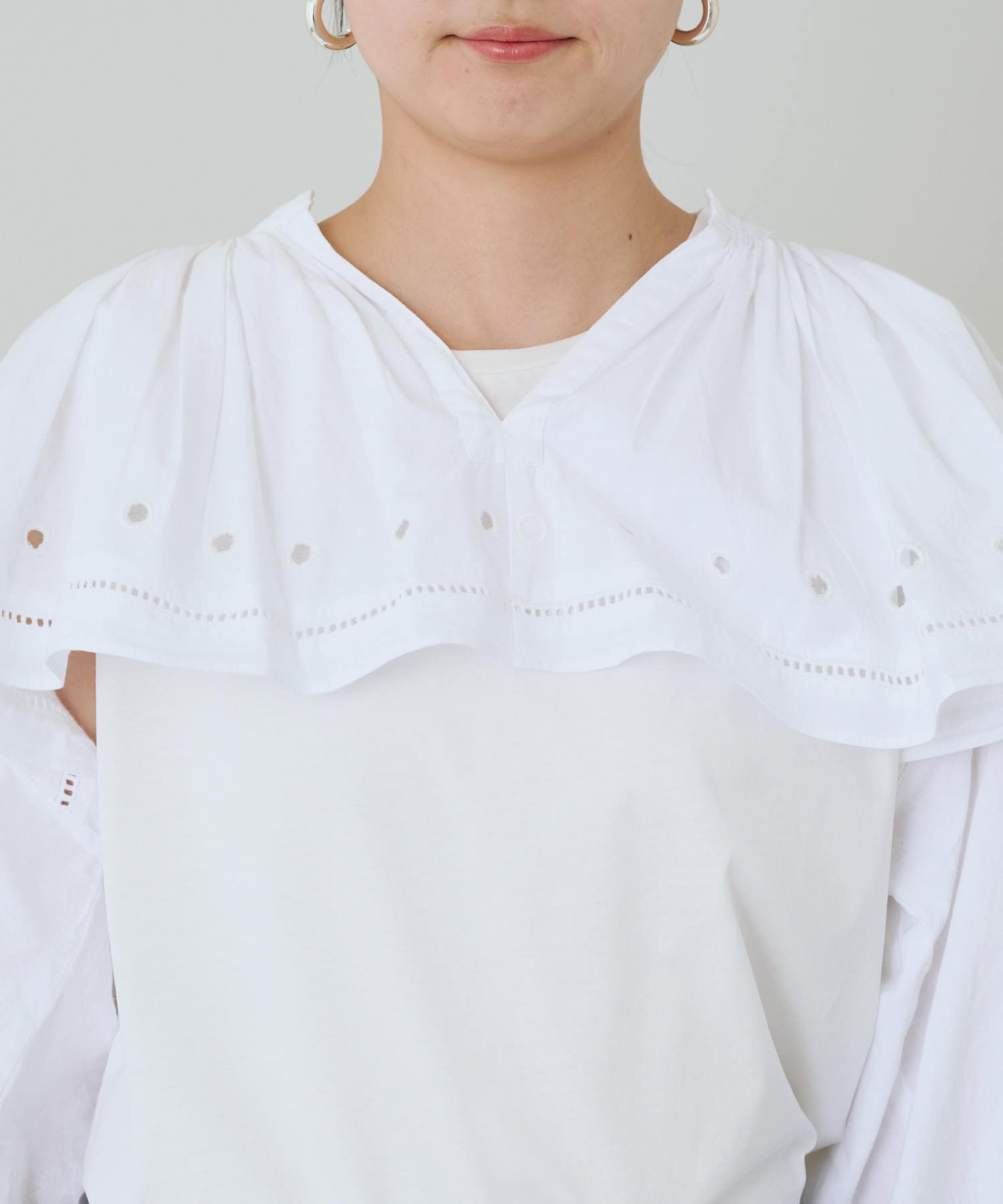 顔まわりを華やかに彩るフリル。デコルテを美しく見せ、顔色を明るく演出します。