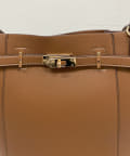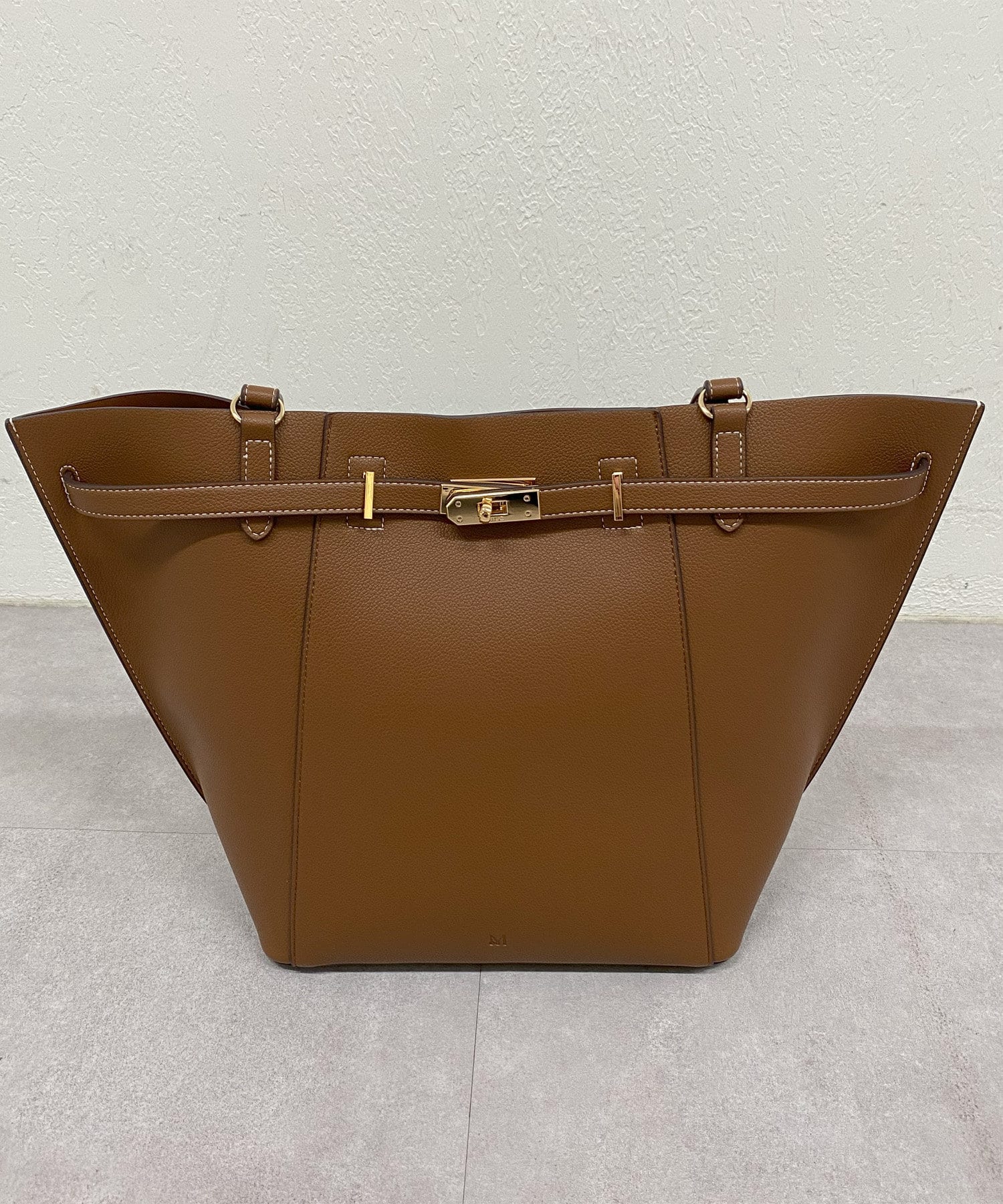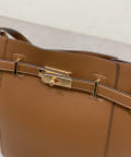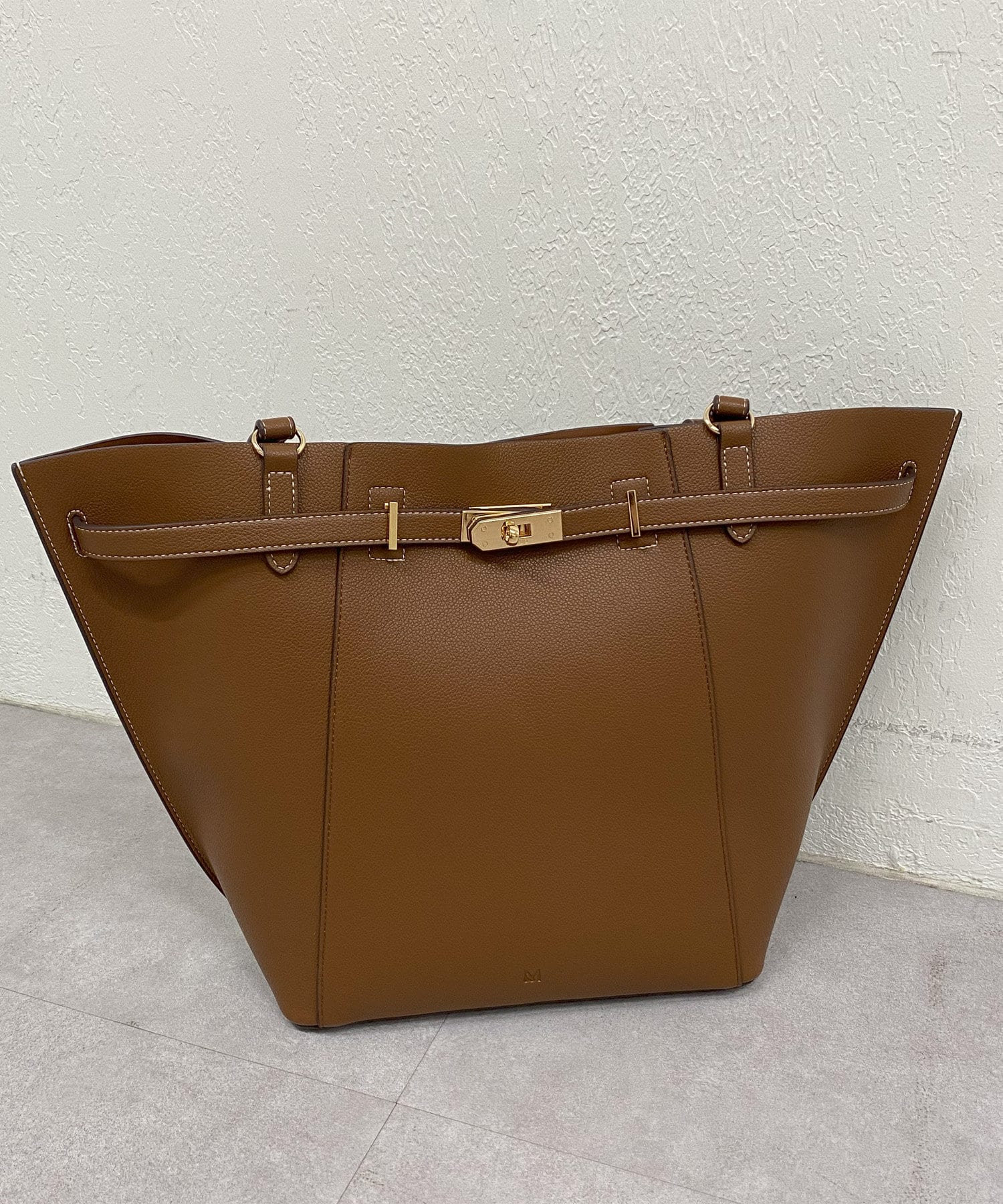 開口部をベルトと金具で留めるデザインは、デザイン性と機能性を兼ね備えています。