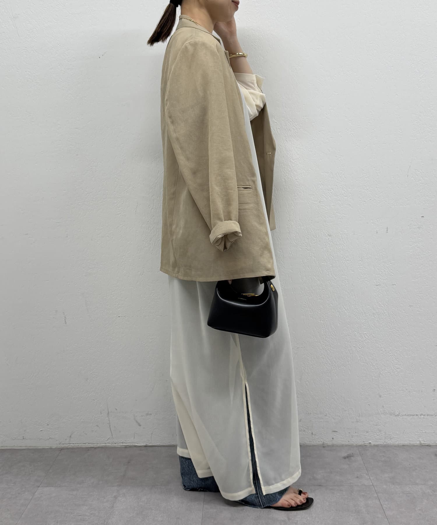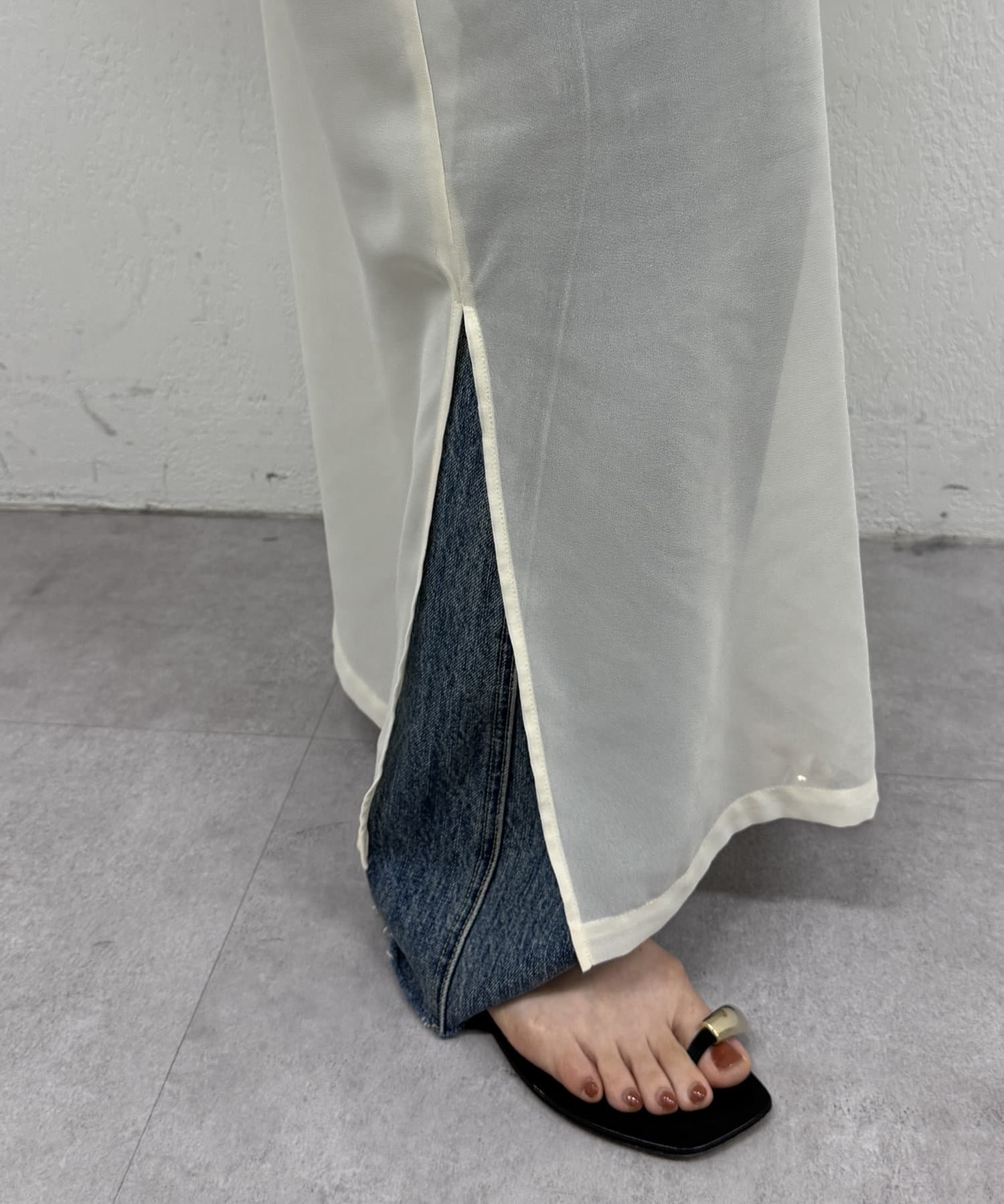 カジュアルにデニムや、ツヤのあるパンツとのレイヤードで旬なスタイリングを楽しめます。