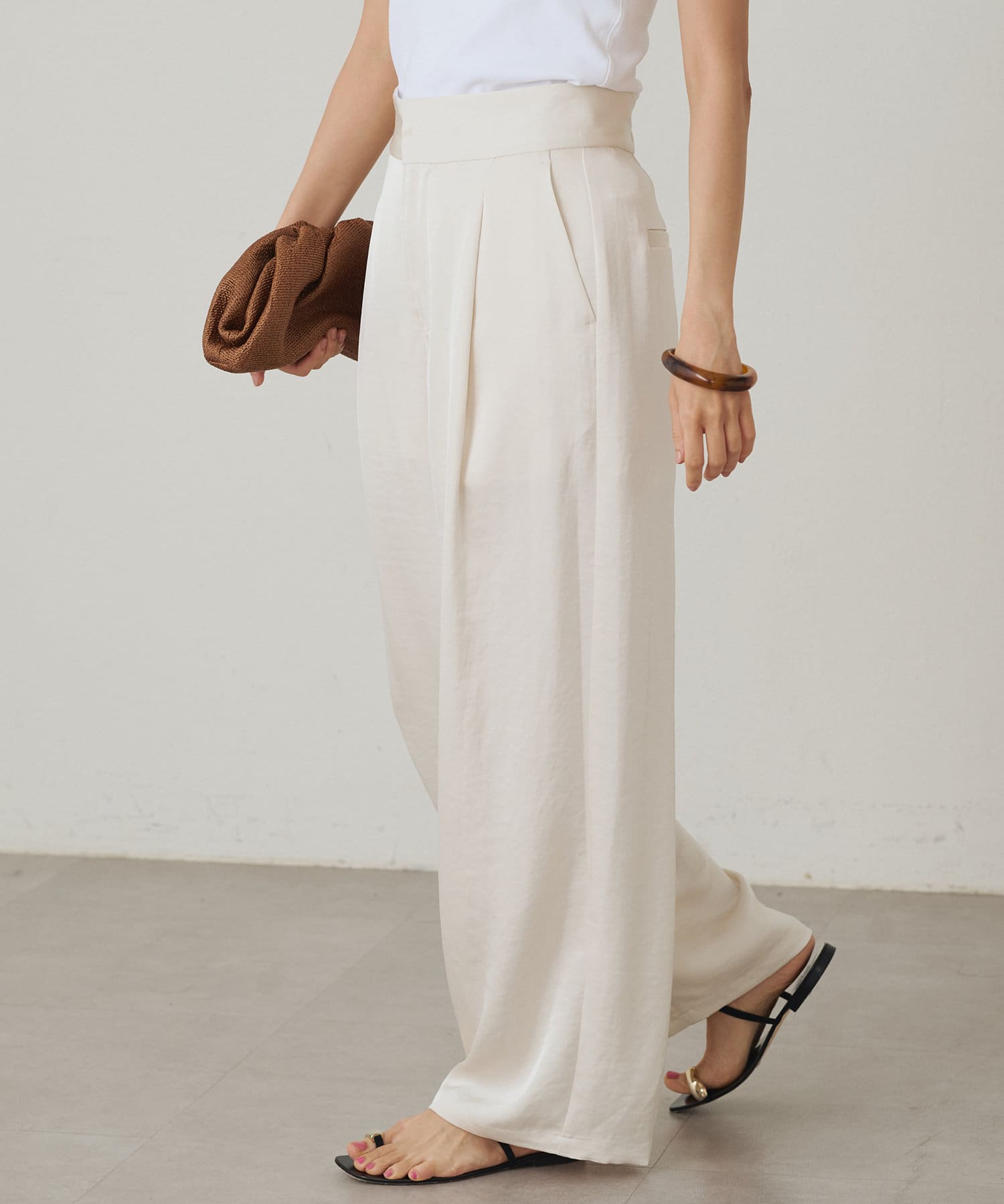 フロントにタックが入っており、程よいドレープ感が生まれ、シンプルなデザインながらも、動きのある表情豊かな印象を与えます。