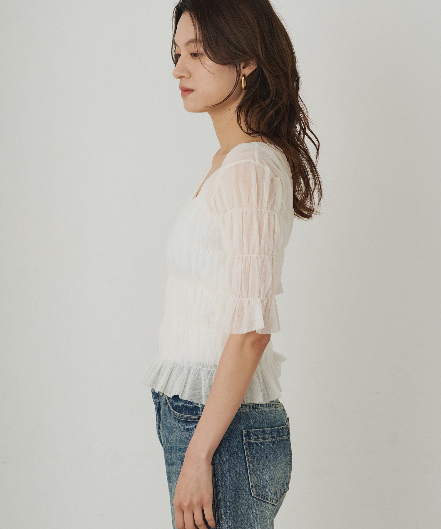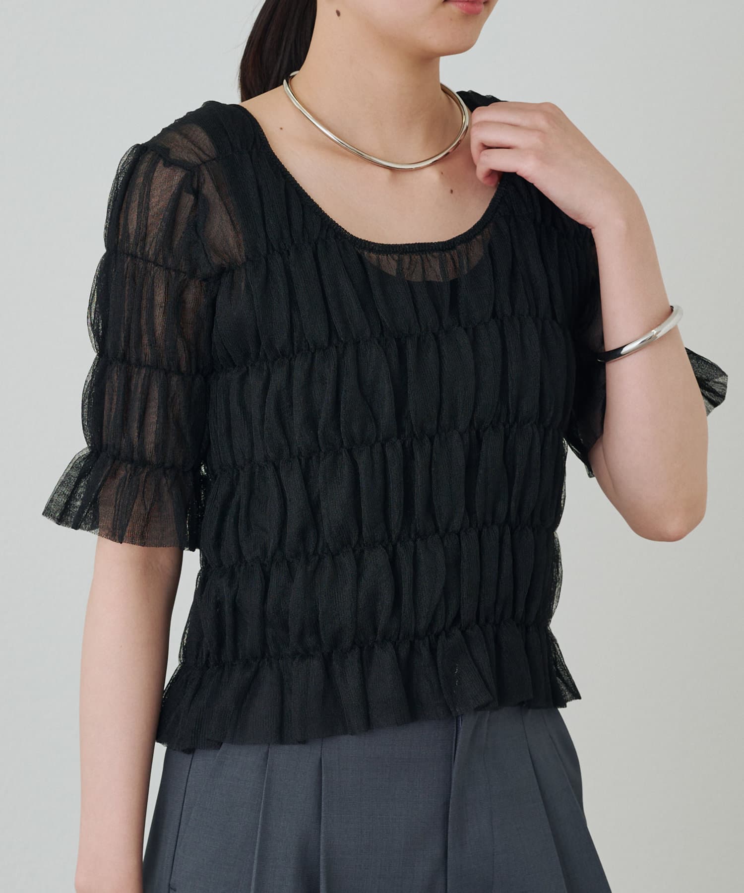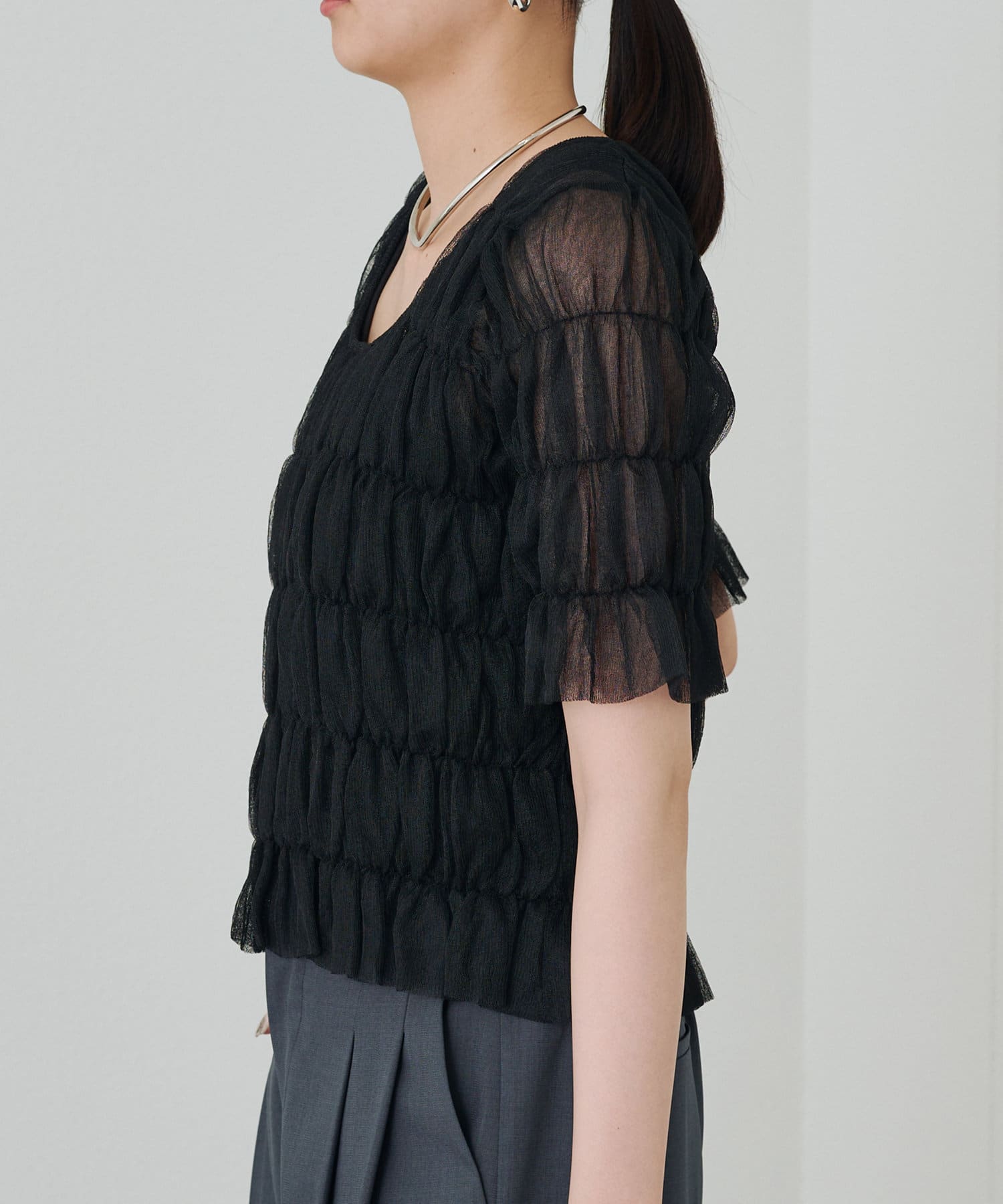 シアーな素材が軽やかで、涼しげな印象のブラウス。