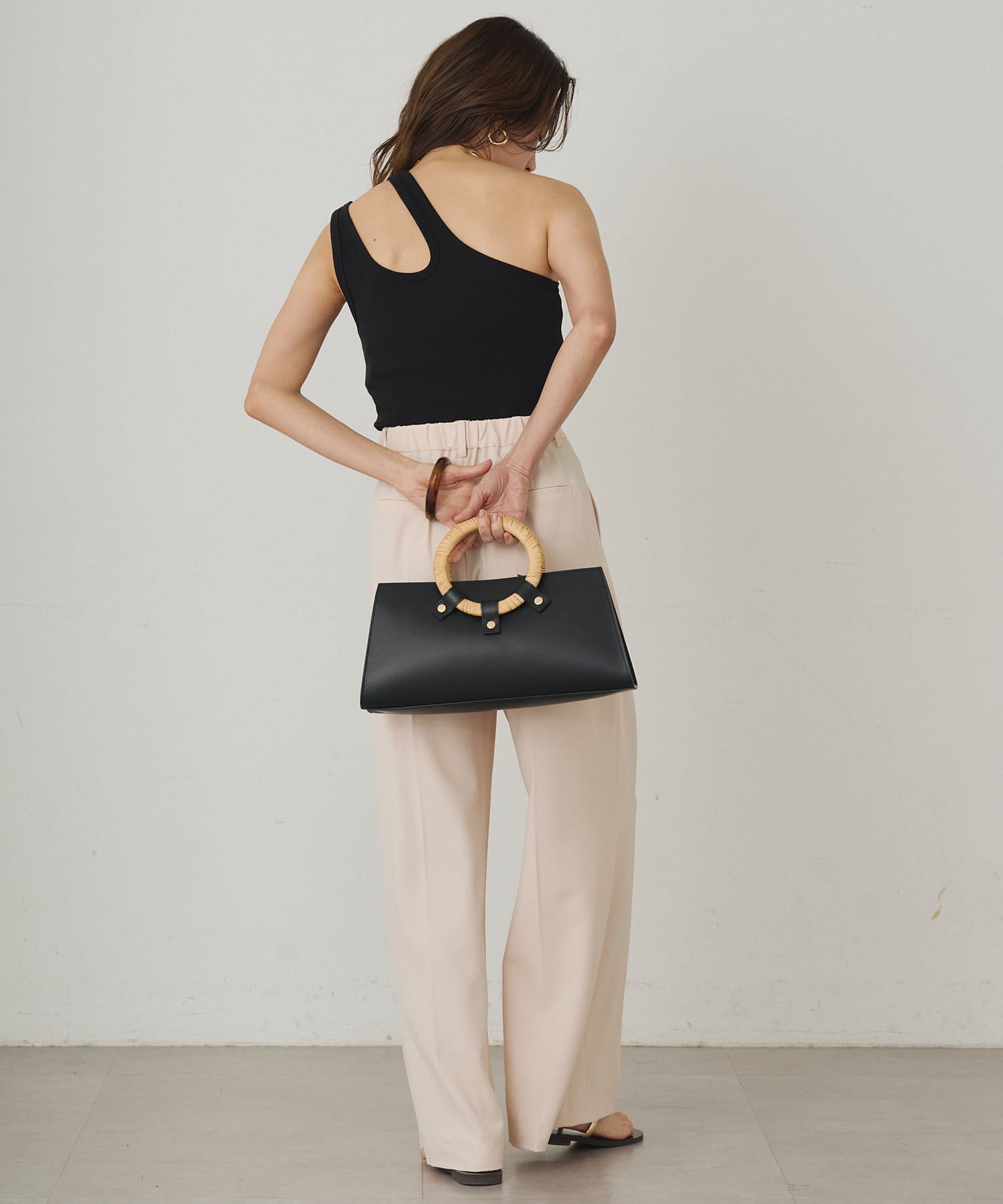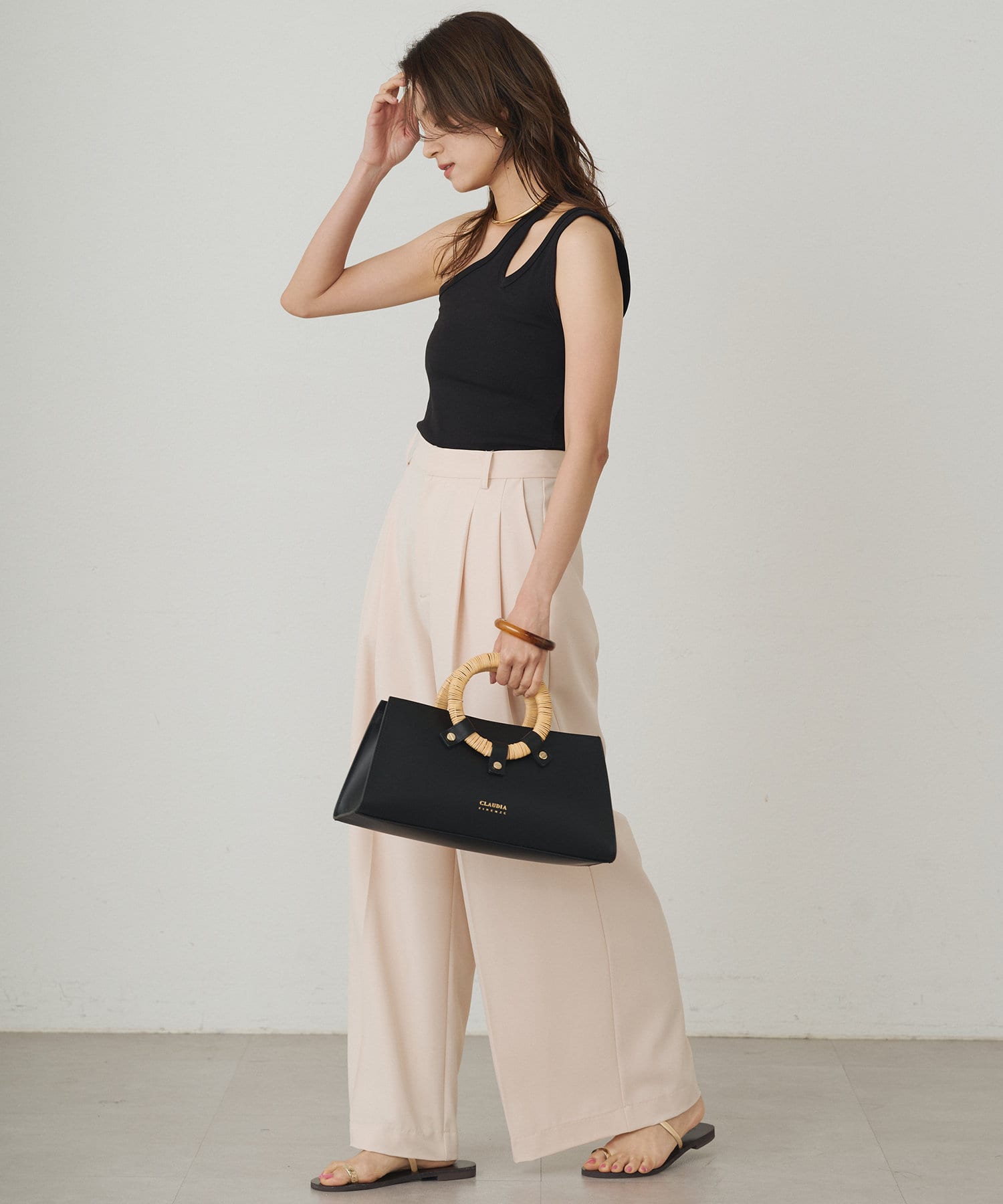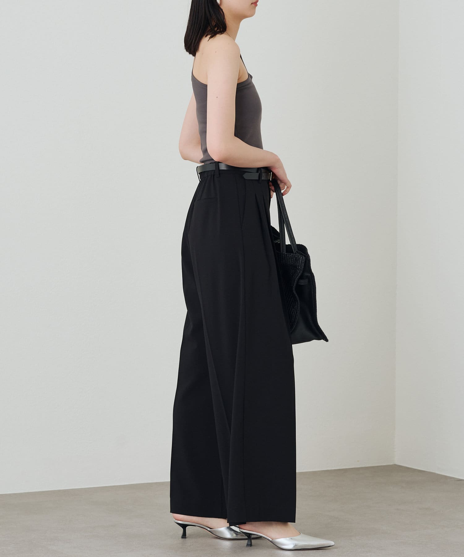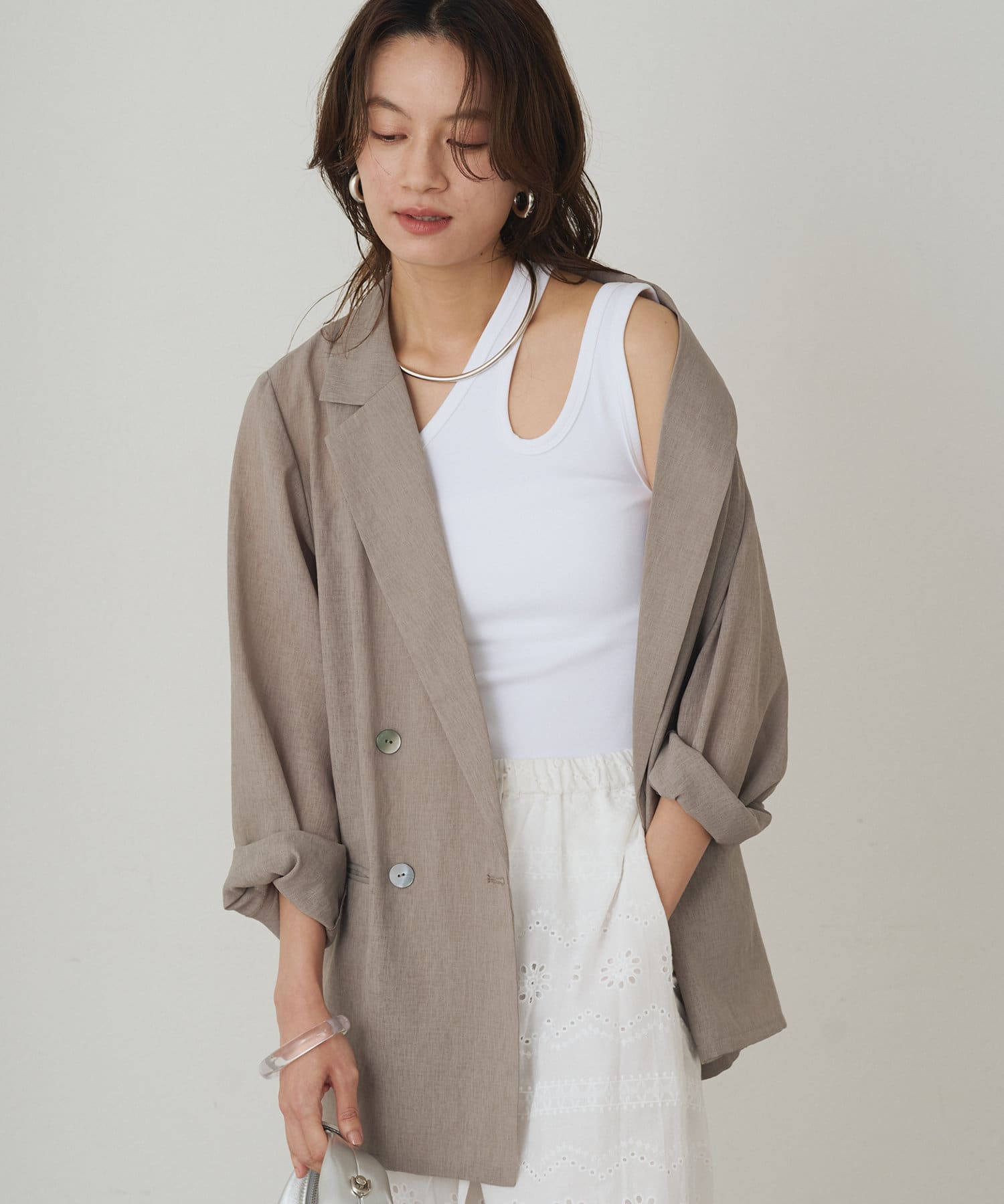 肩のラインに沿ったカットアウトが、さりげない肌見せが抜け感をプラスしてくれるタンクトップ。