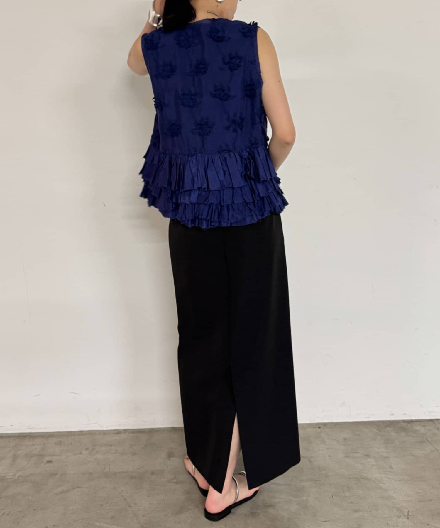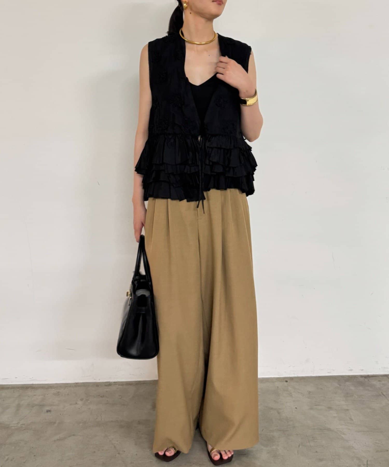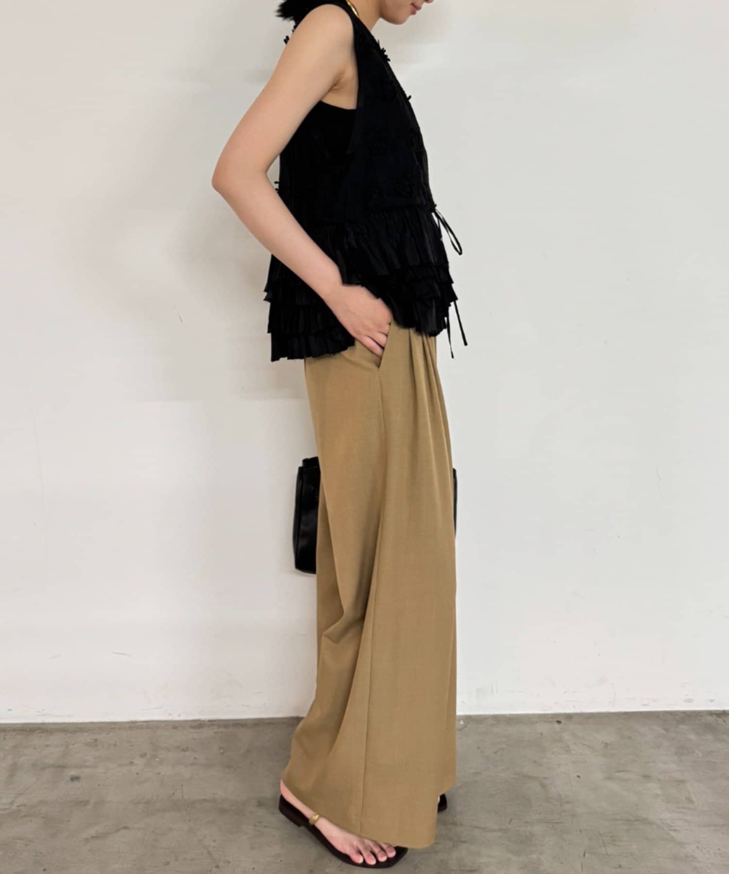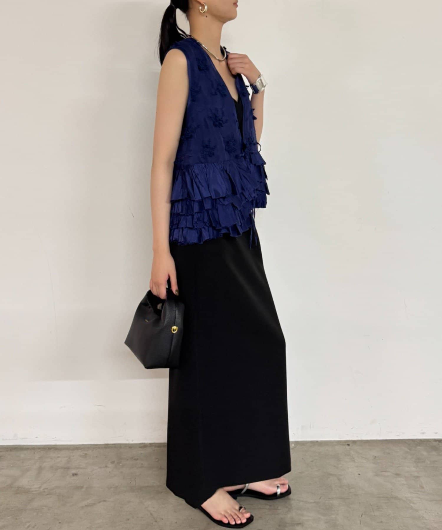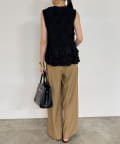 フロントやサイドにあしらわれたフリルは、甘くなりすぎず、動くたびに揺れる軽やかさと立体感が特徴的。