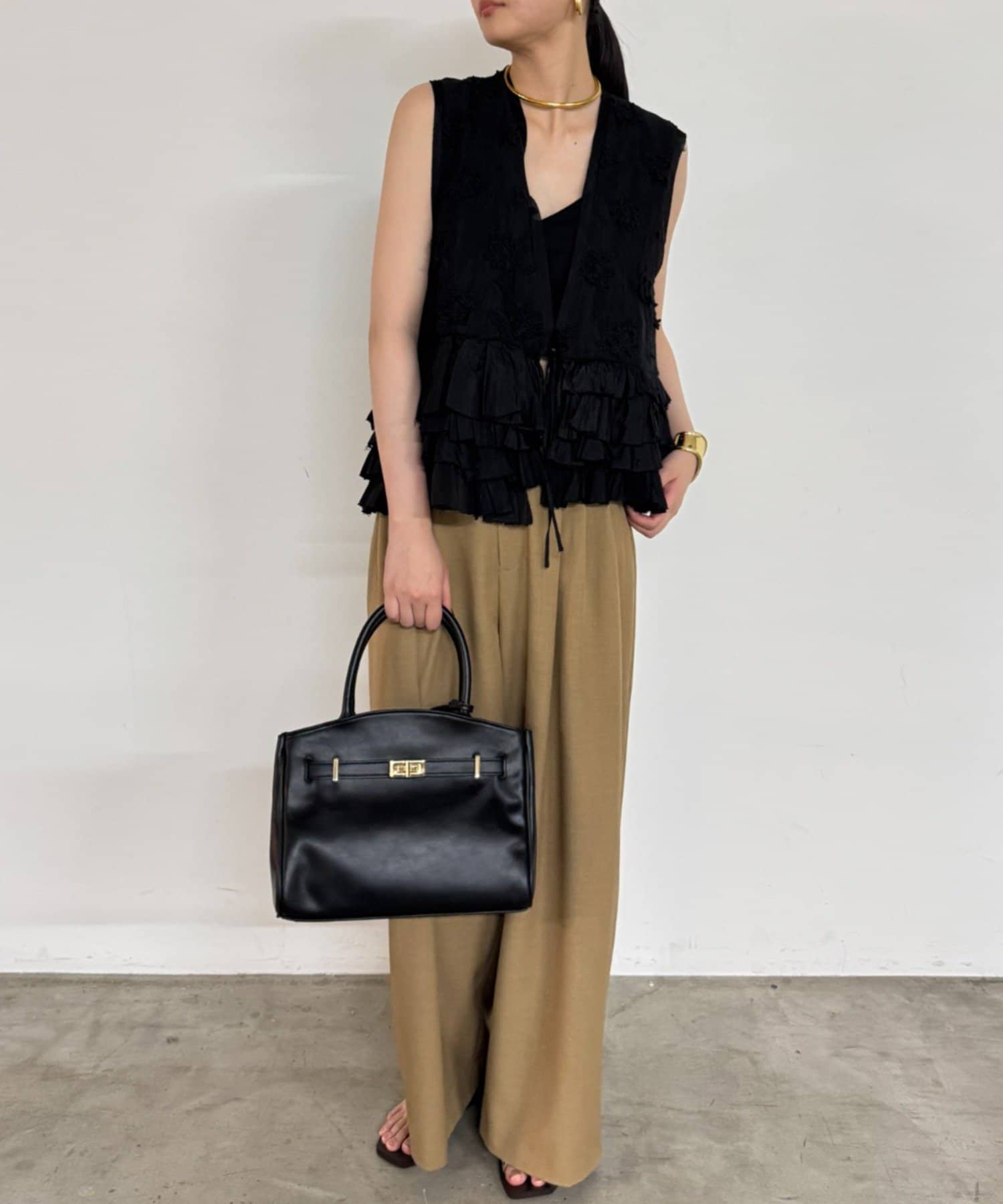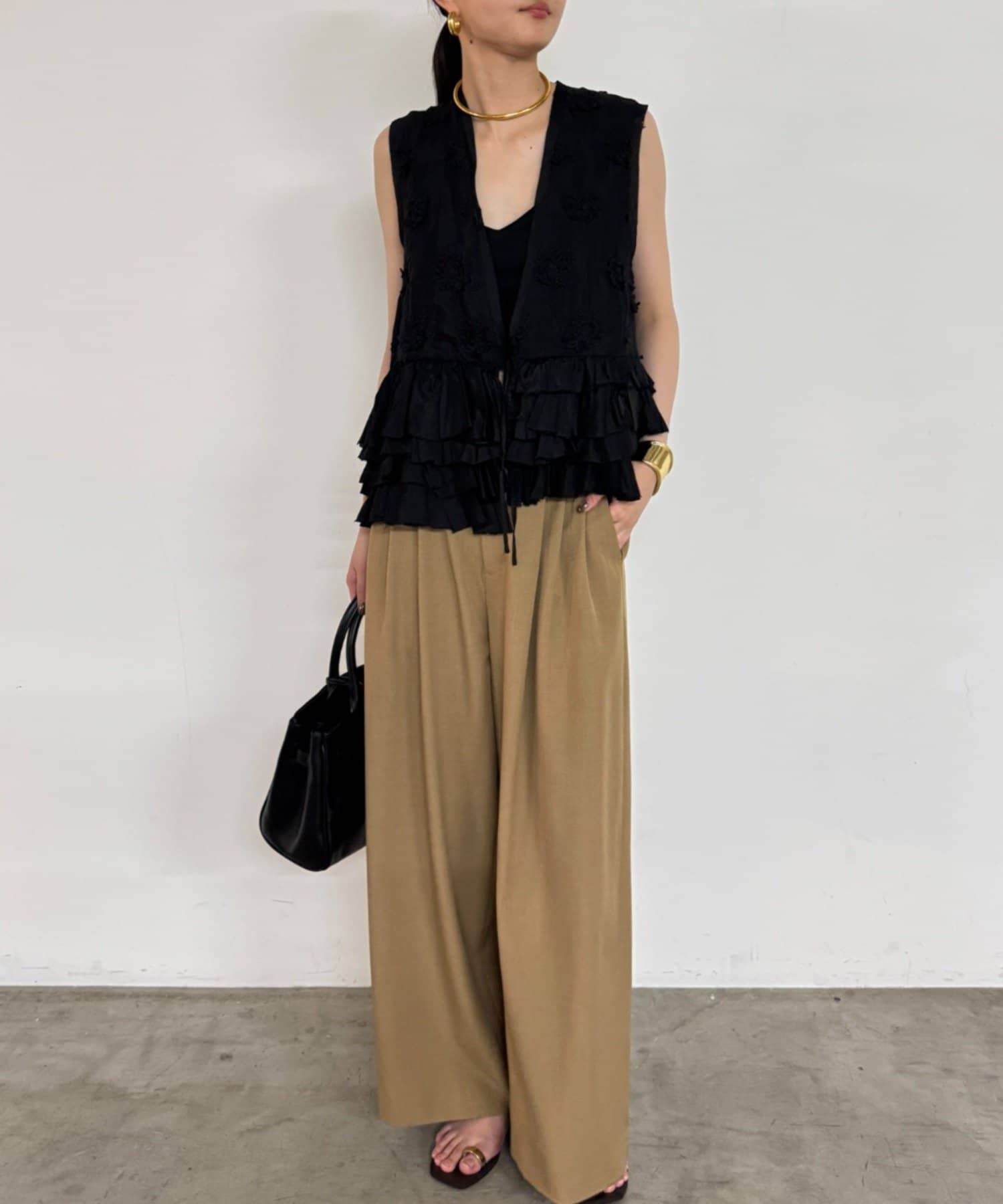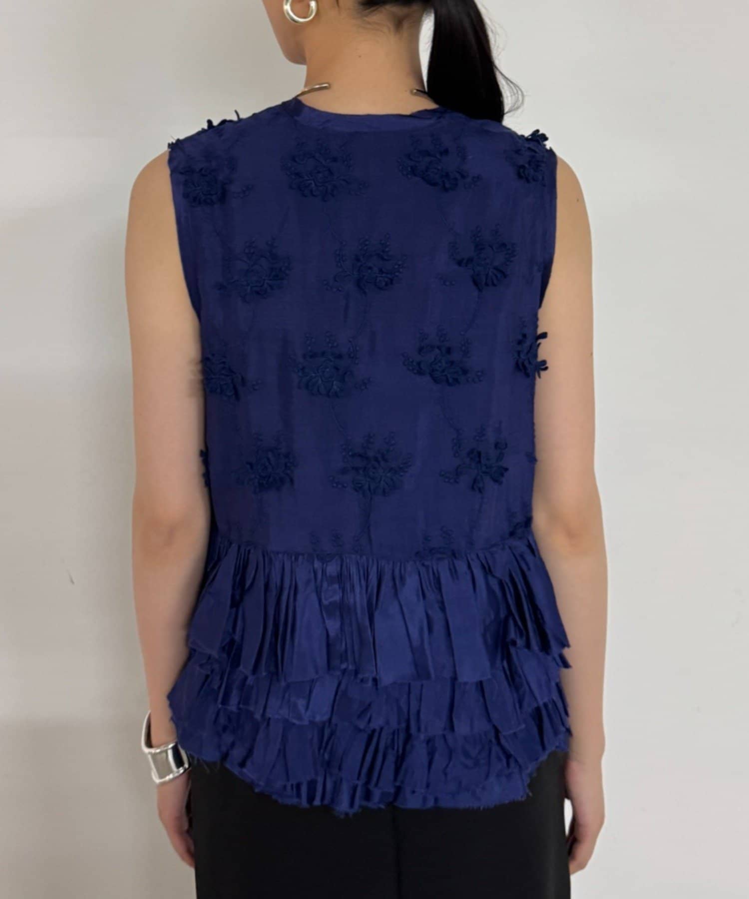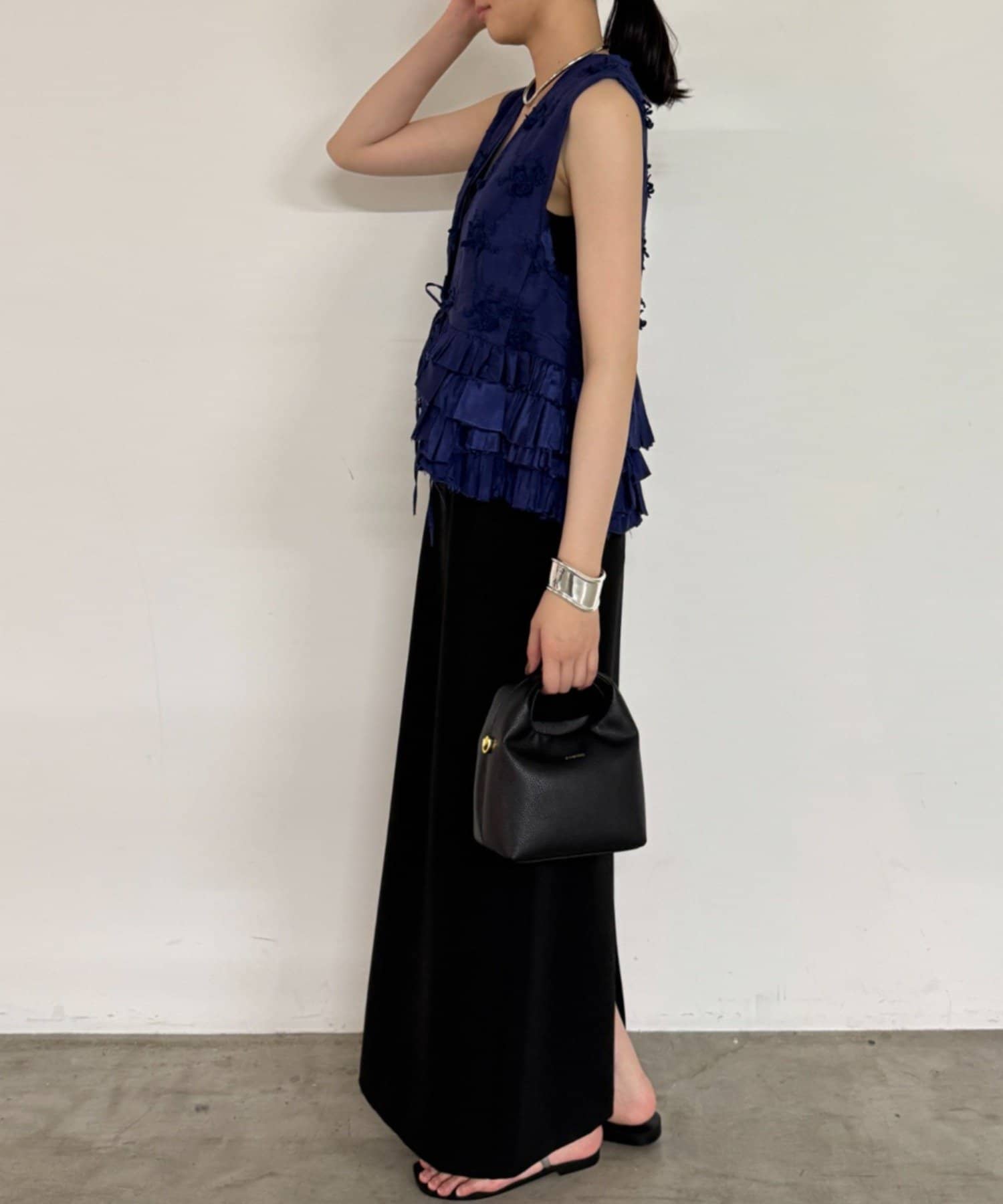 フロントやサイドにあしらわれたフリルは、甘くなりすぎず、動くたびに揺れる軽やかさと立体感が特徴的。