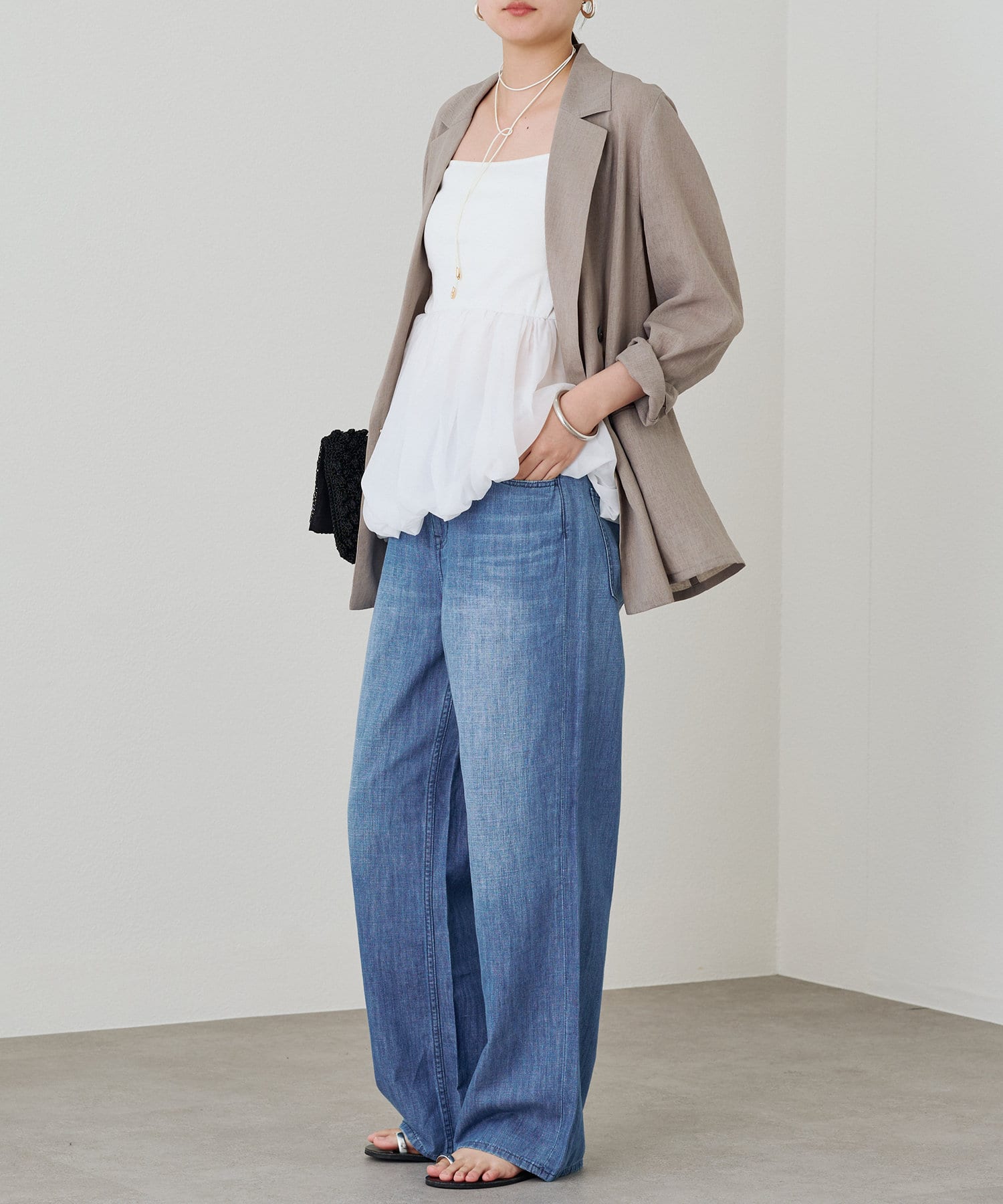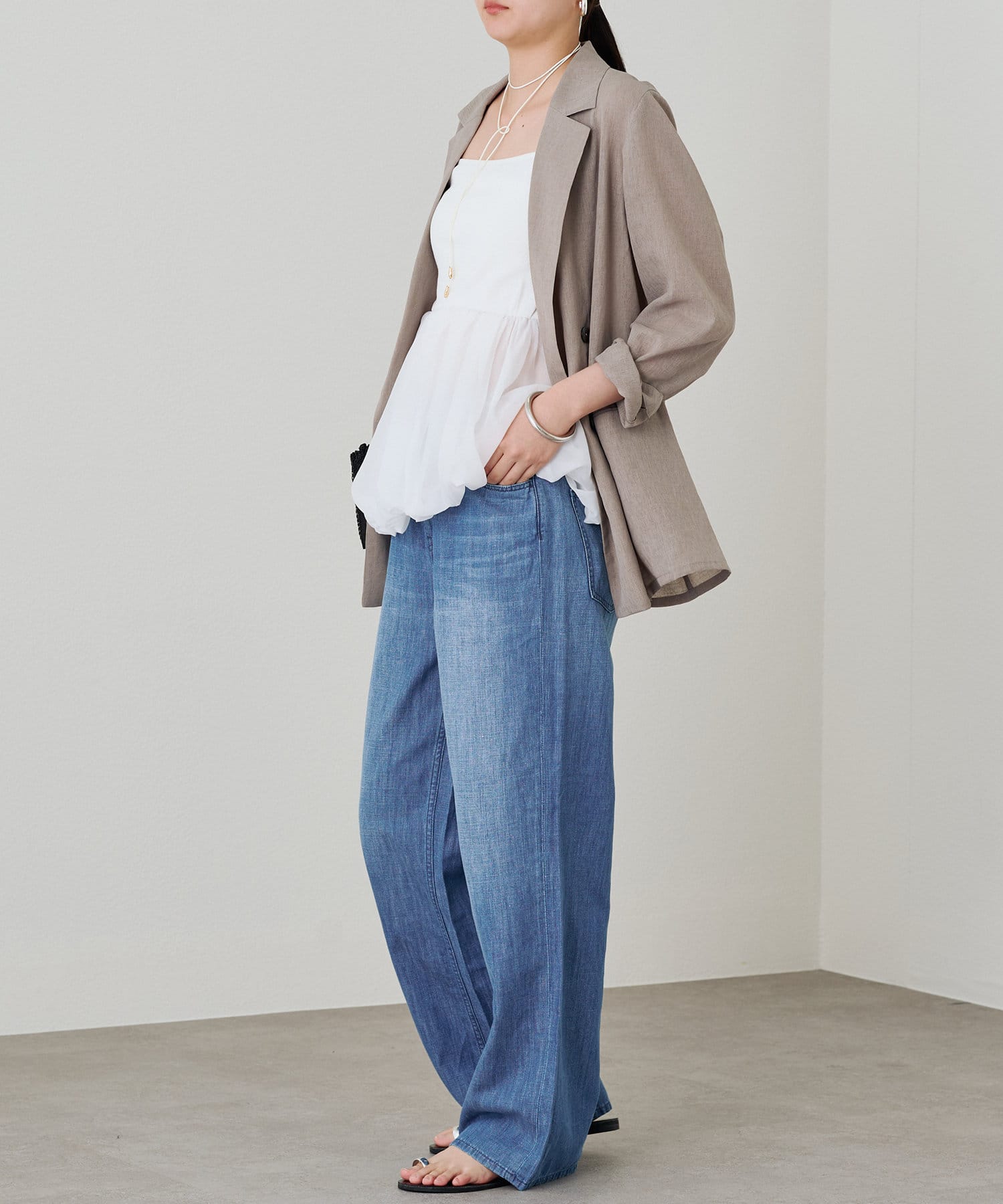 ワイドパンツやフレアパンツと合わせ、リラックス感のある大人カジュアルなスタイルもおすすめです。