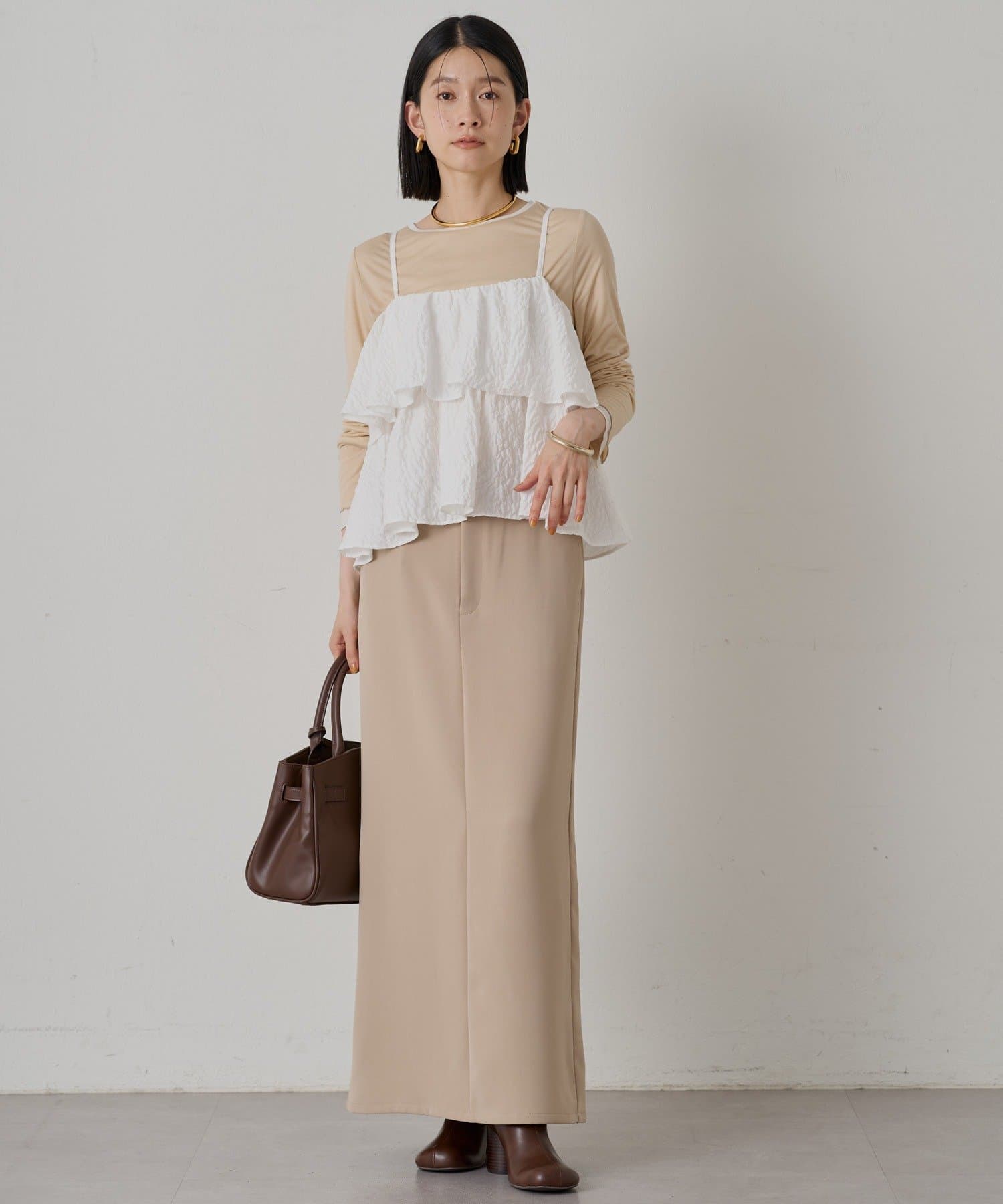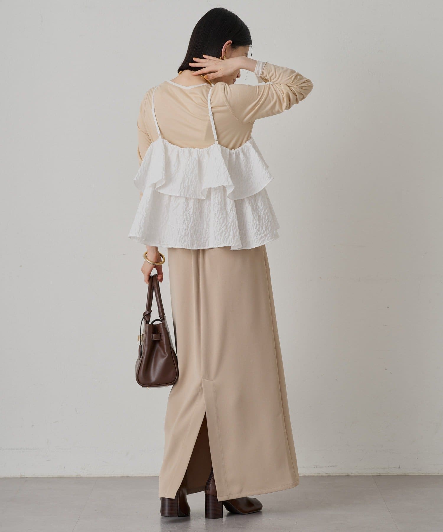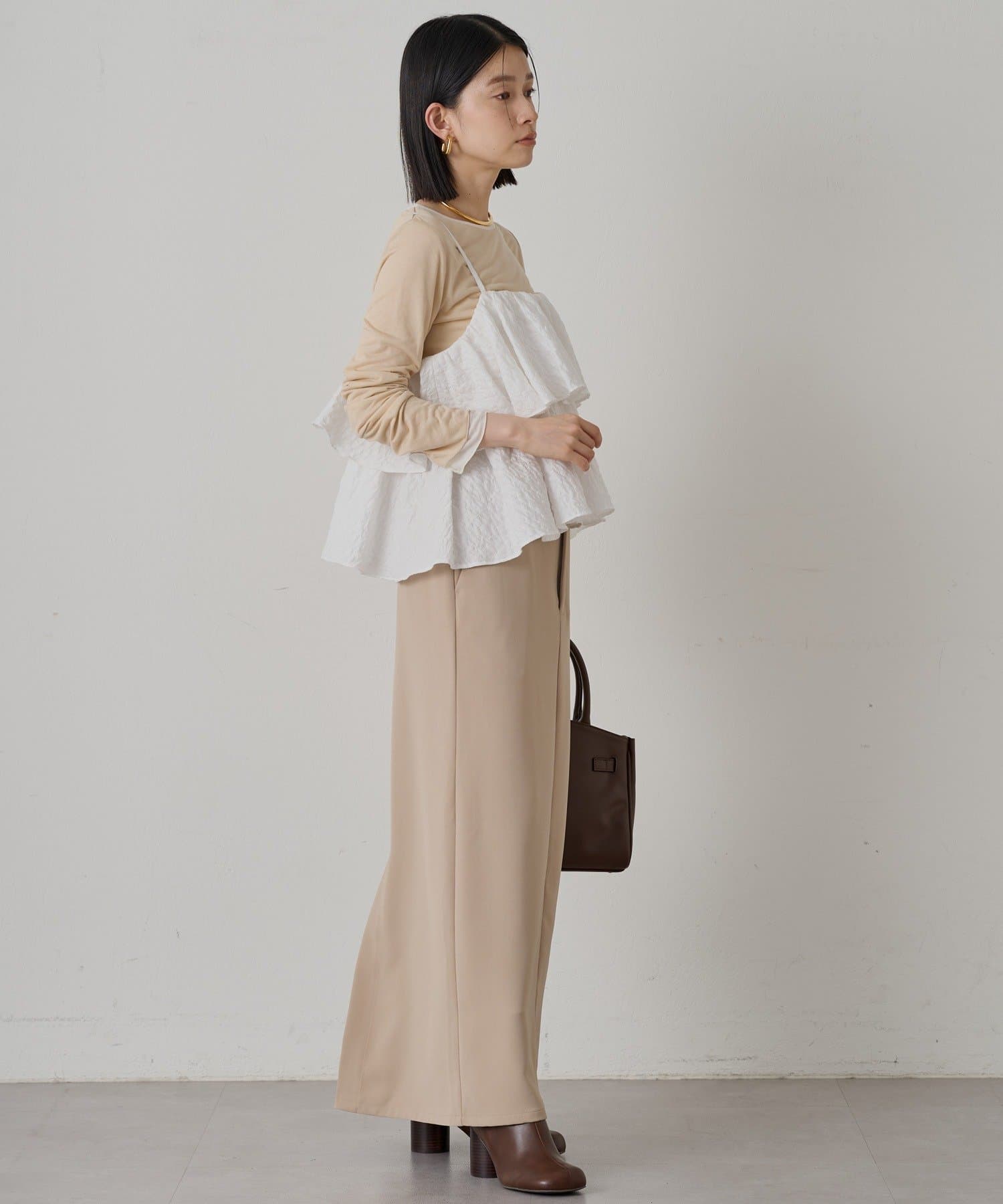 デニムやチノパンにTシャツを合わせ、上からフリルキャミソールを重ねれば、こなれ感のあるカジュアルスタイルに。
