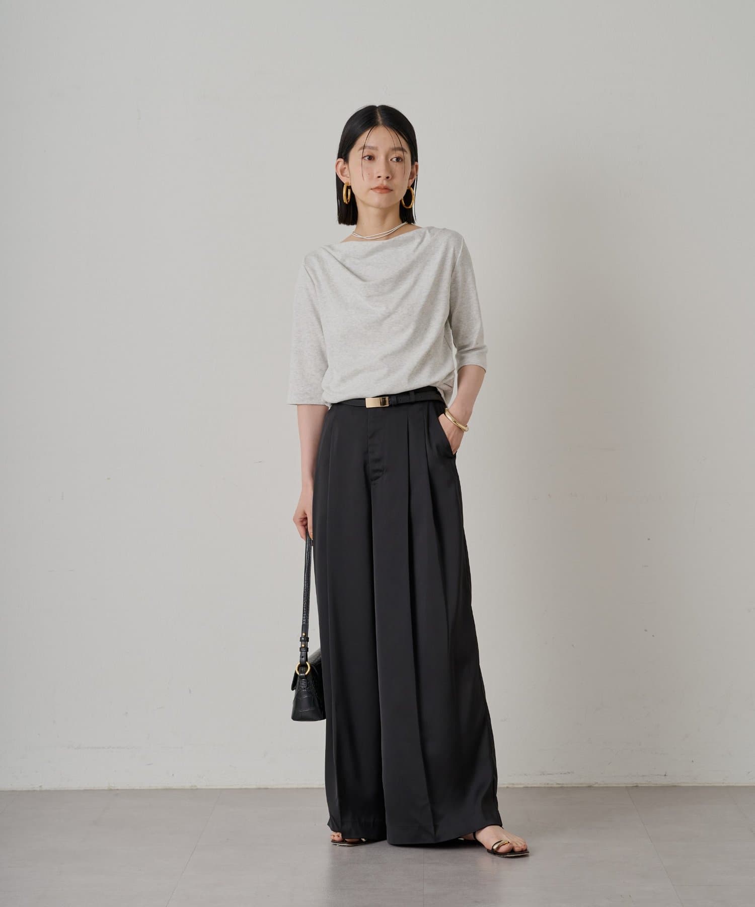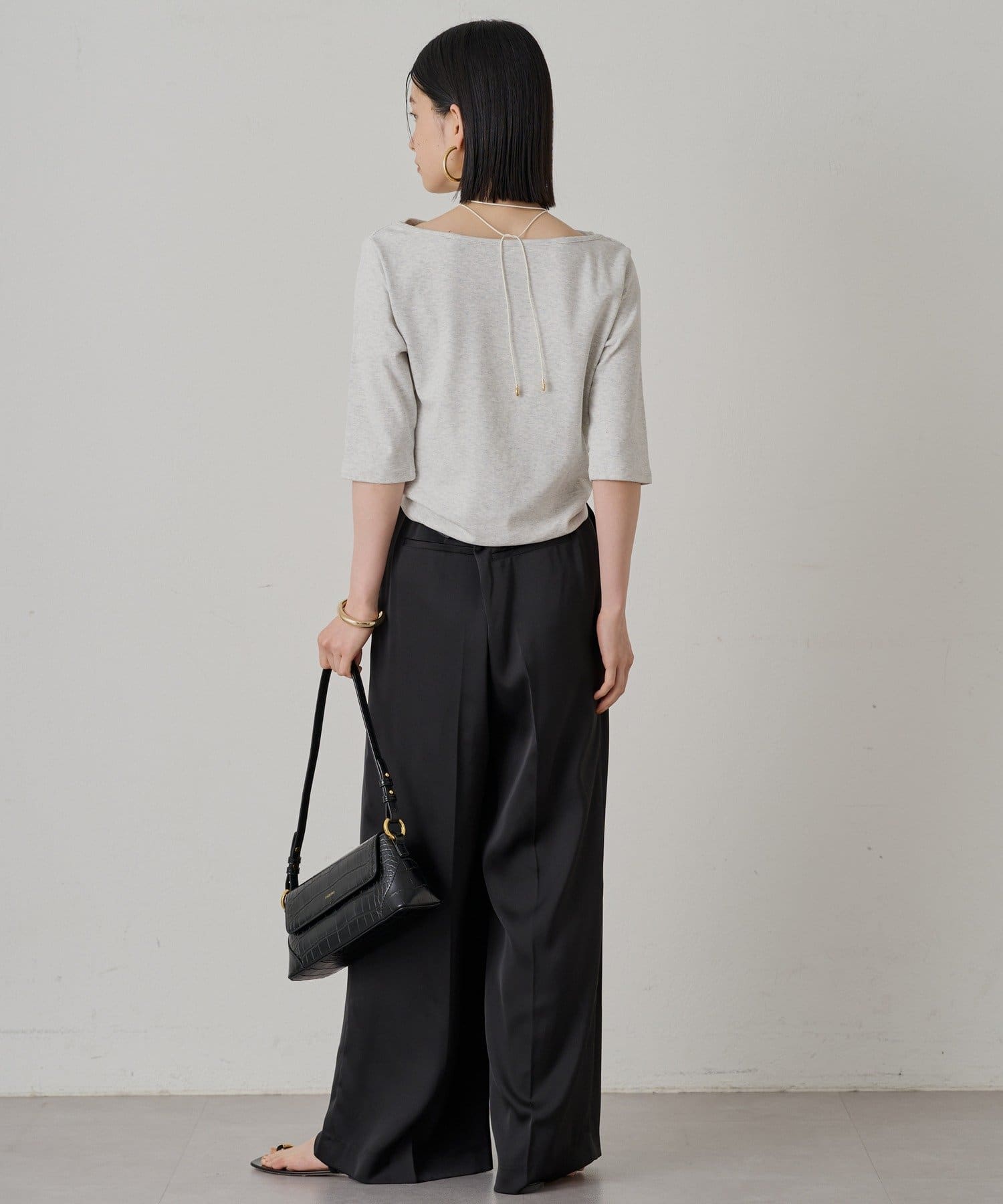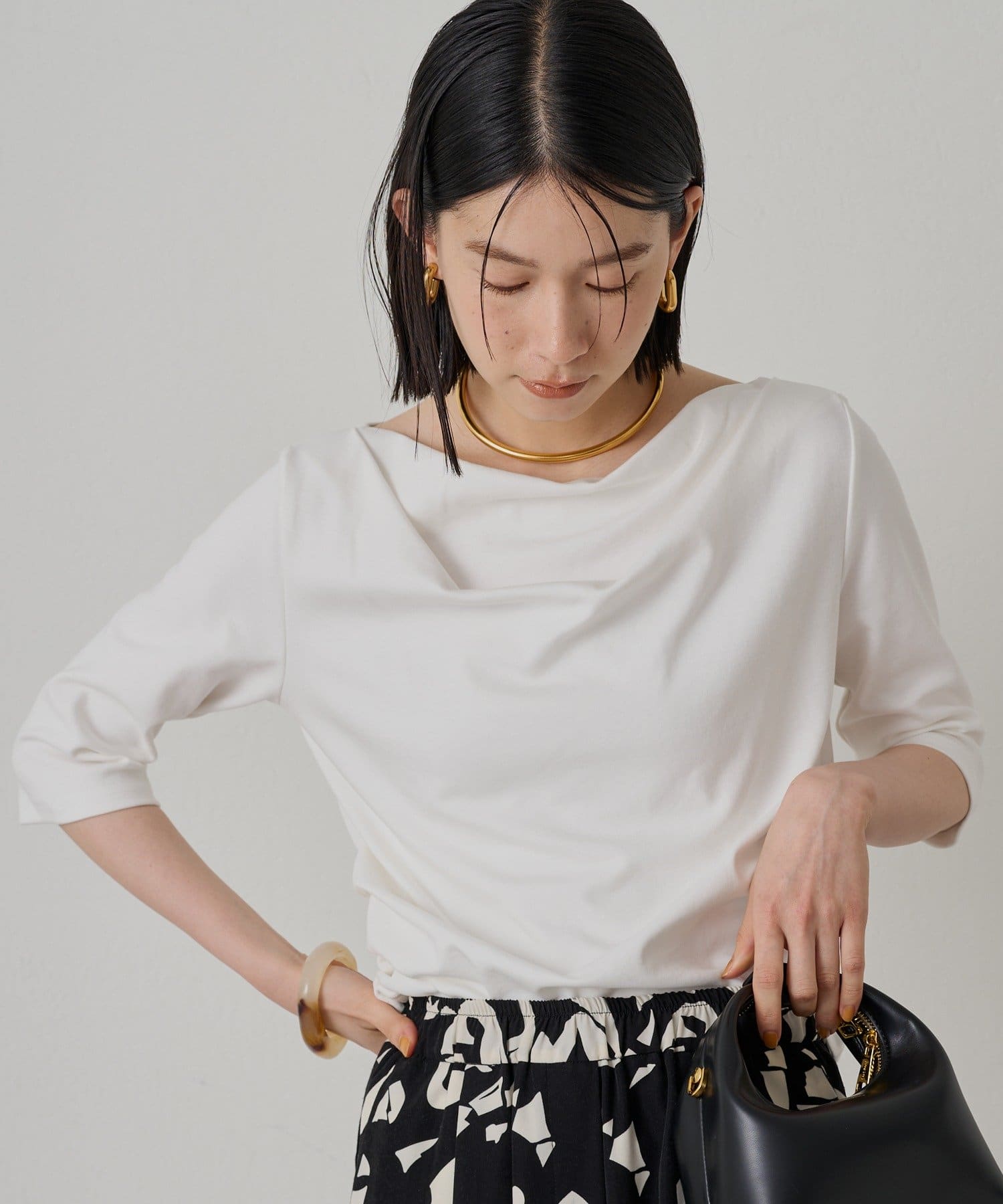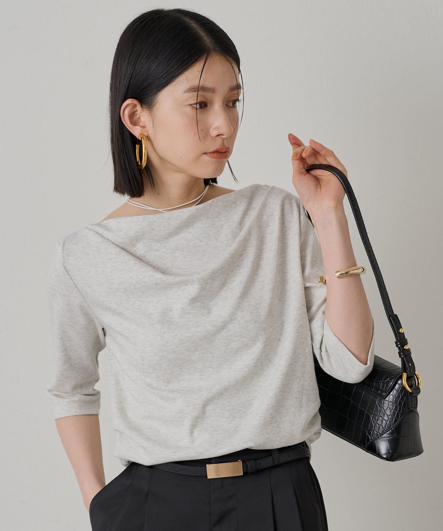 程よい伸縮性があり、快適な着心地です。七分袖で、手首を華奢に見せてくれる効果も。