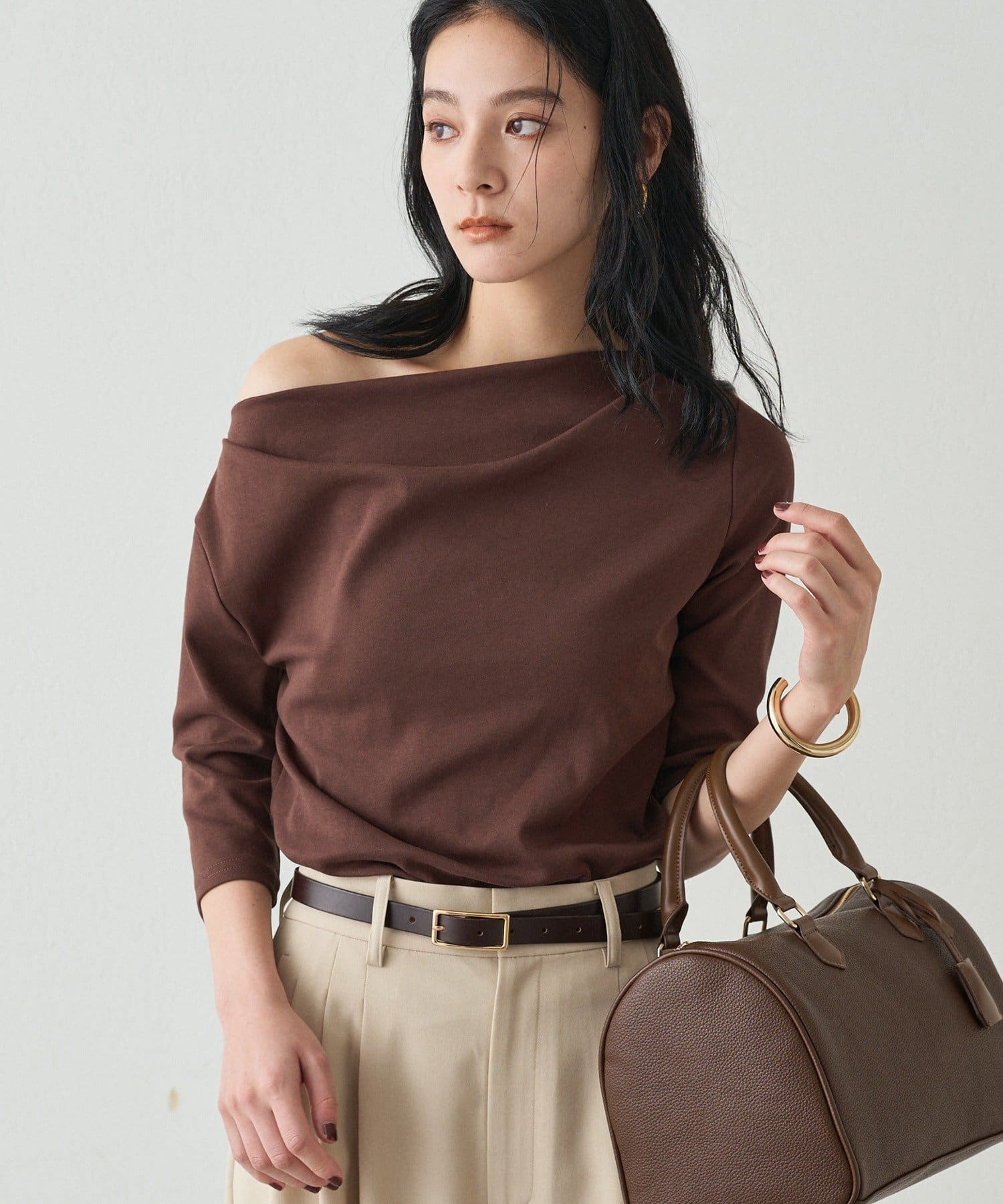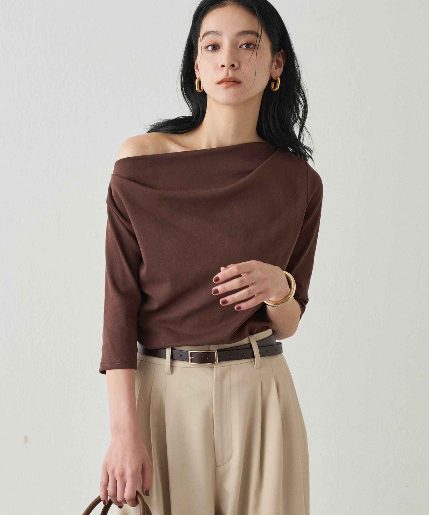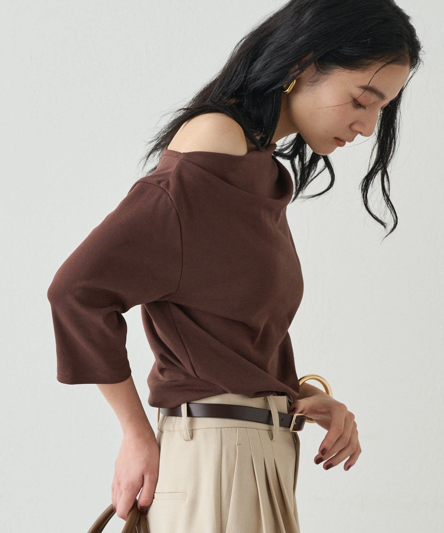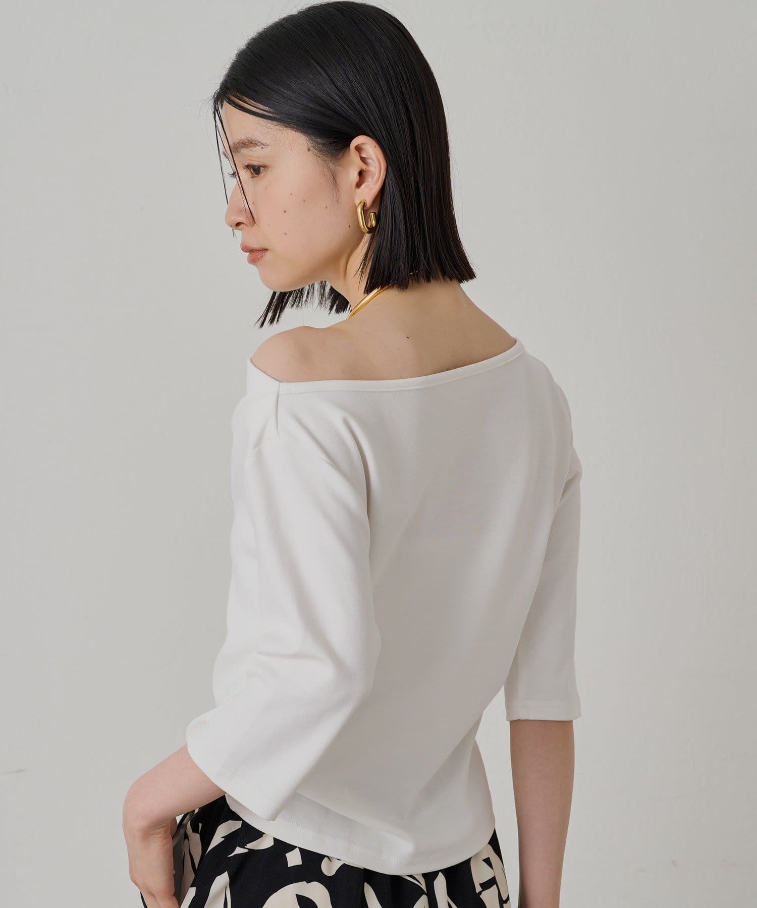 オフショルダーにも、片方の肩を見せてワンショルダーにも、ご着用できますので、ご気分で着方を変えて楽しんでいただけます。