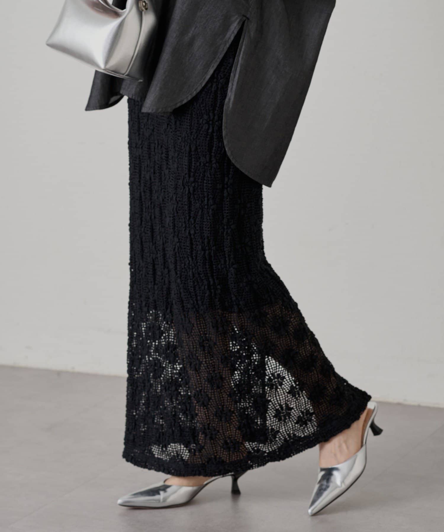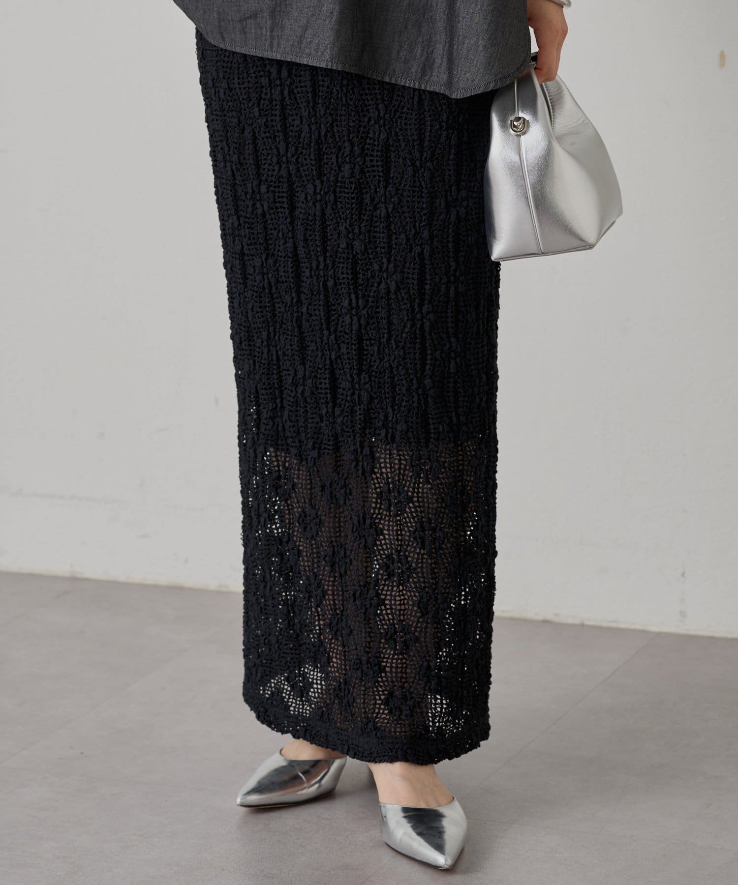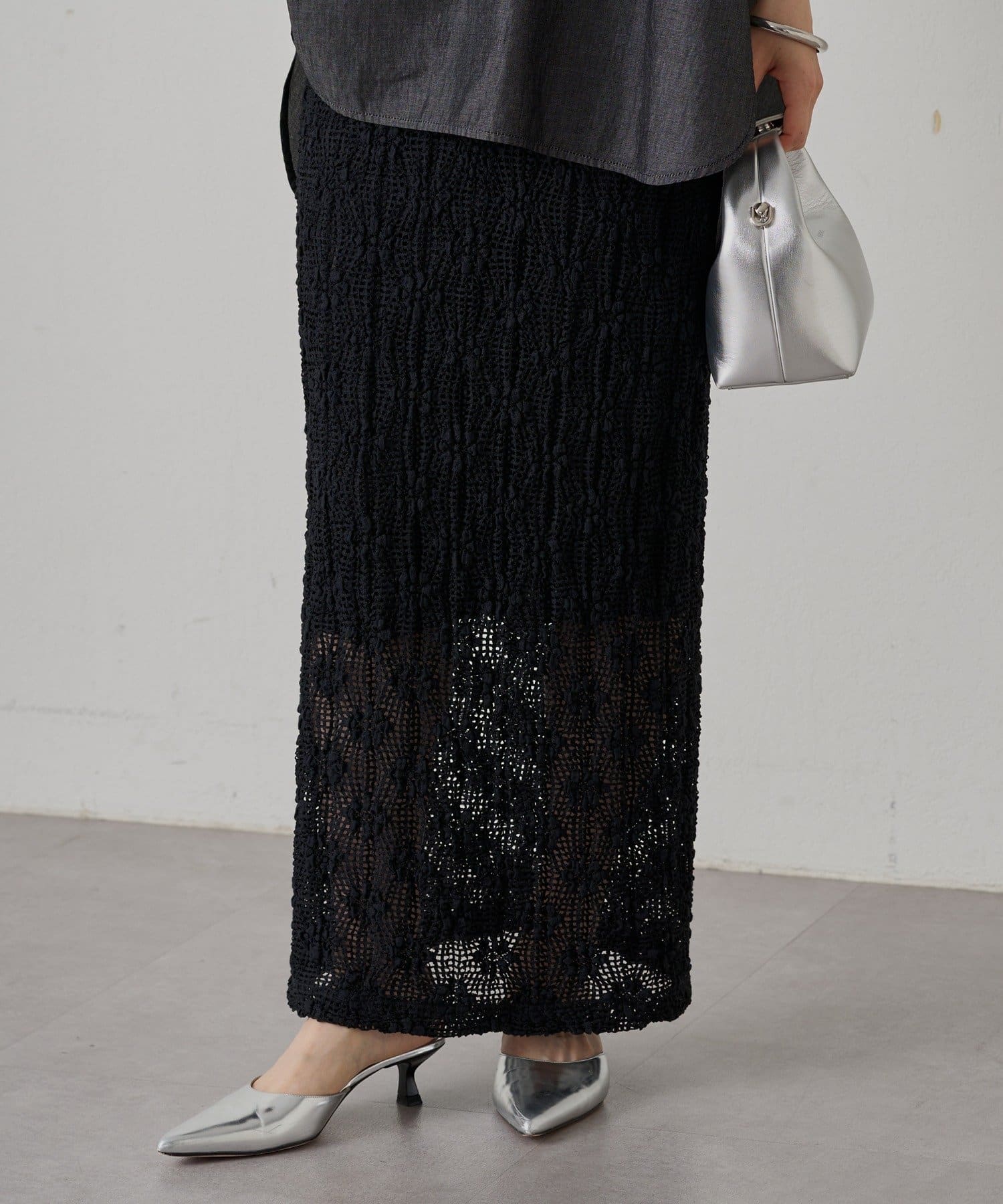 透け感のあるIラインのシルエットのレーススカート 透かし編みニット素材で、涼しげで春夏にぴったりのスカート。マキシ丈で、リラックス感のある印象を与えます。ウエストはゴム仕様で、着心地も快適です。