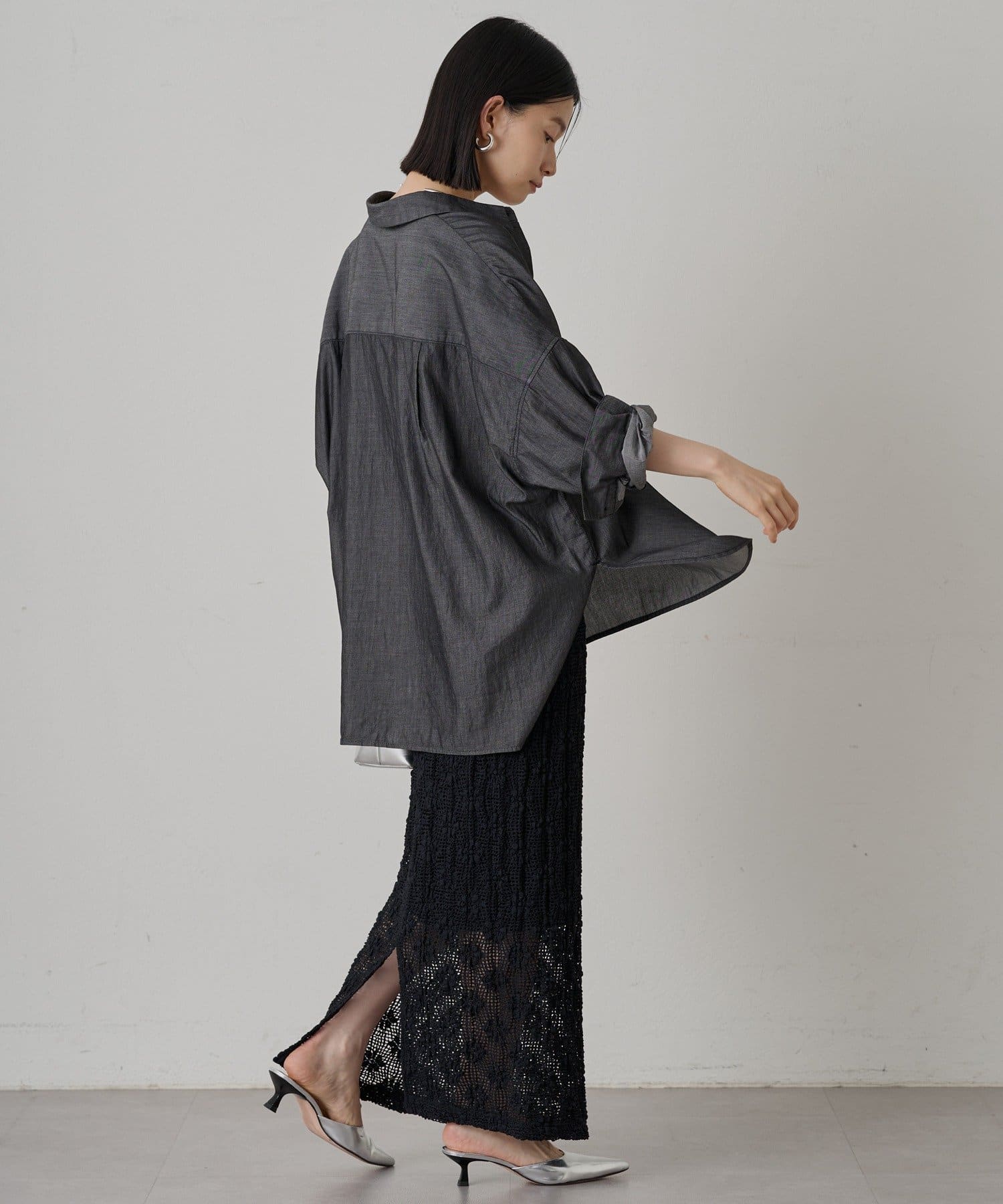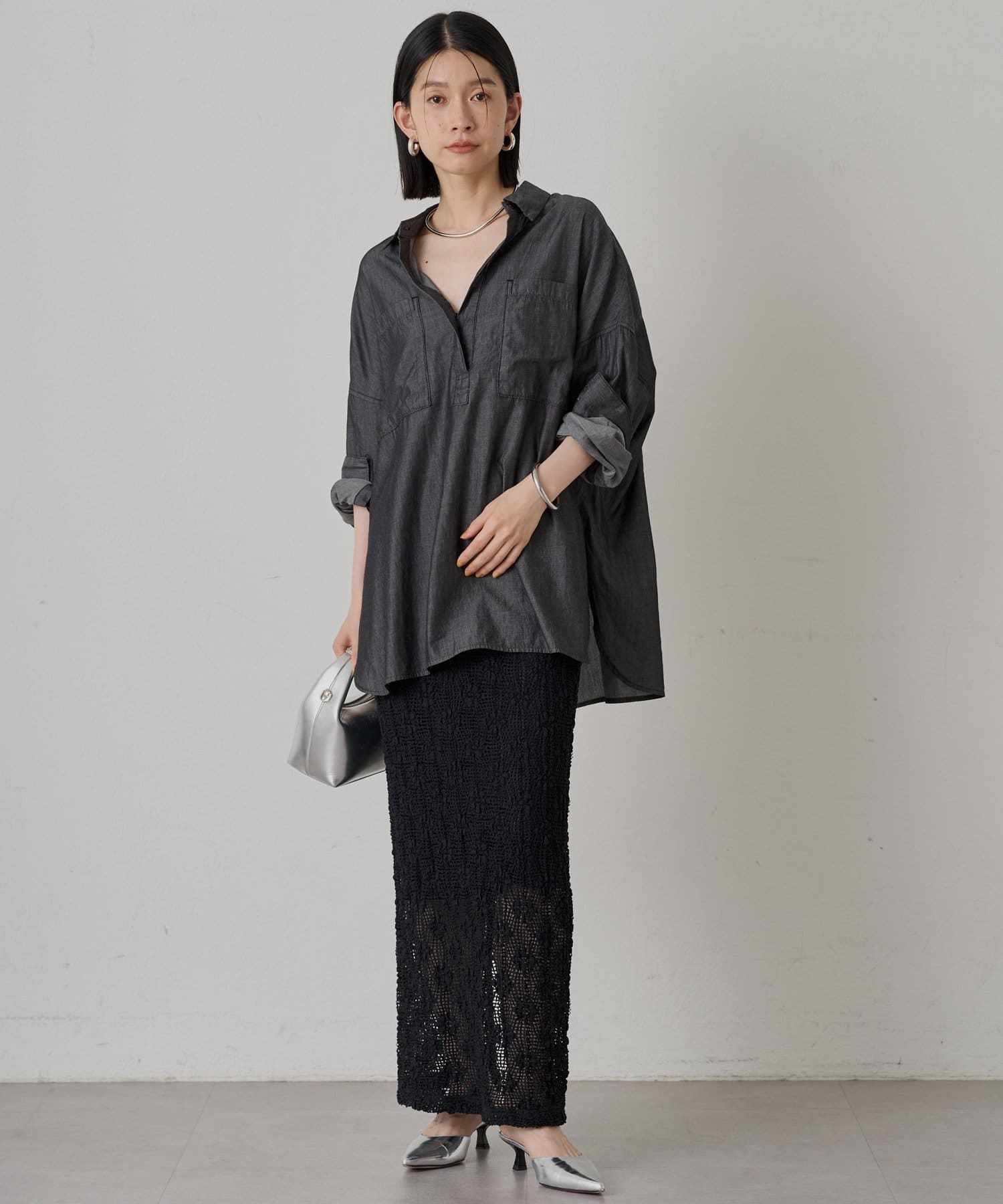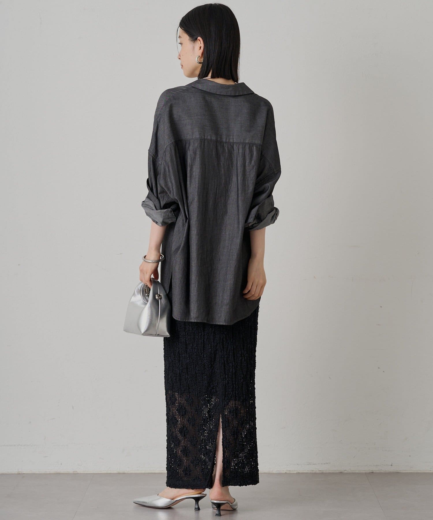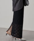 透け感のあるIラインのシルエットのレーススカート 透かし編みニット素材で、涼しげで春夏にぴったりのスカート。マキシ丈で、リラックス感のある印象を与えます。ウエストはゴム仕様で、着心地も快適です。