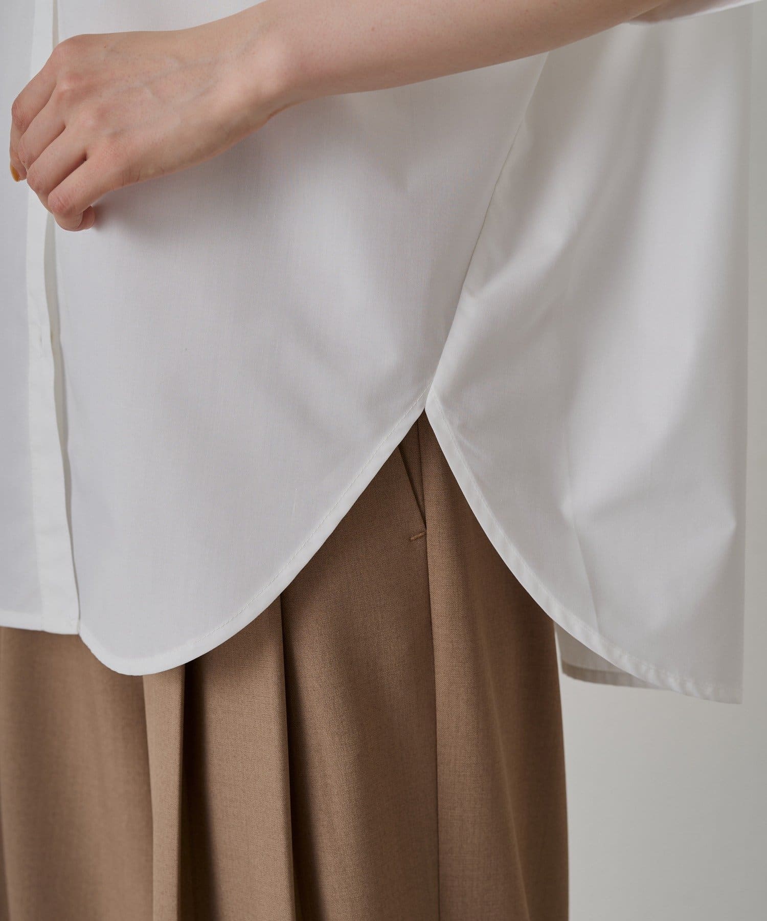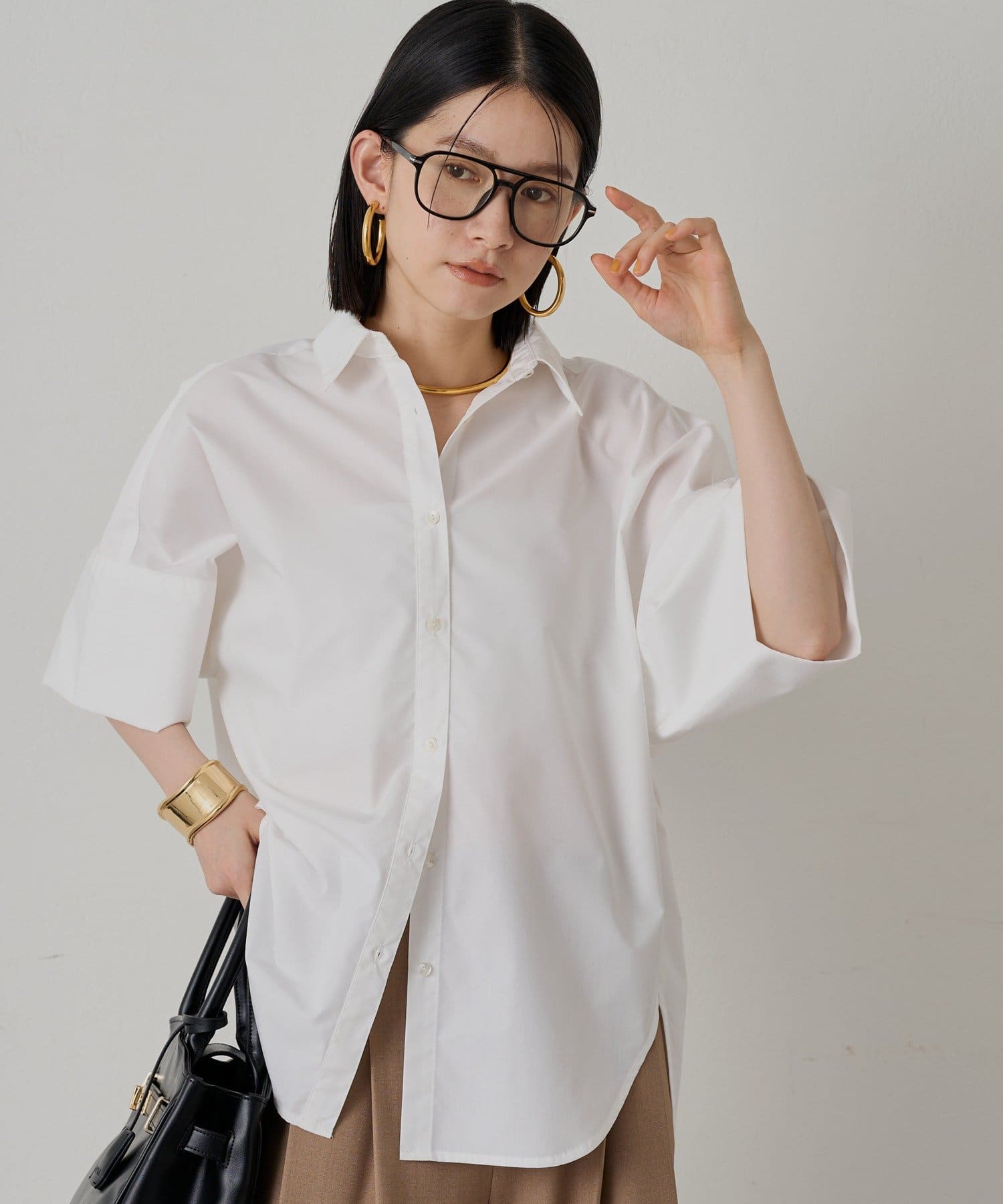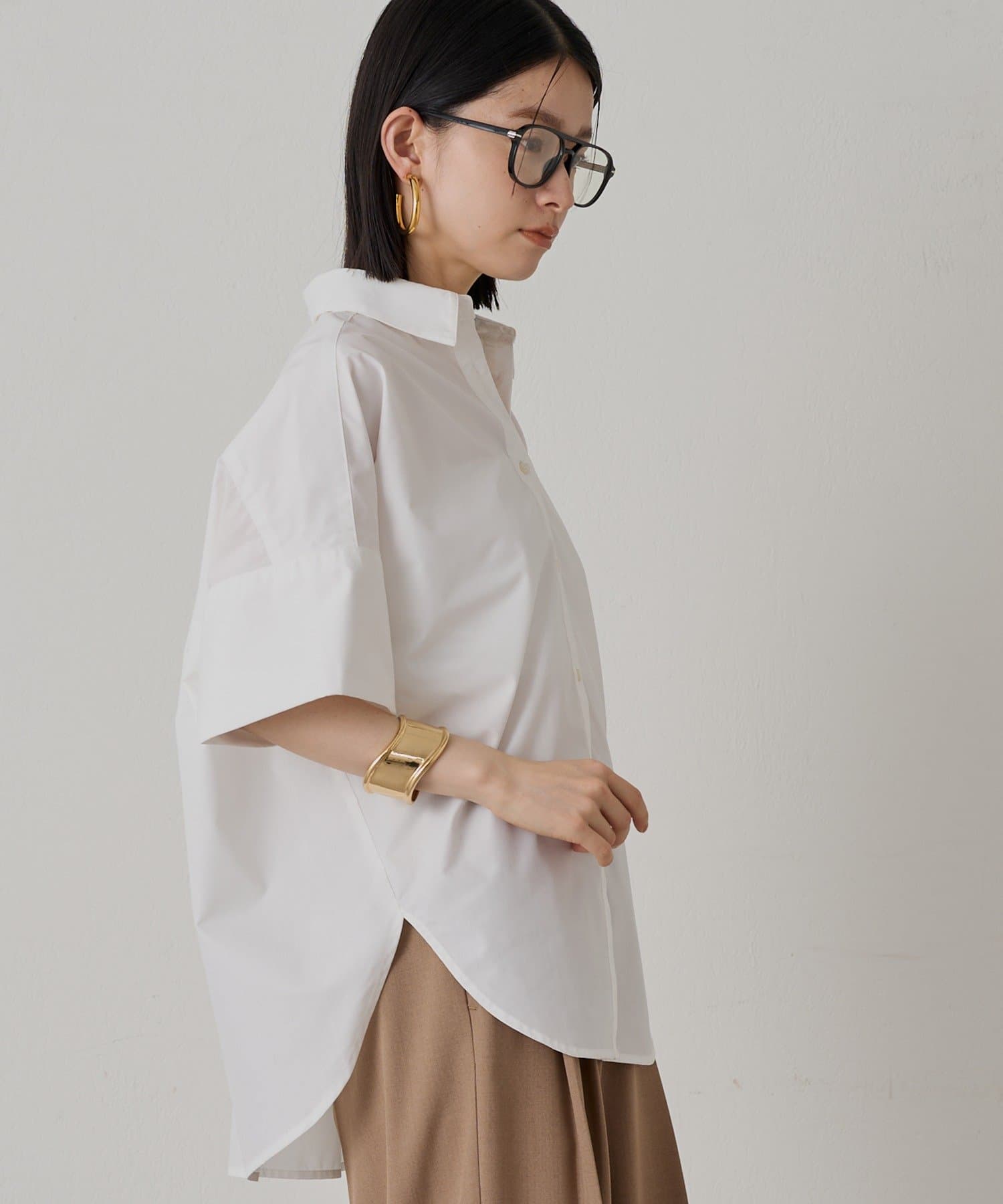 短めの袖丈と、少し広がった袖口が、さりげない個性をプラス。シンプルなシャツに遊び心を添えています。