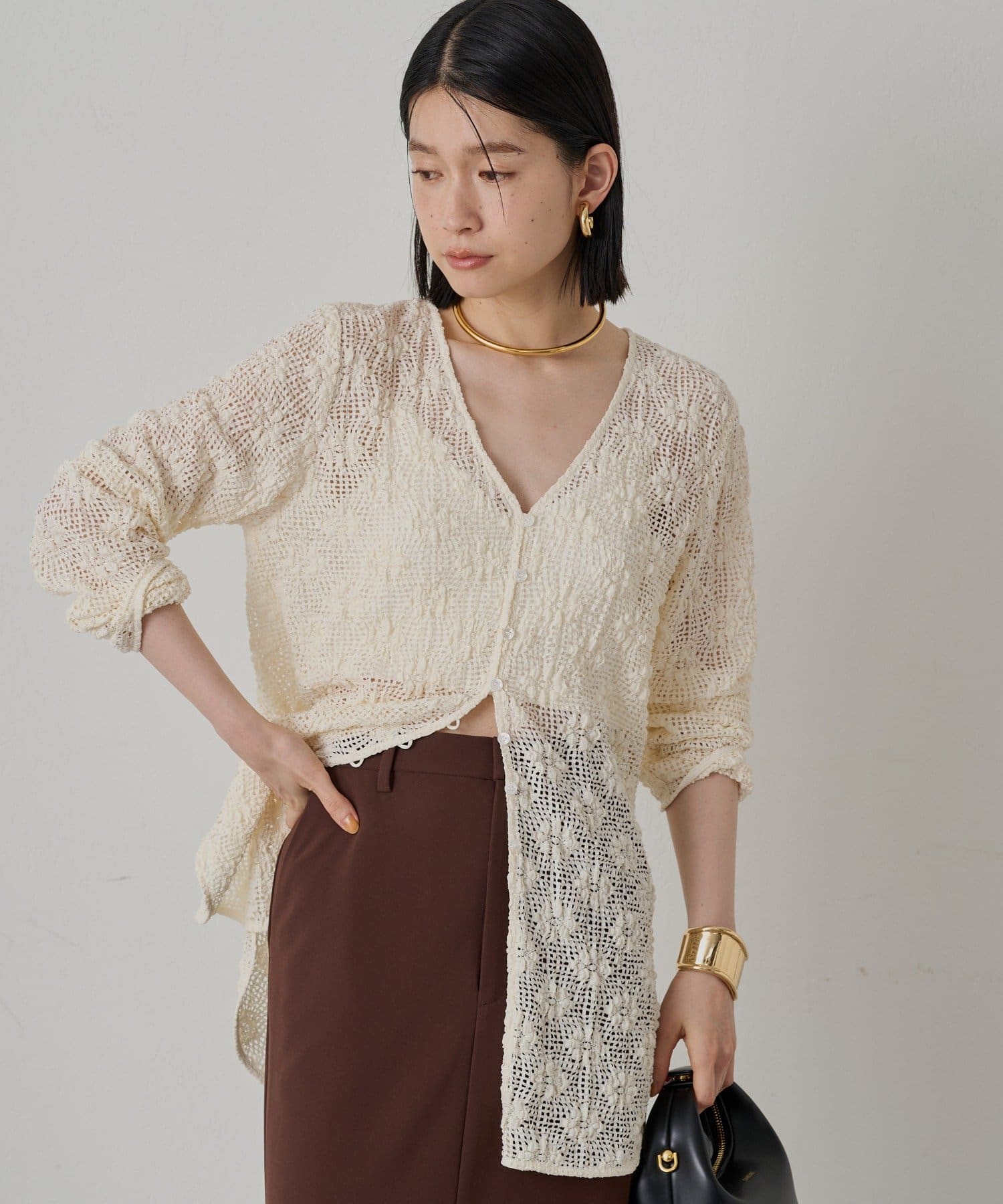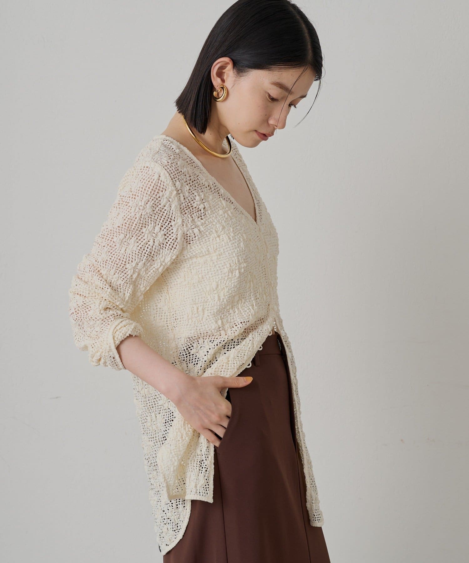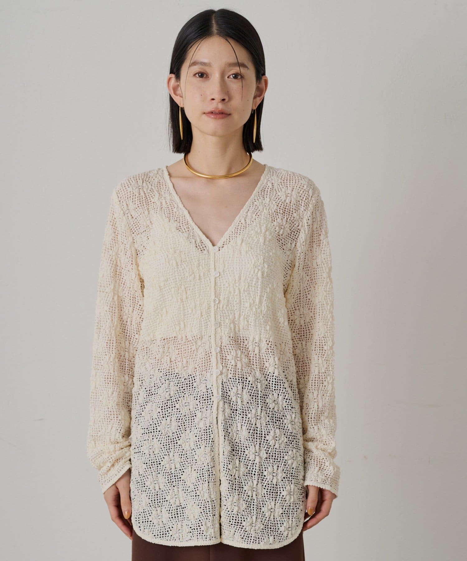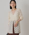 カットレースの繊細な透け感が特徴のレースブラウス Vネックで、女性らしいデコルテを演出できるブラウス。ボタンを留めてトップスとして着るのはもちろん、前を開けてカーディガンとして羽織ることもできる2WAY仕様です。
