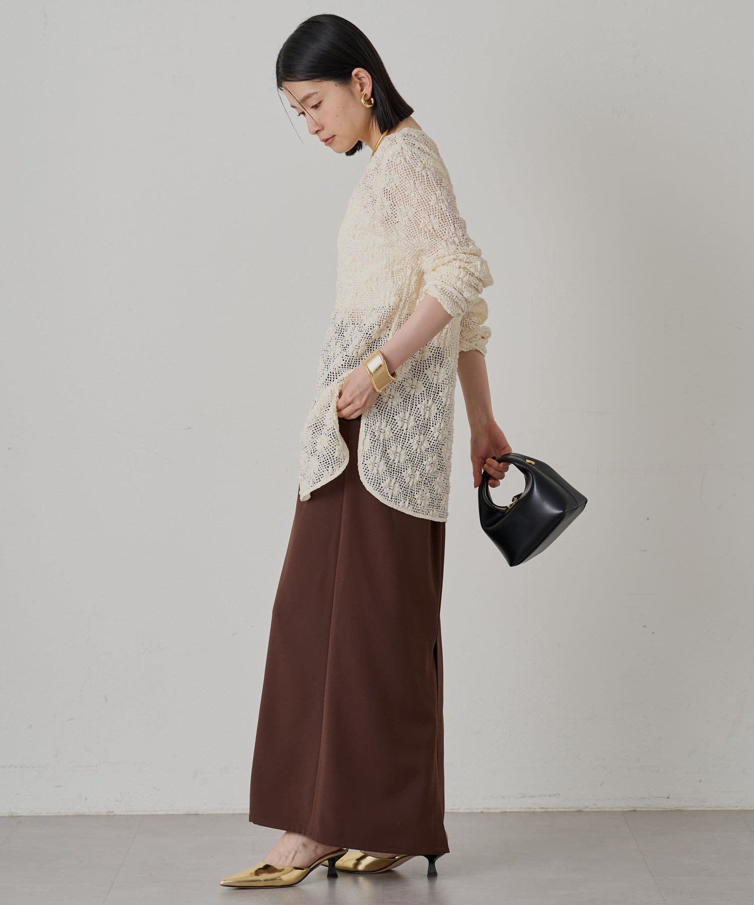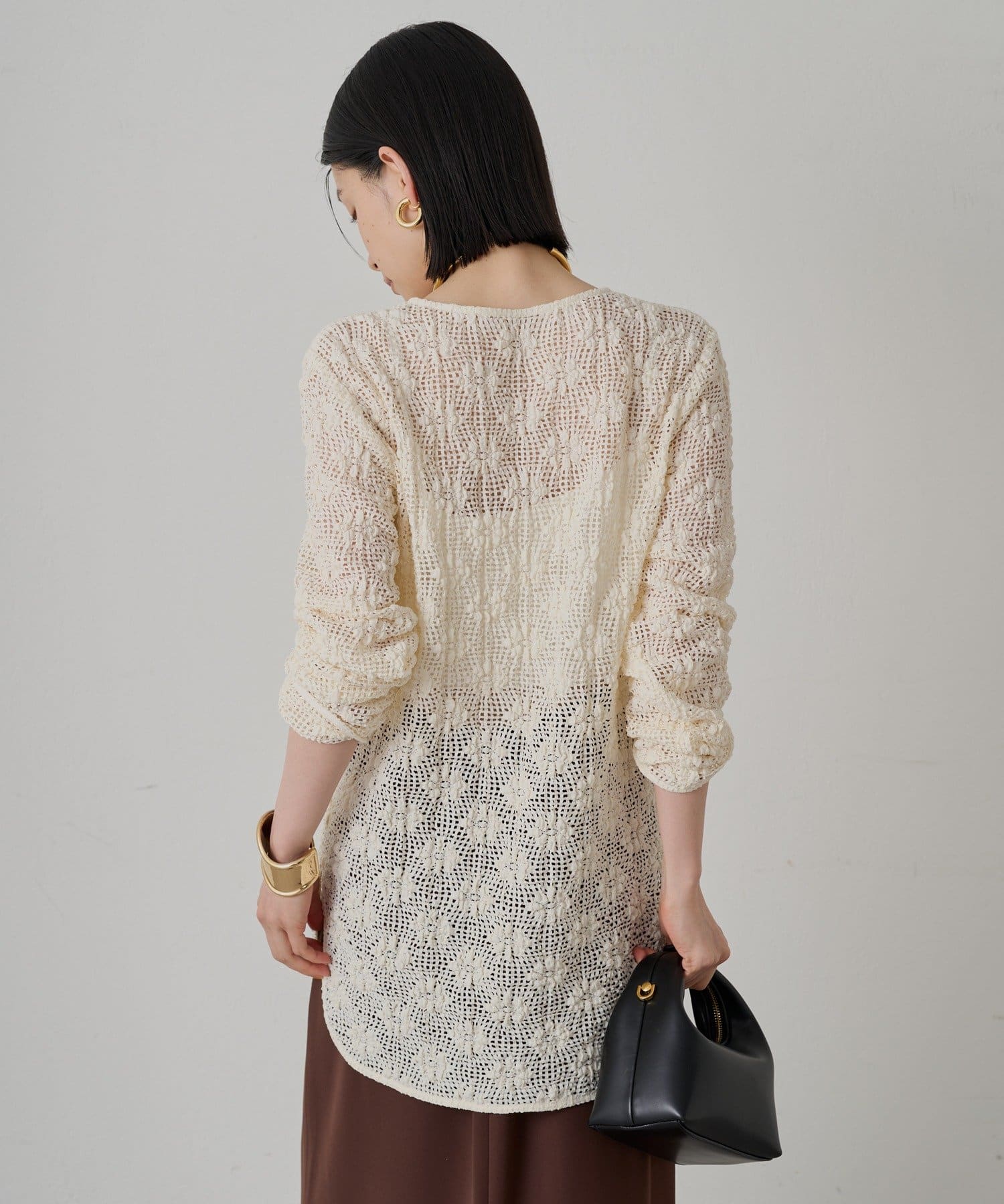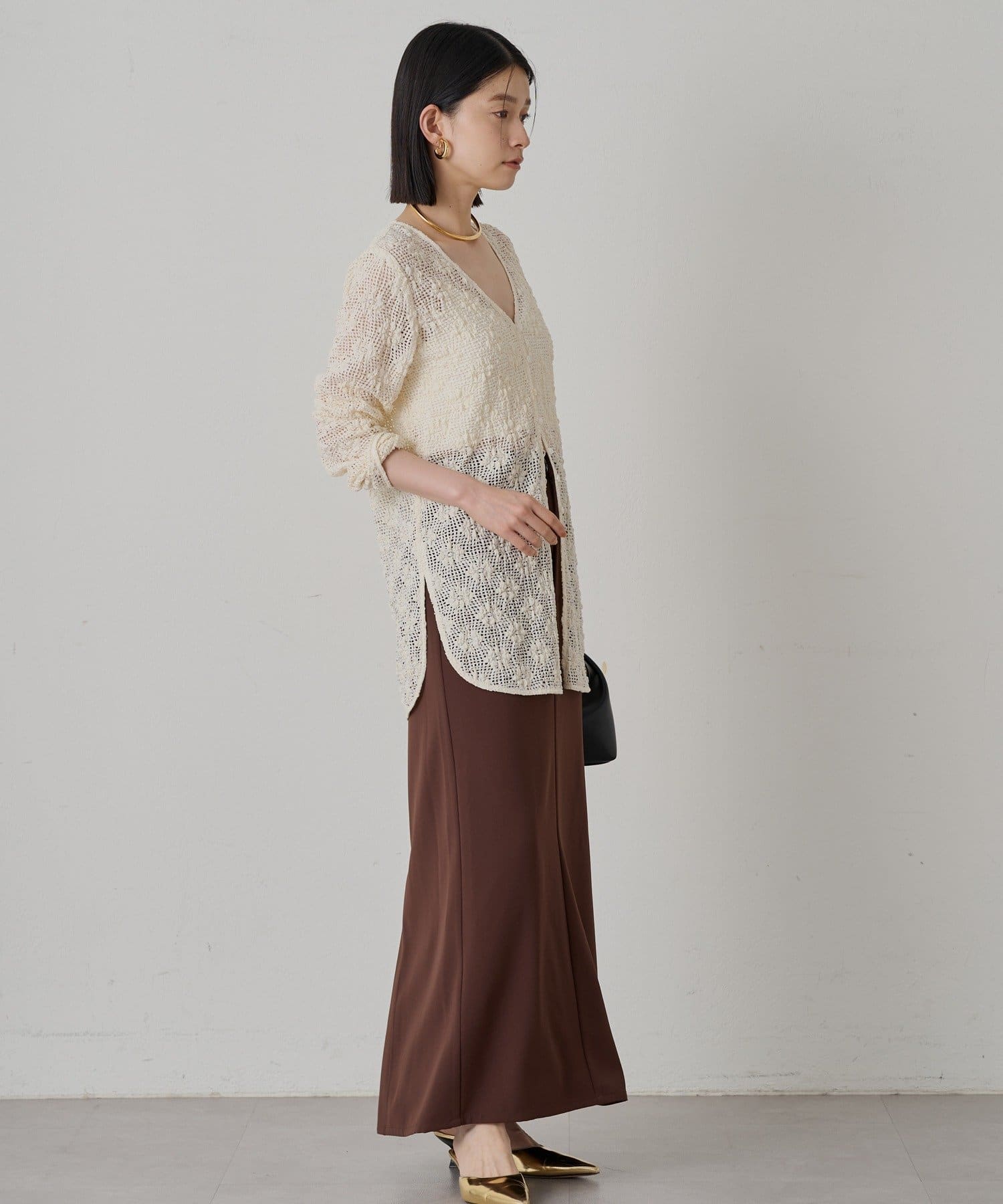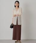セットアップのスカートと合わせていただくと、女性らしい着こなしができます。インナーにキャミソールやタンクトップを合わせて、透け感を楽しむのがおすすめです。パンツやデニムで合わせていただいても、カジュアルで抜け感のあるスタイルを楽しんでいただけます。