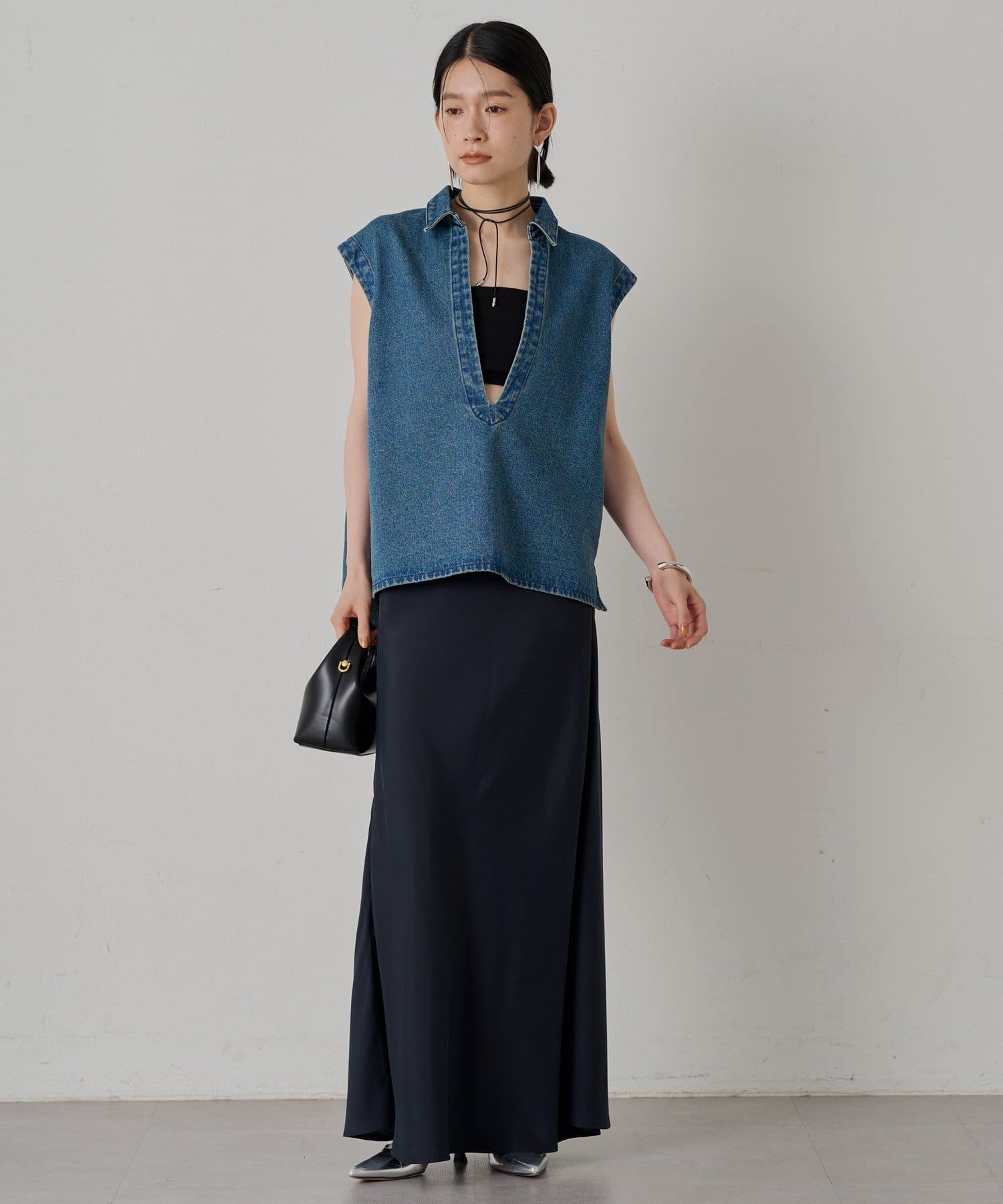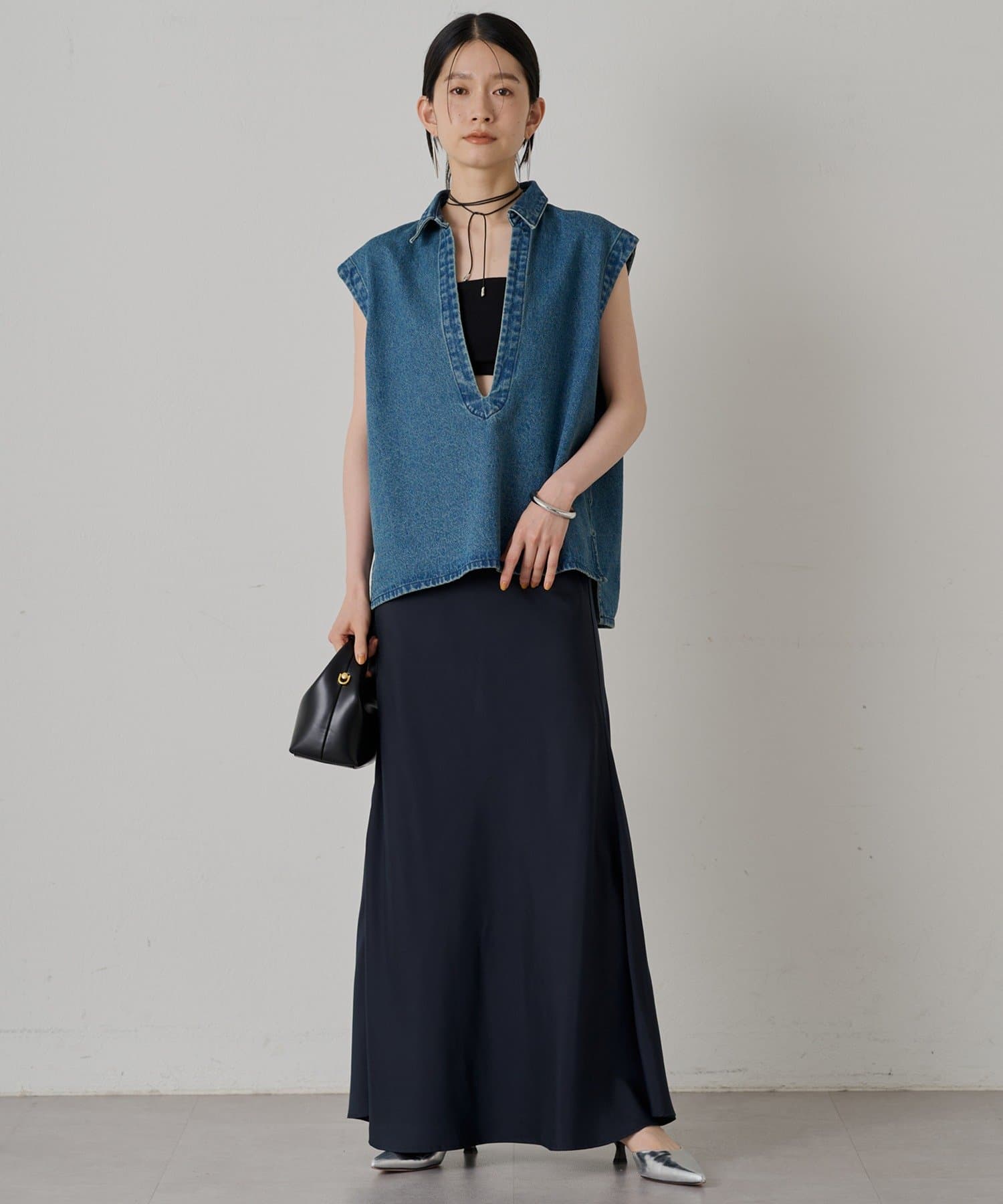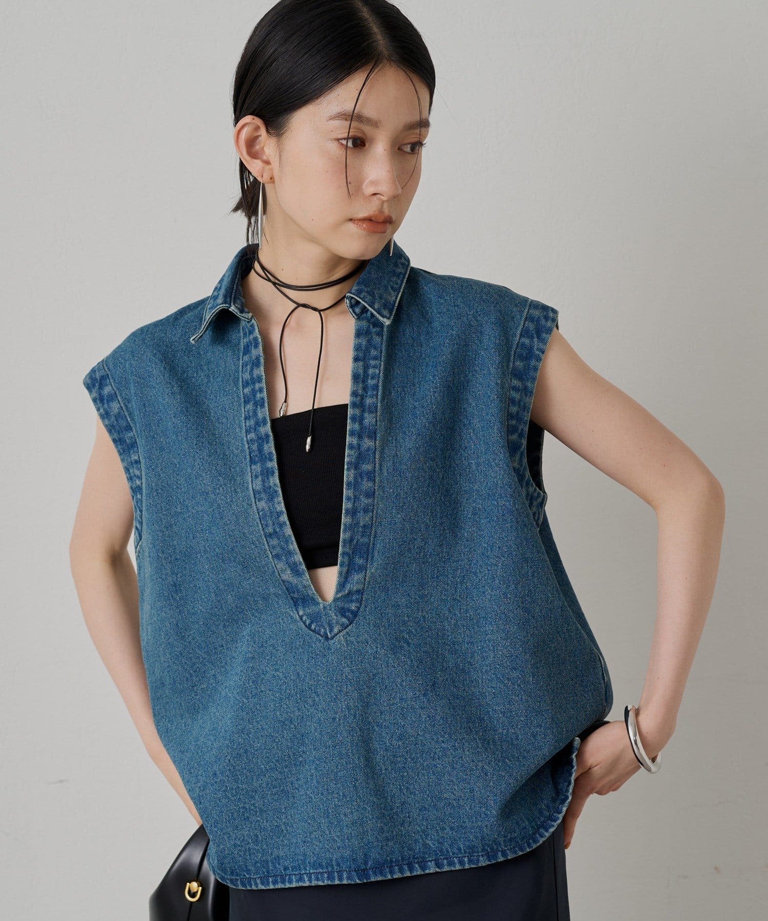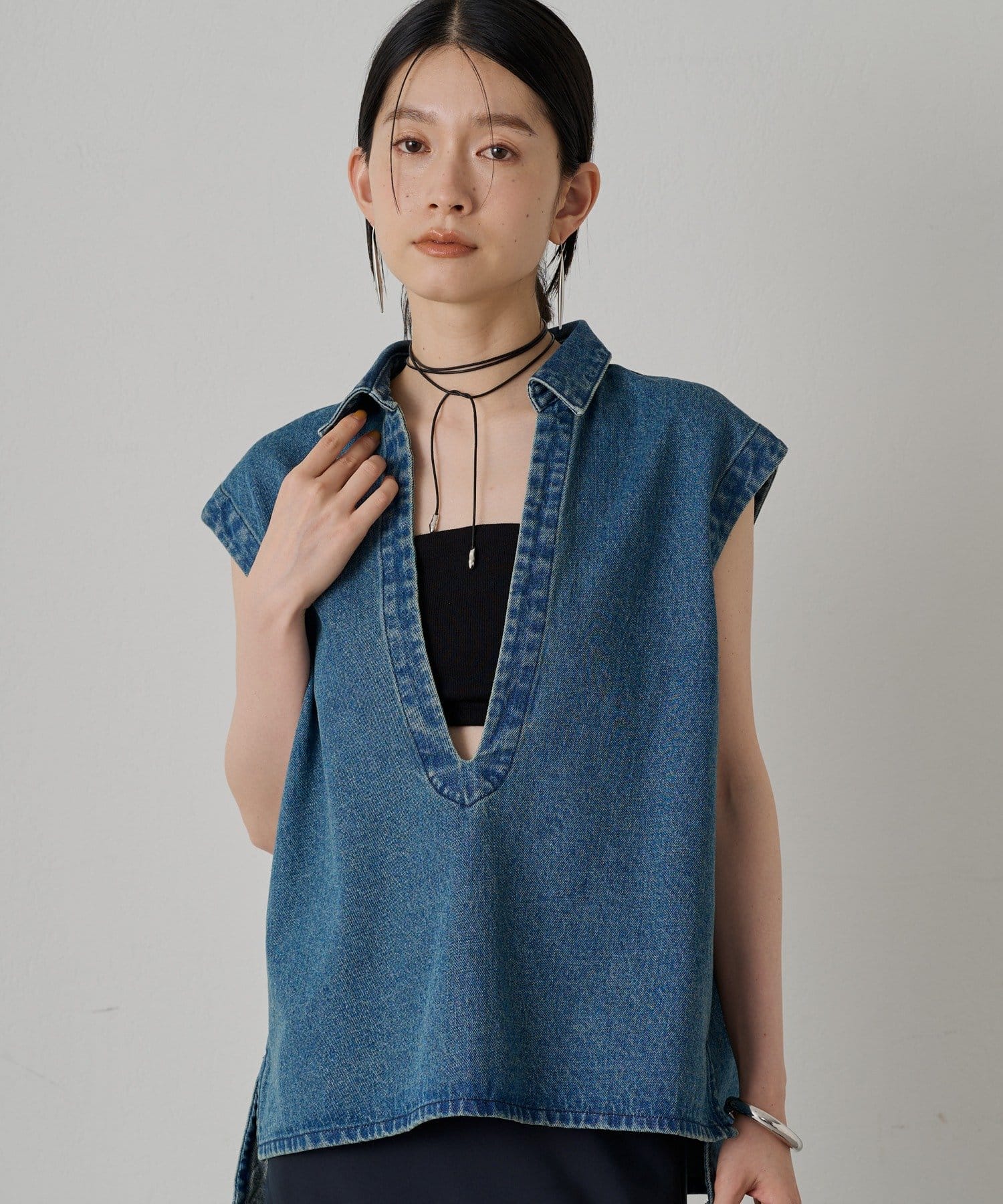 デコルテを美しく見せ、女性らしさを引き立てます。インナーにタンクトップやブラトップを合わせれば、ヘルシーな肌見せスタイルに。