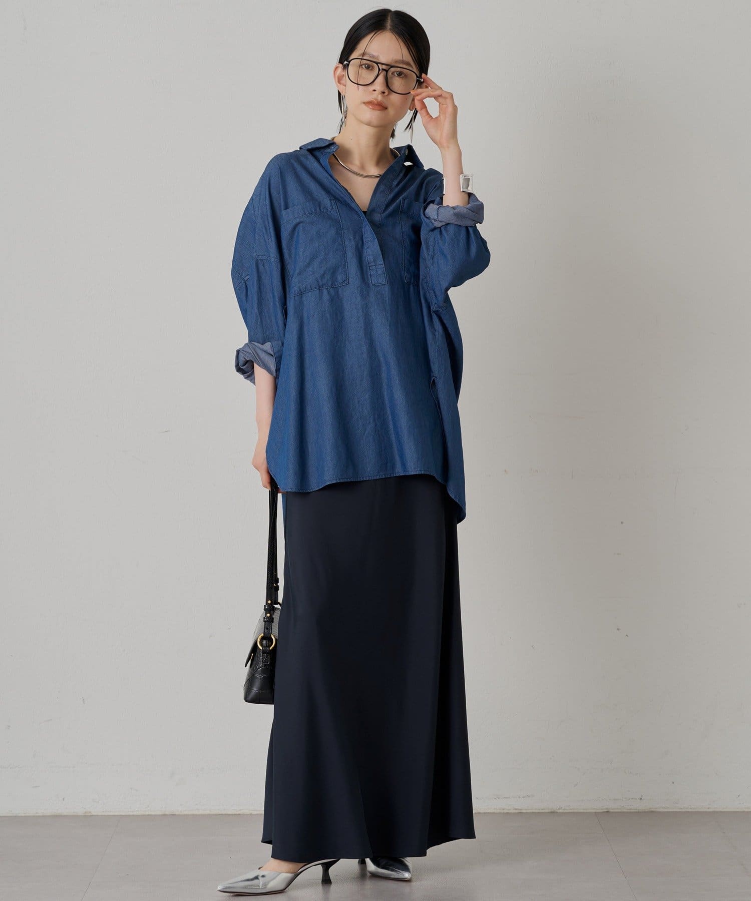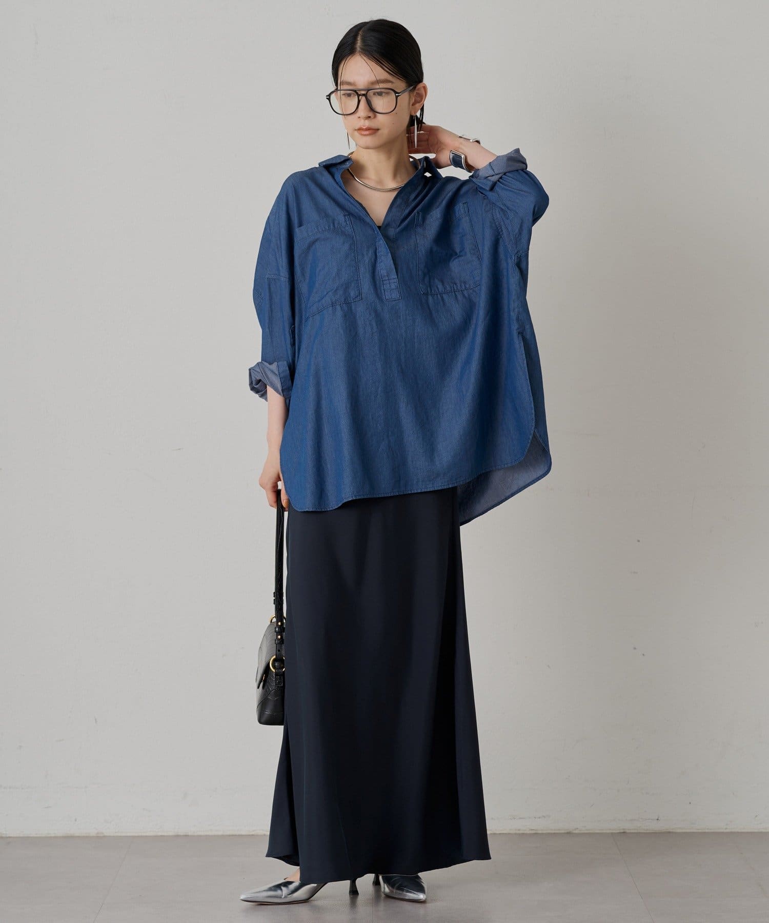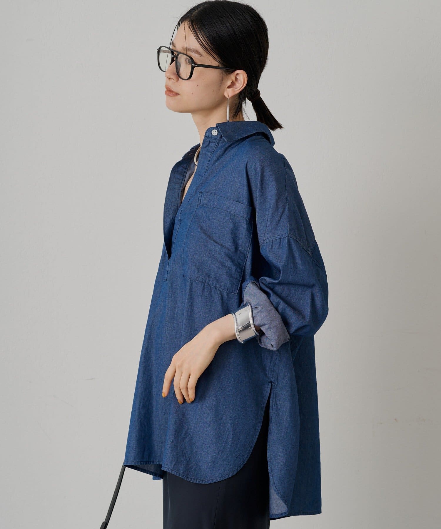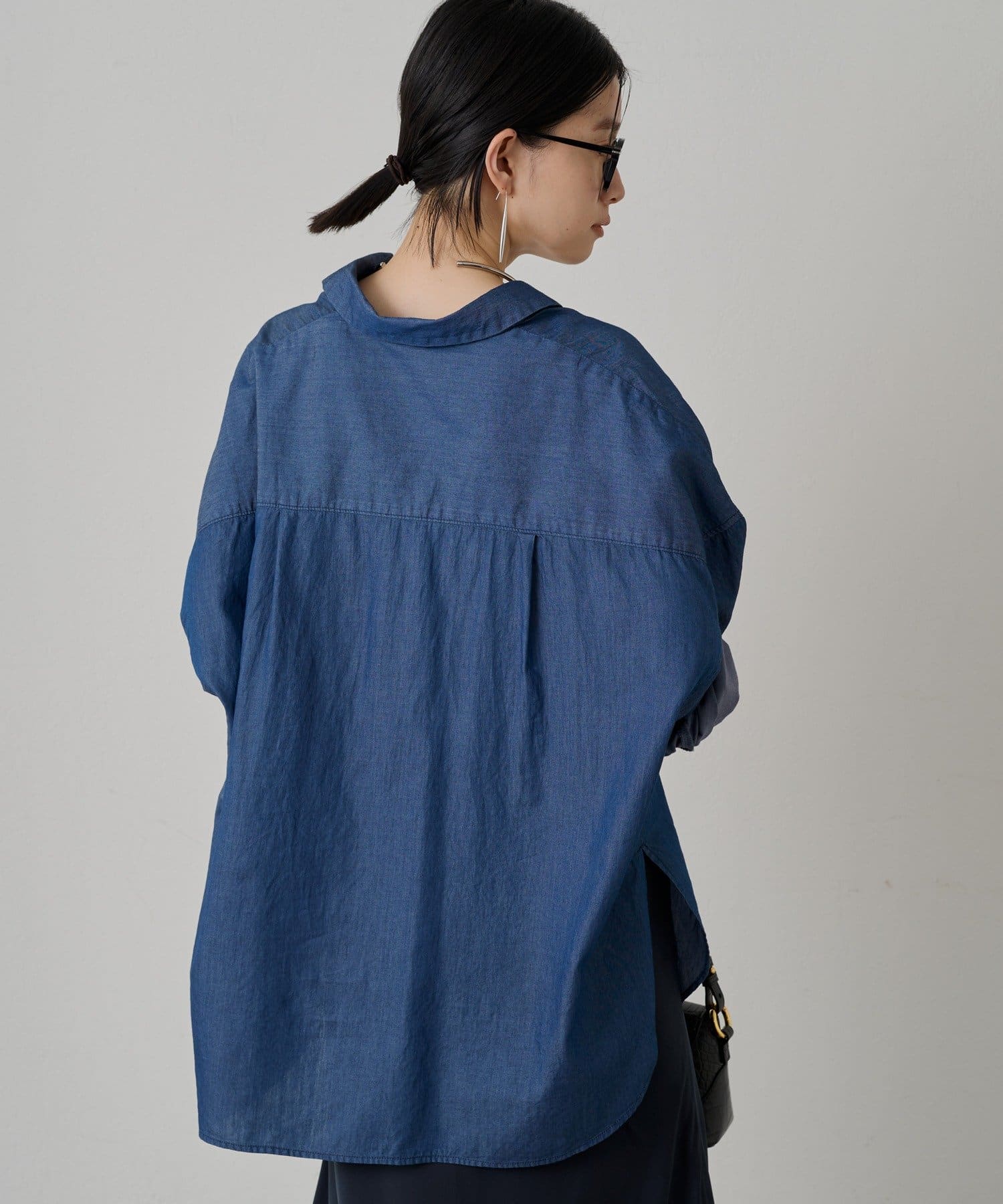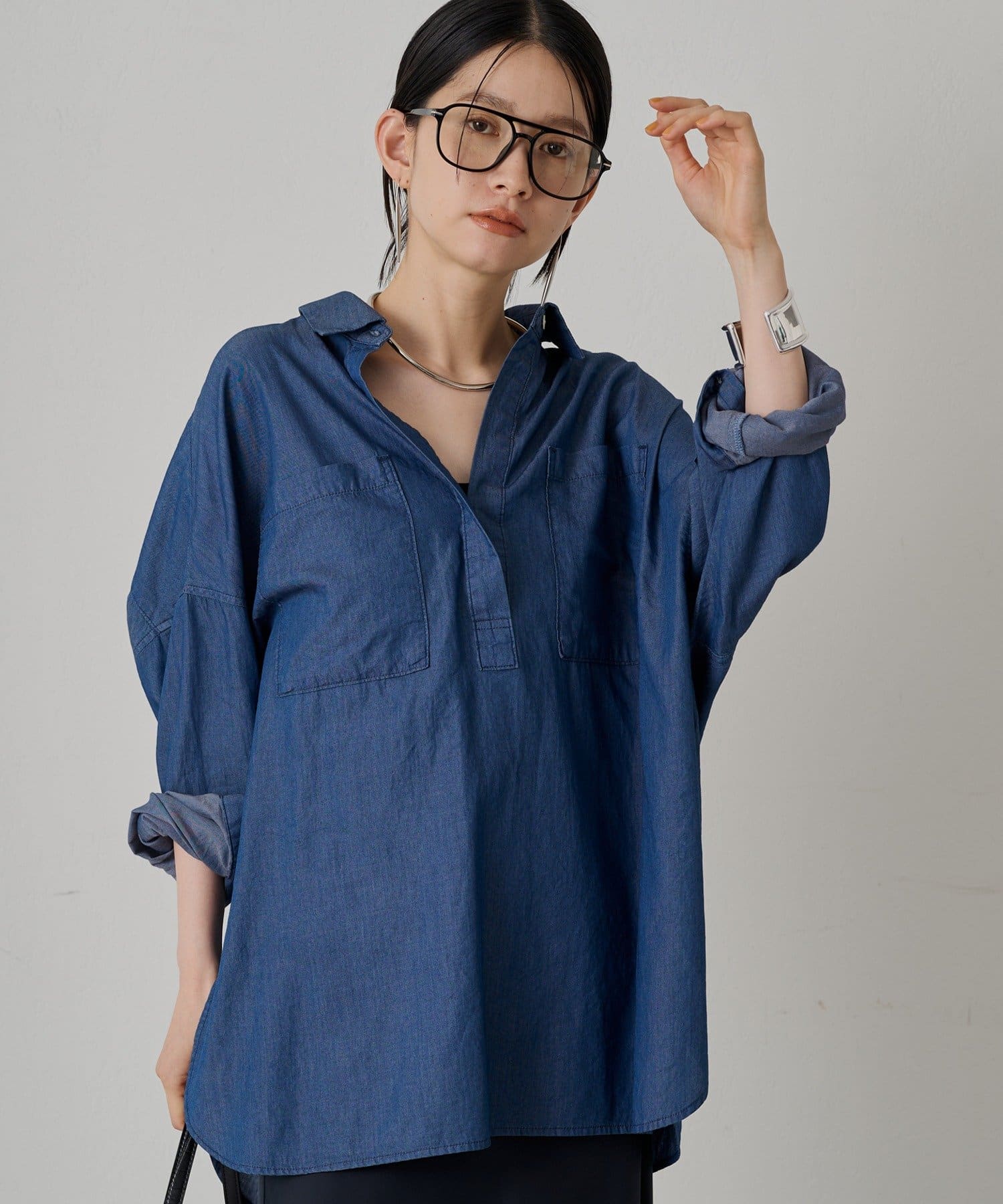 首元をすっきりと見せるカジュアルながらも女性らしいデニムシャツ