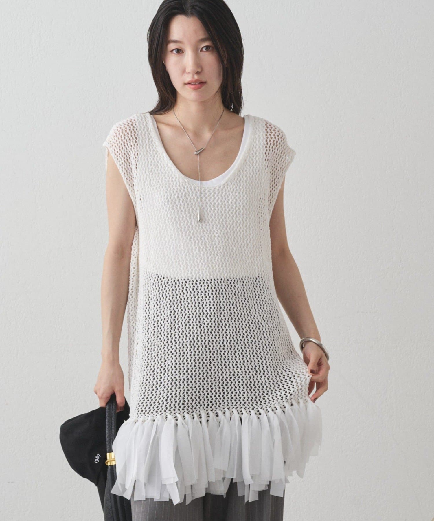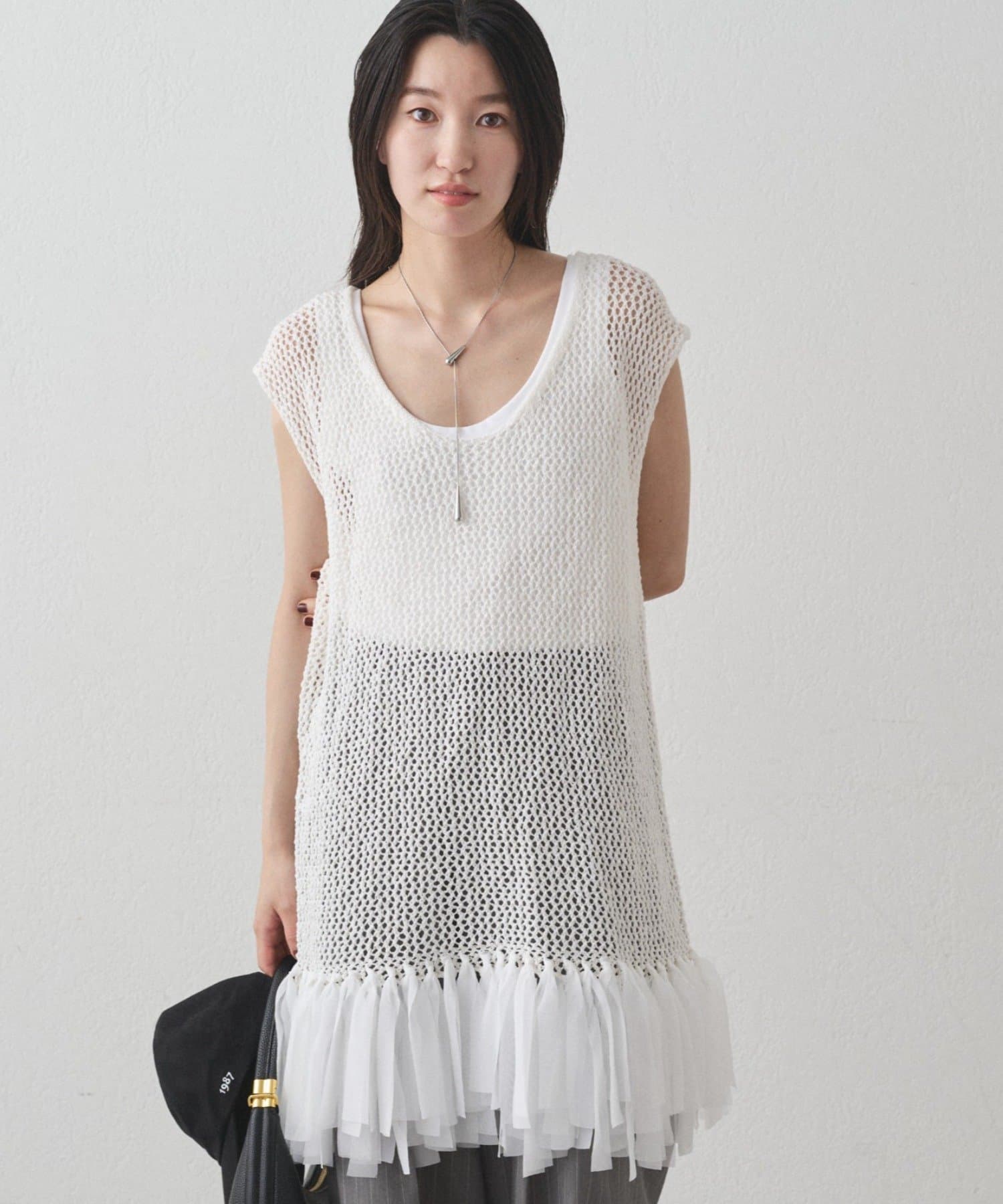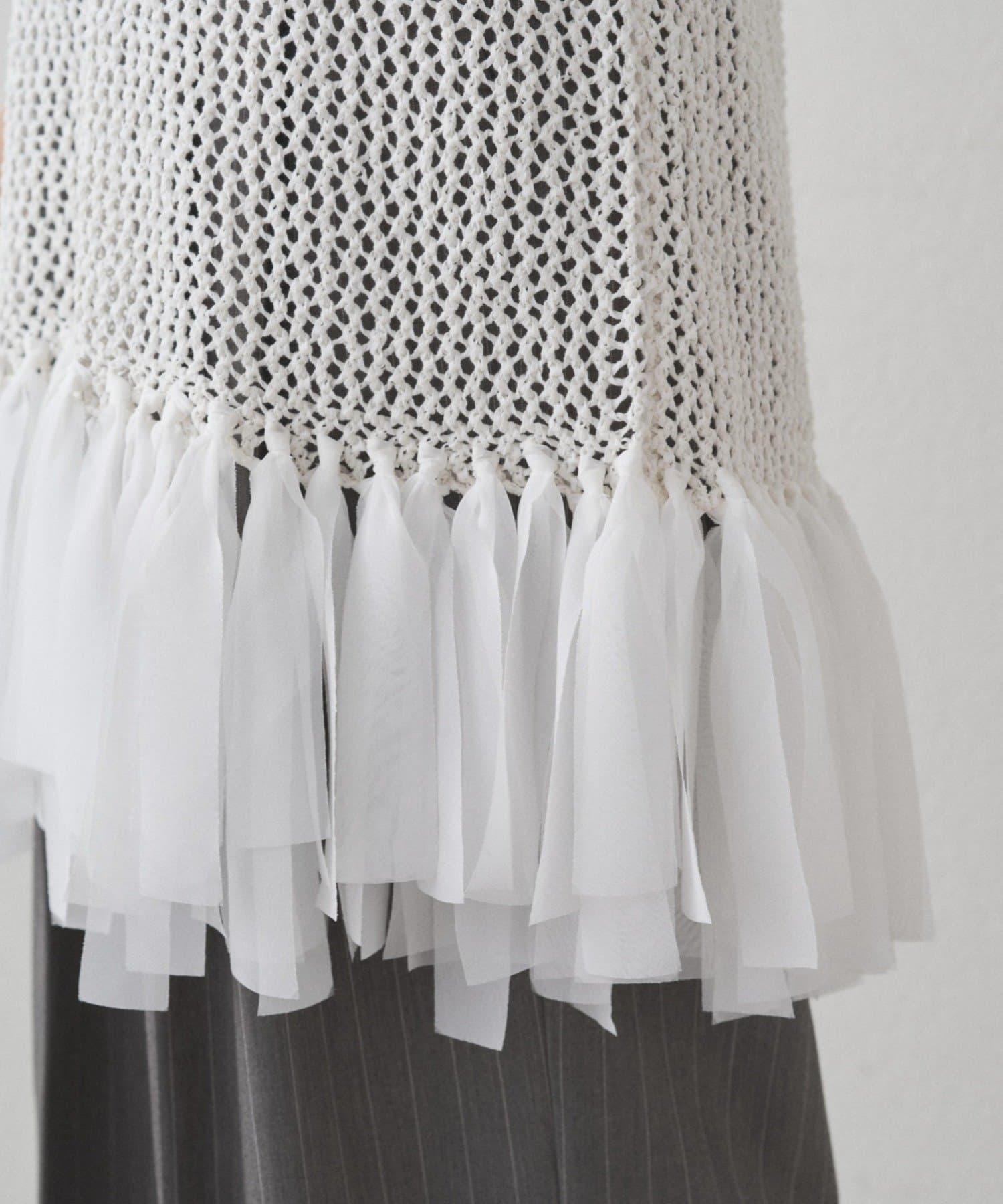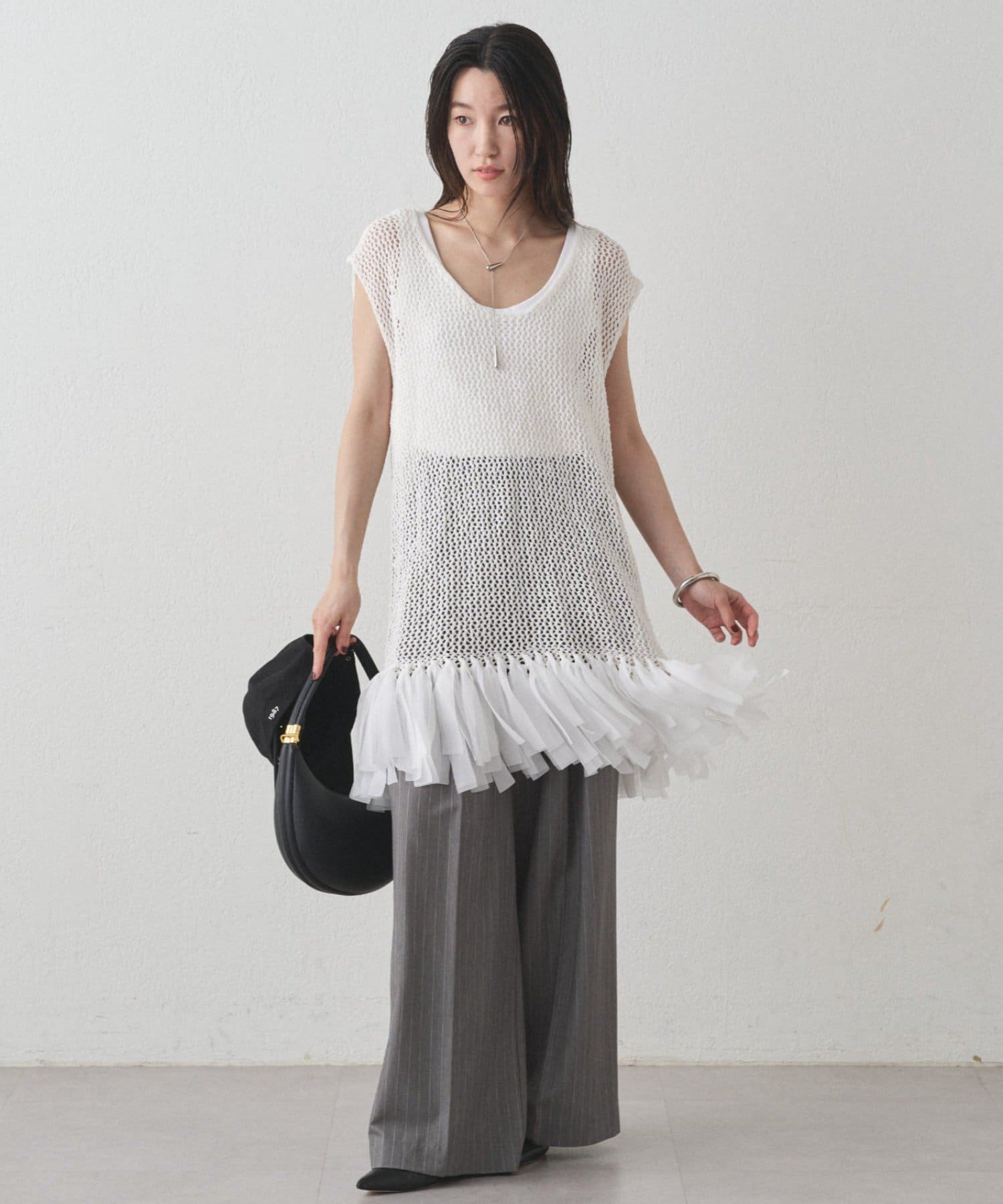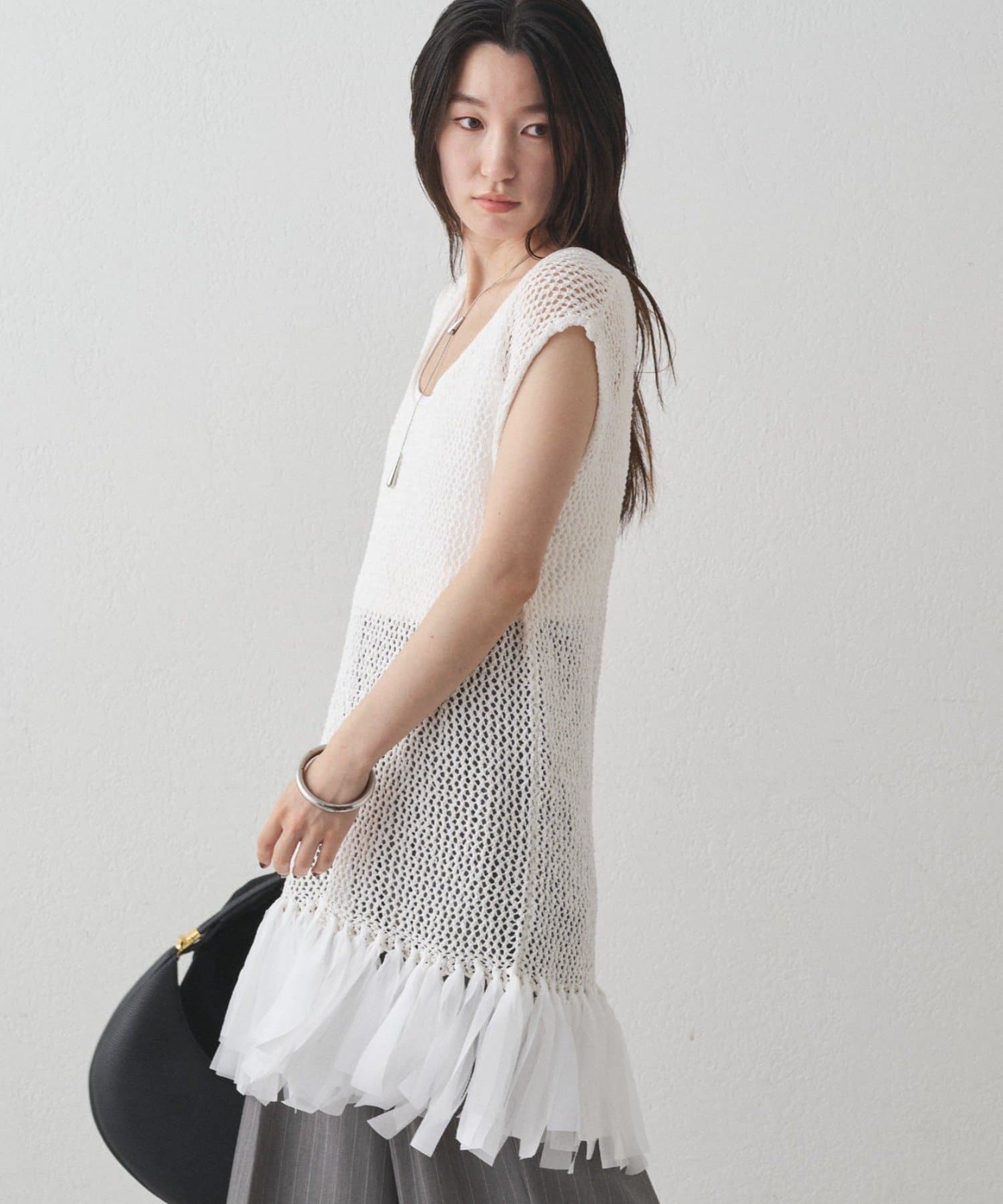 ざっくりと編まれた透け感のあるニットに、裾のフリンジがドラマティックな表情をプラスしてくれます。