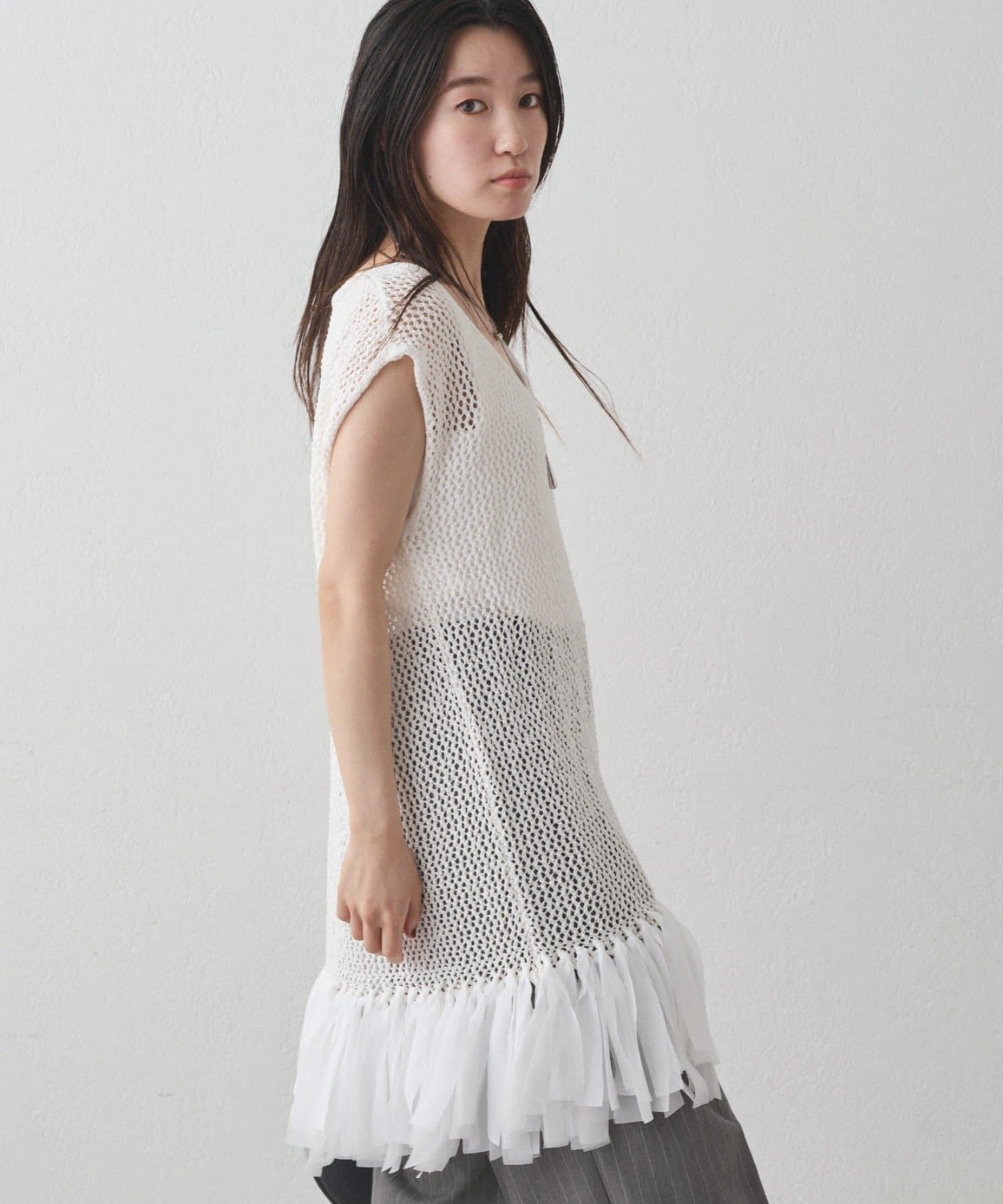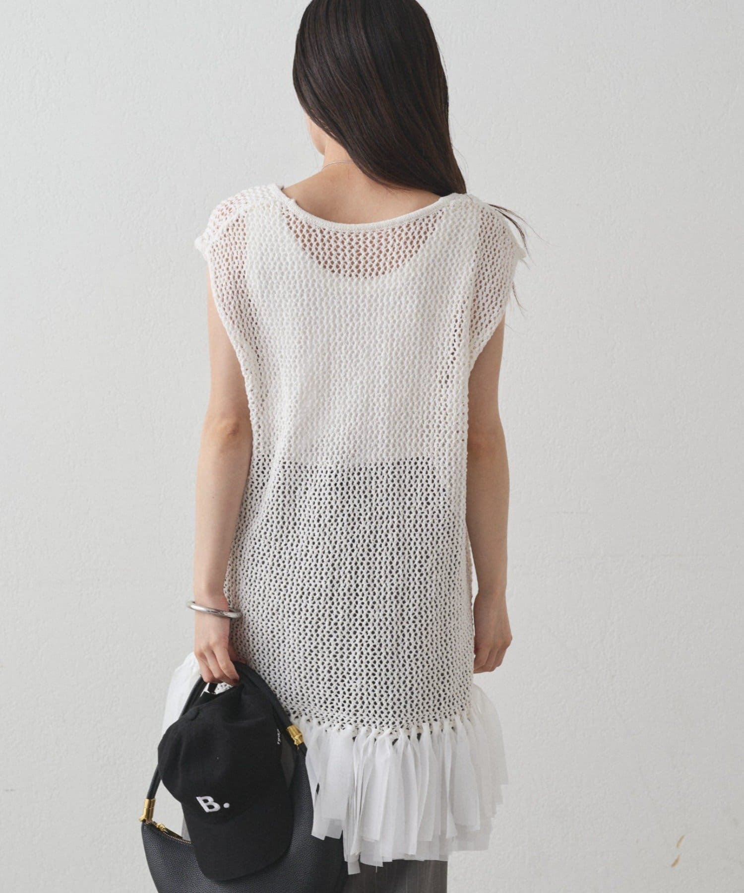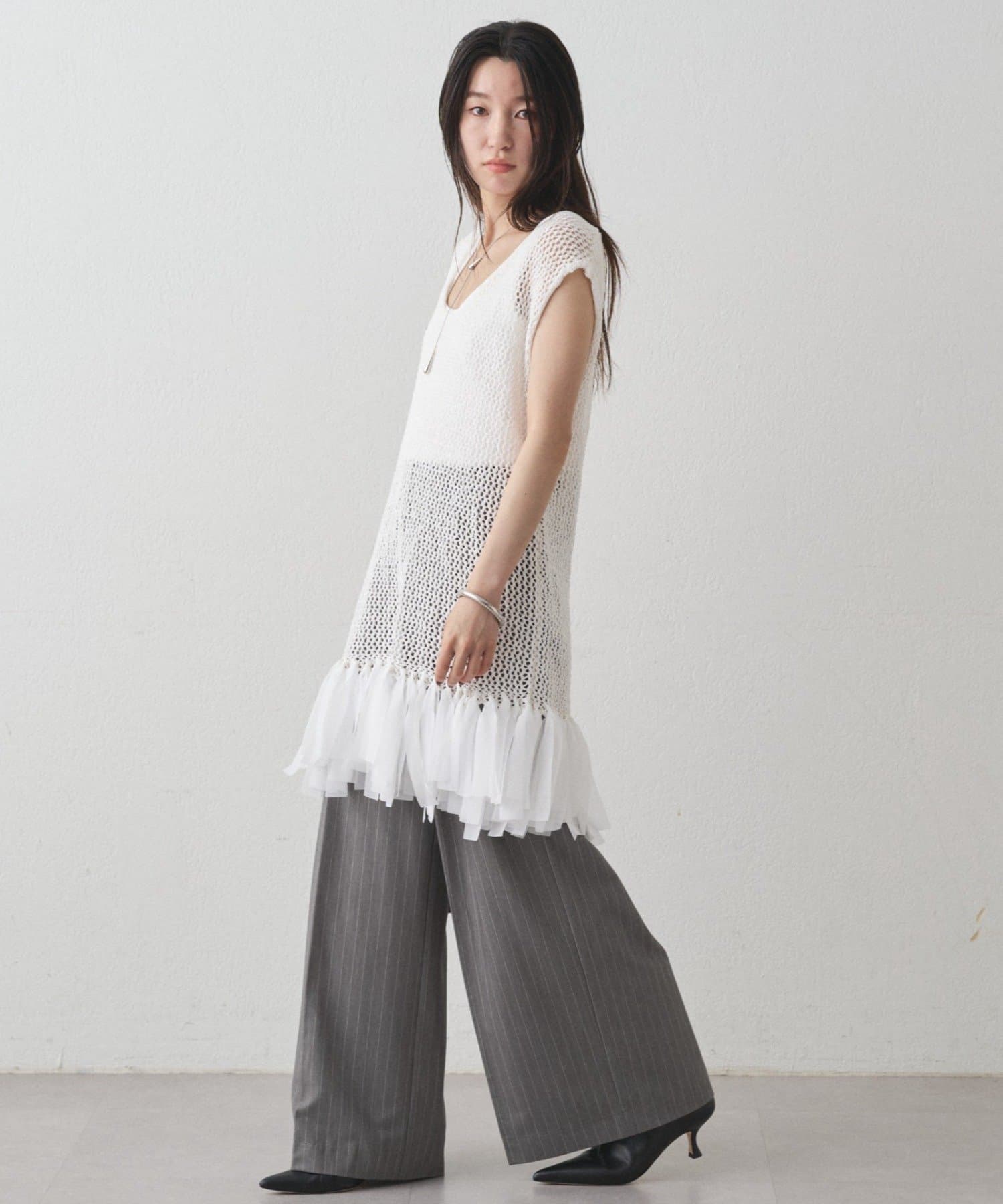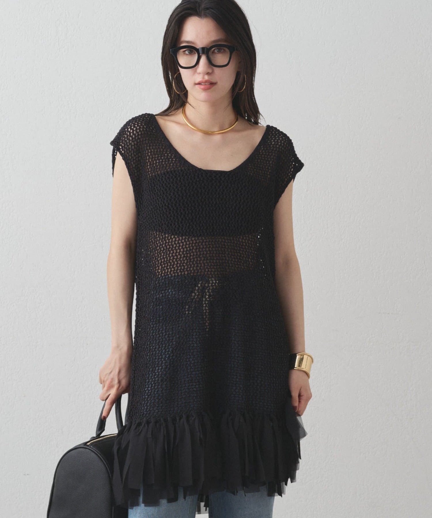 ざっくりと編まれた透け感のあるニットに、裾のフリンジがドラマティックな表情をプラスしてくれます。
