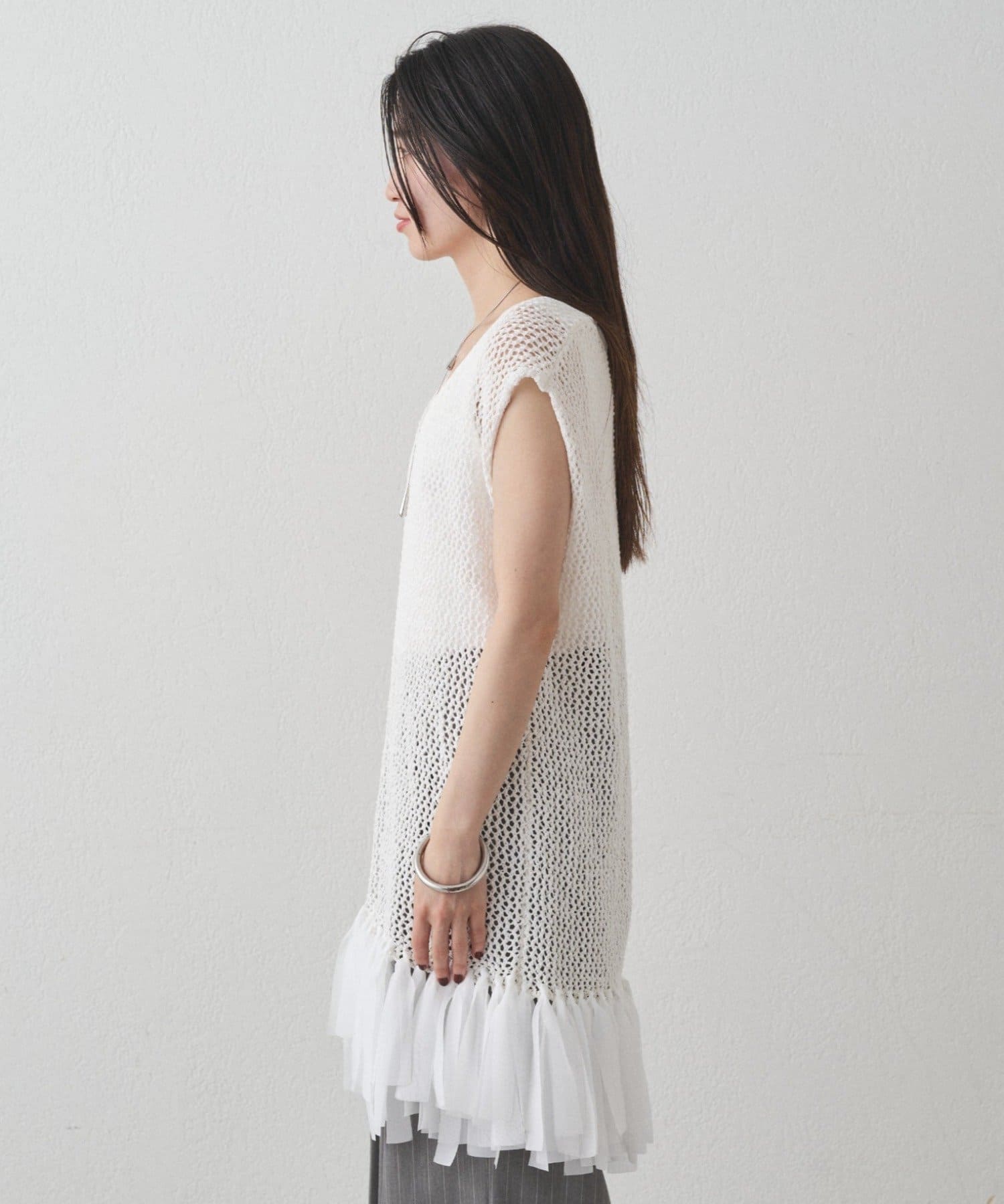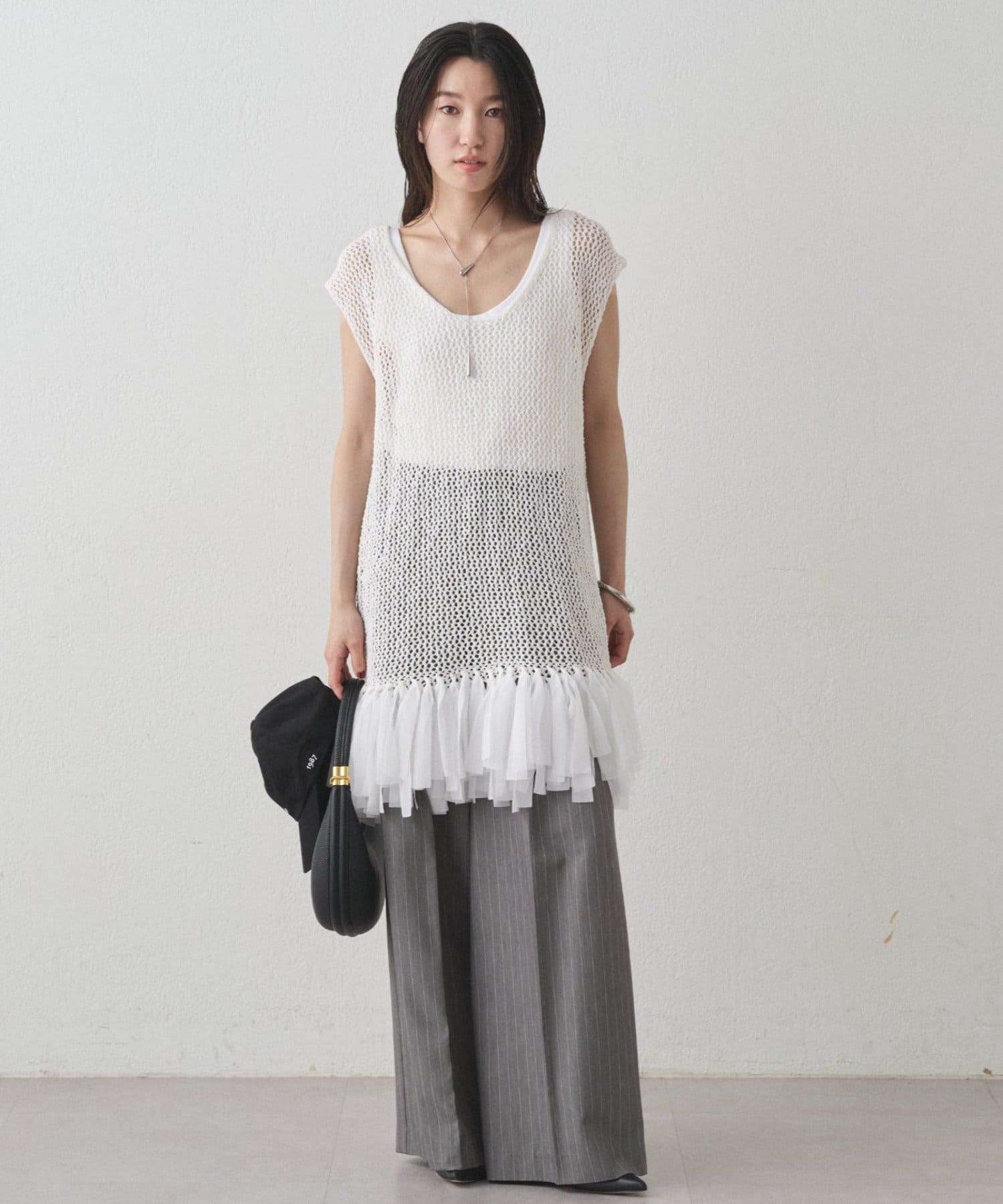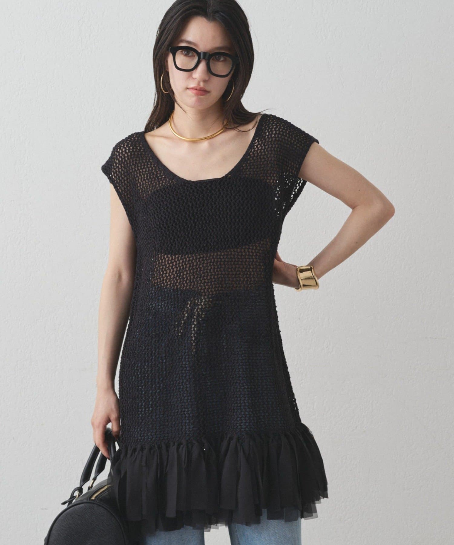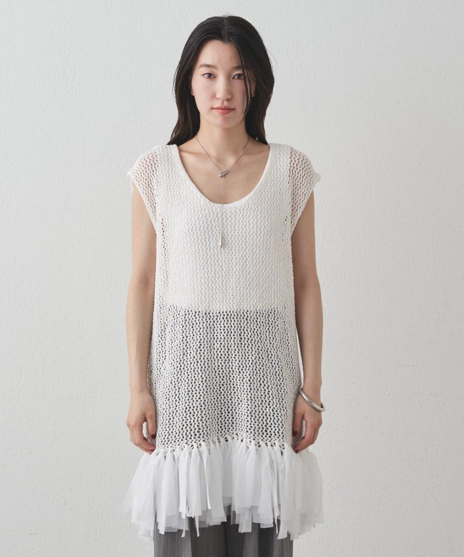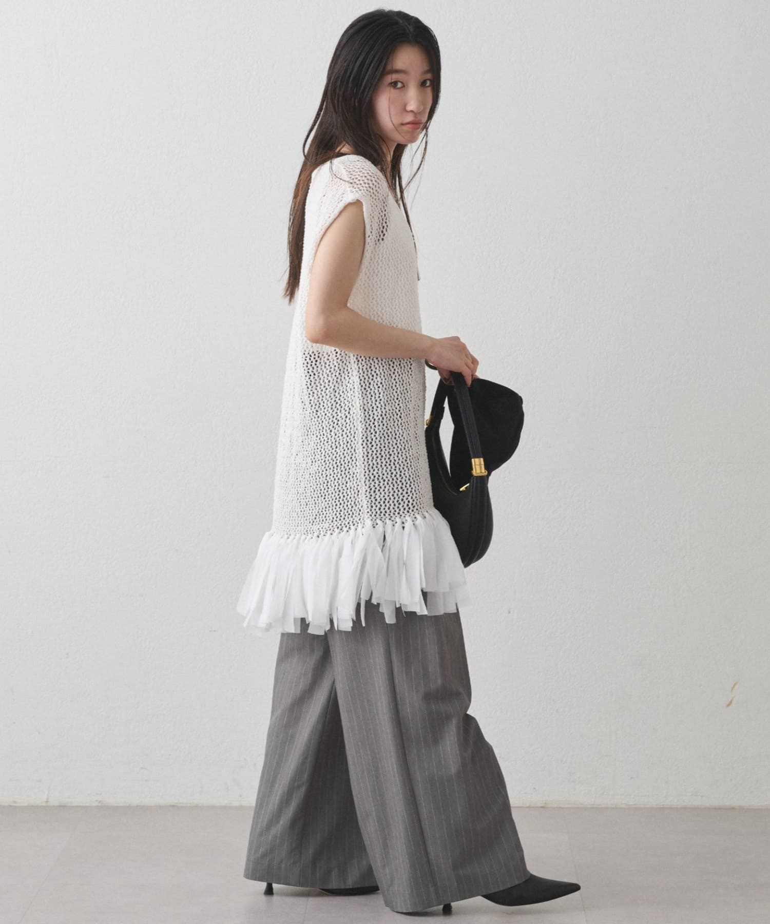 ざっくりと編まれた透け感のあるニットに、裾のフリンジがドラマティックな表情をプラスしてくれます。