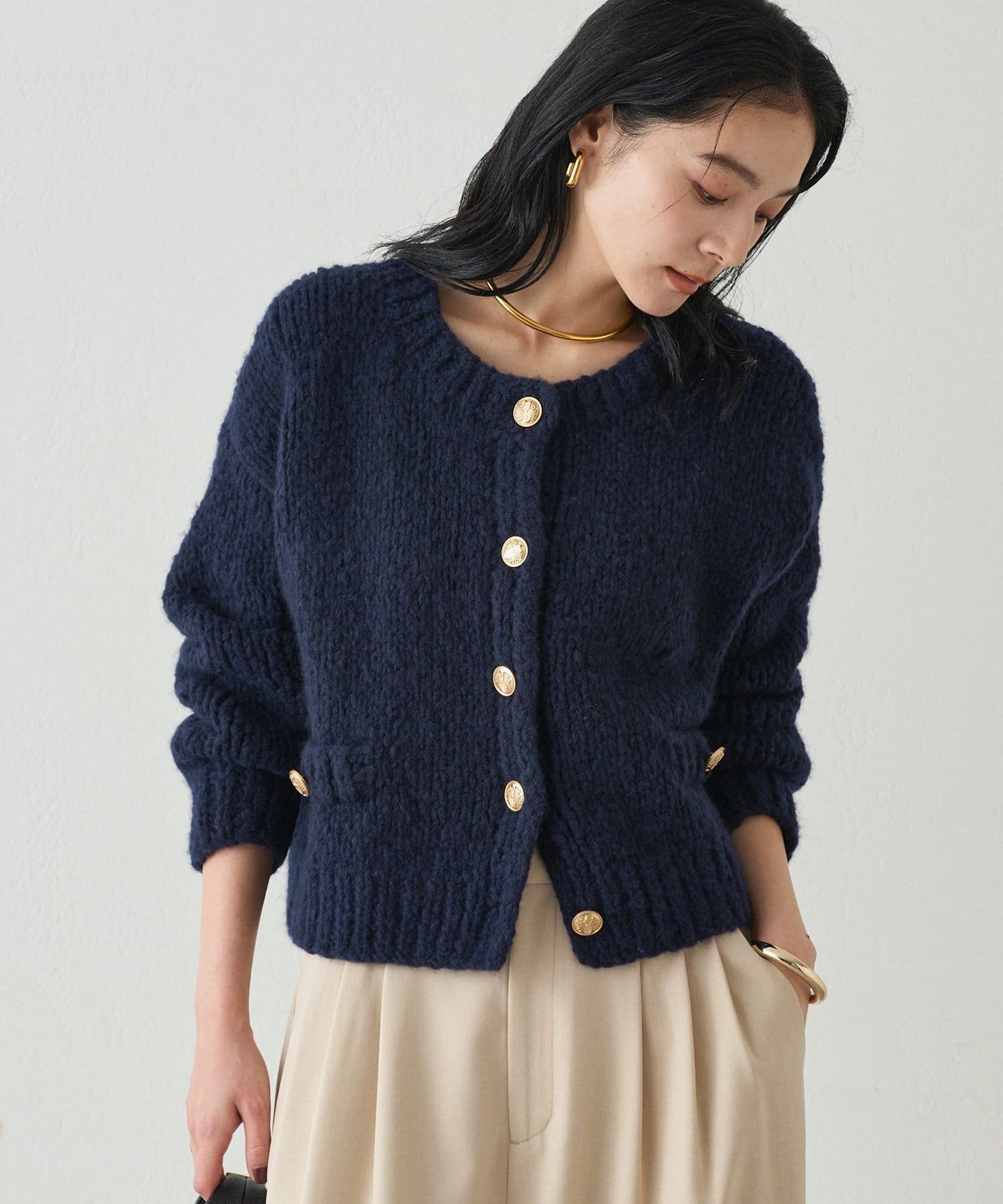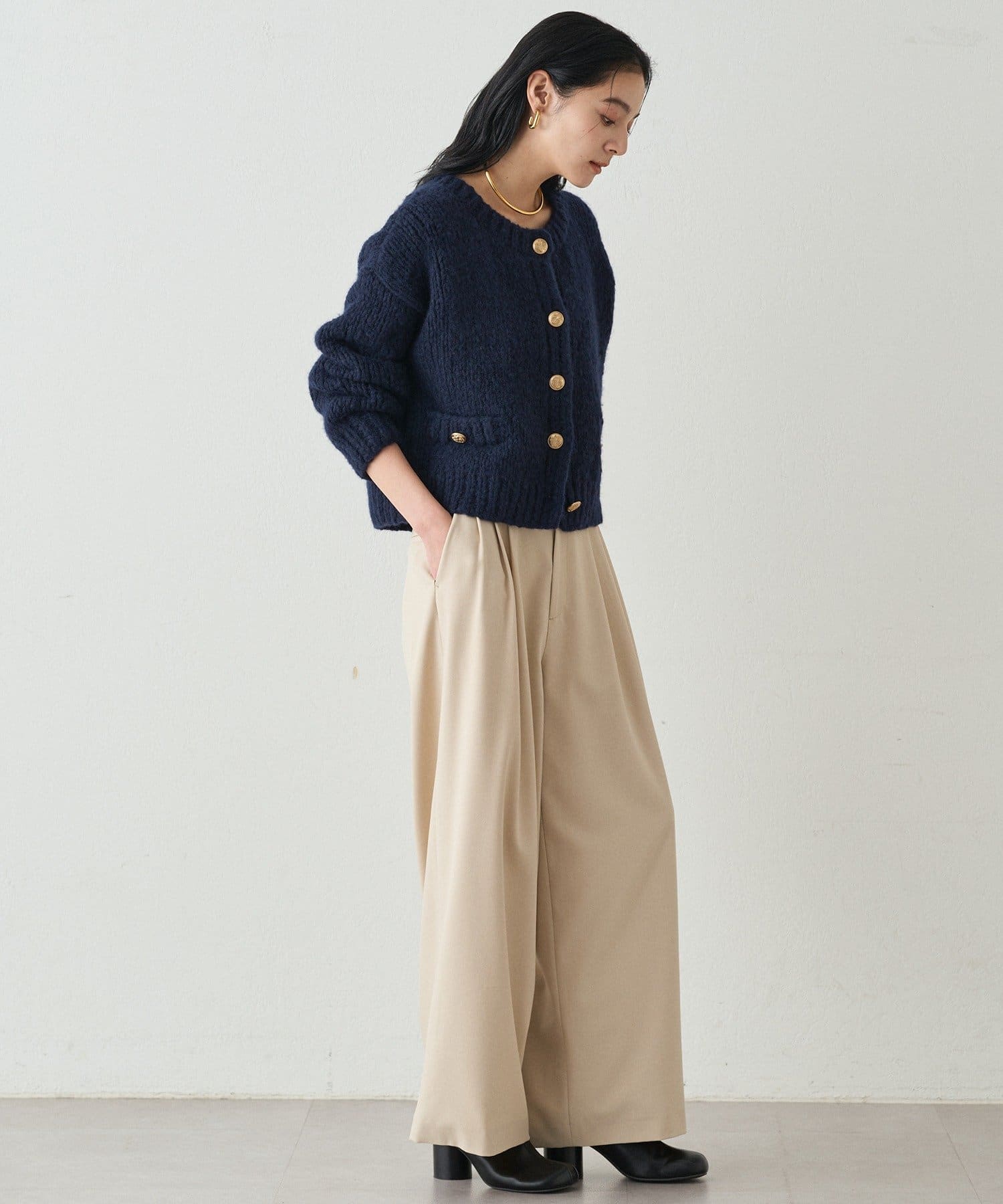 ゴールドボタンが上品なアクセントになり、シンプルながらもクラシカルな印象を与えてくれます。