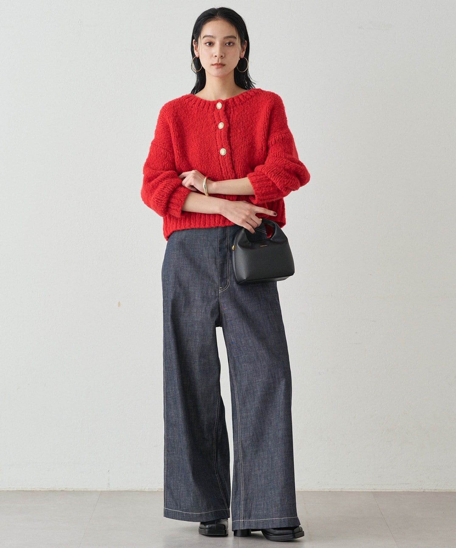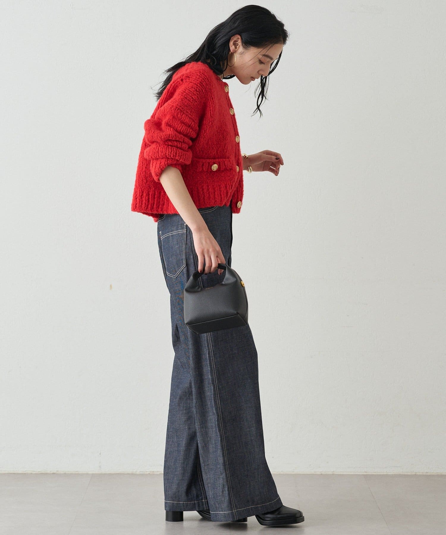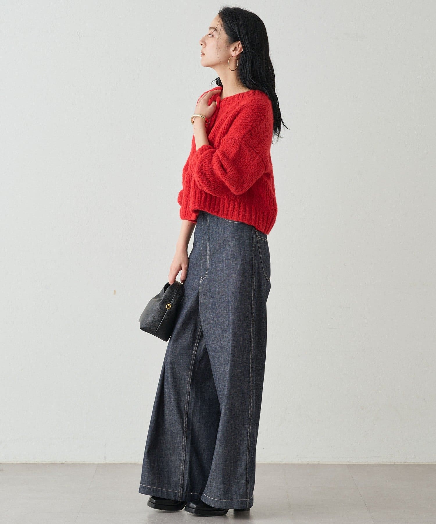 ハイウエストデニムと合わせて、カジュアルながらも品のある大人スタイルに。