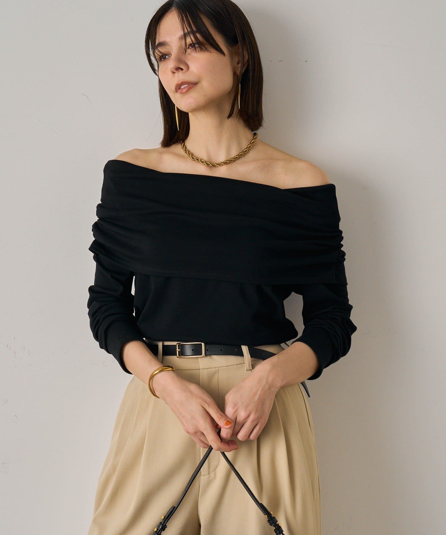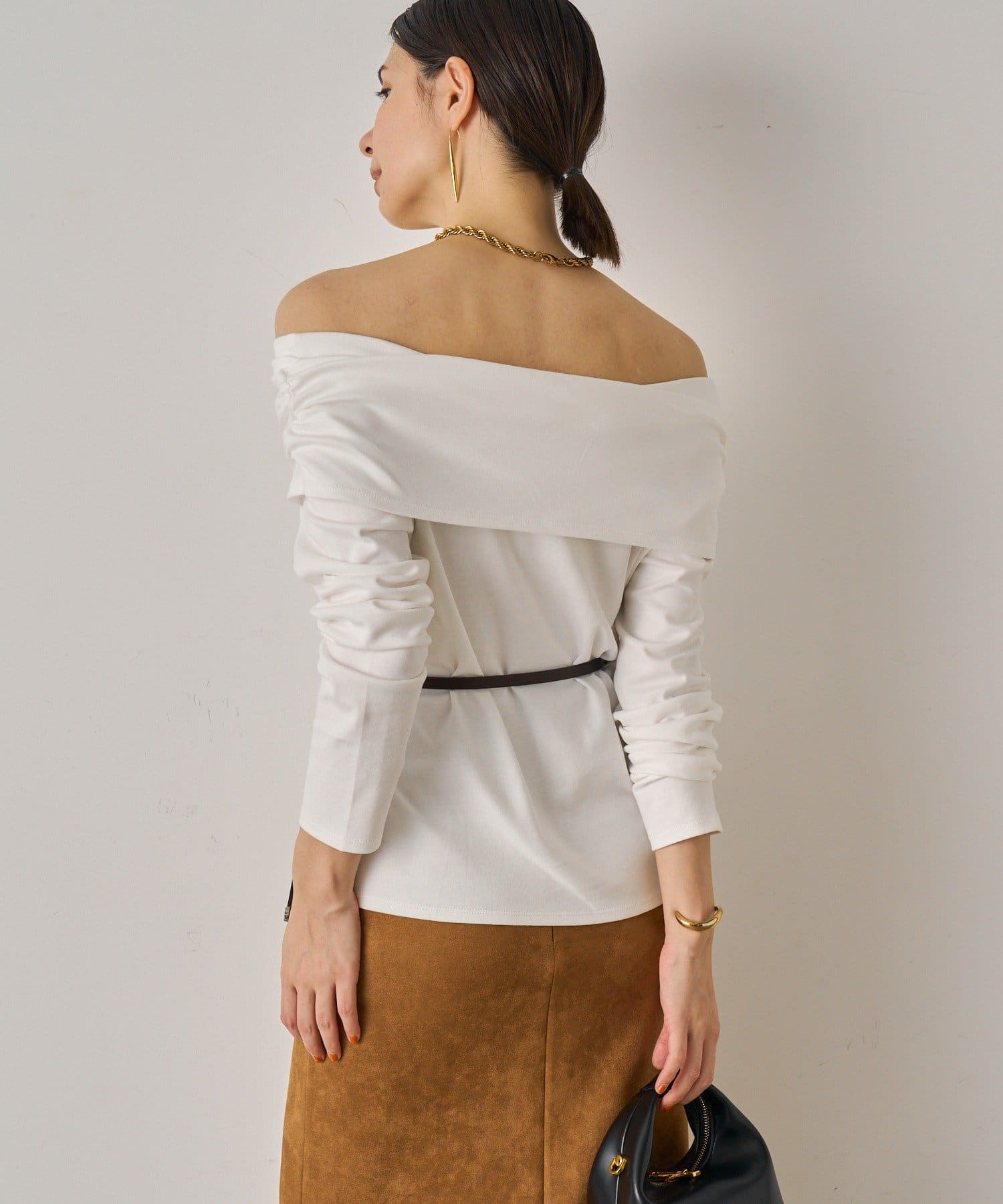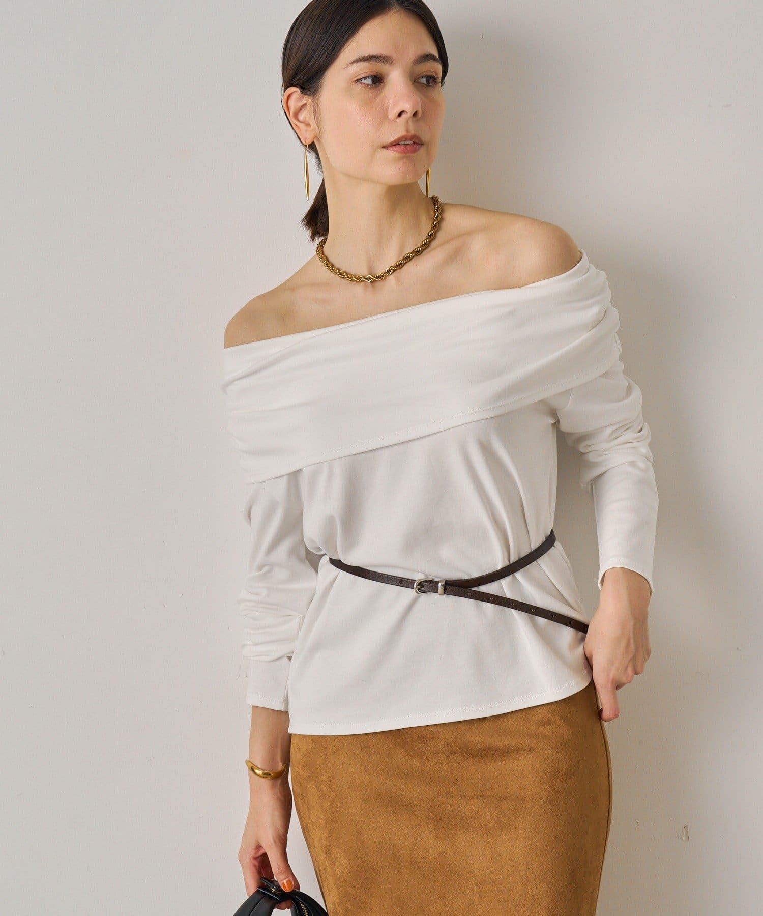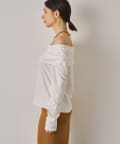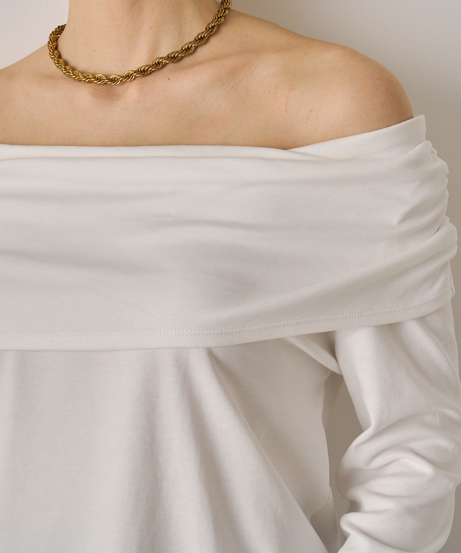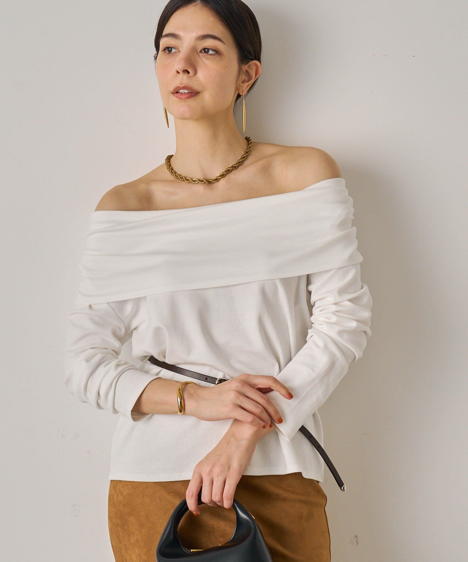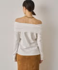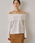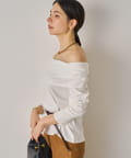 デコルテを美しく見せるオフショルダーデザインのトップス。