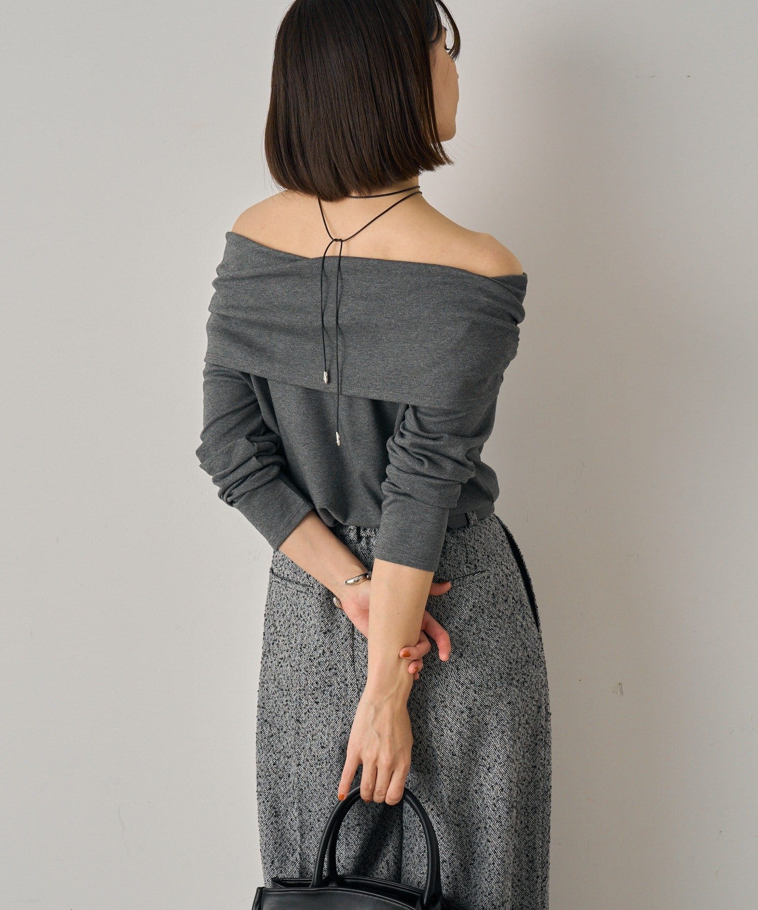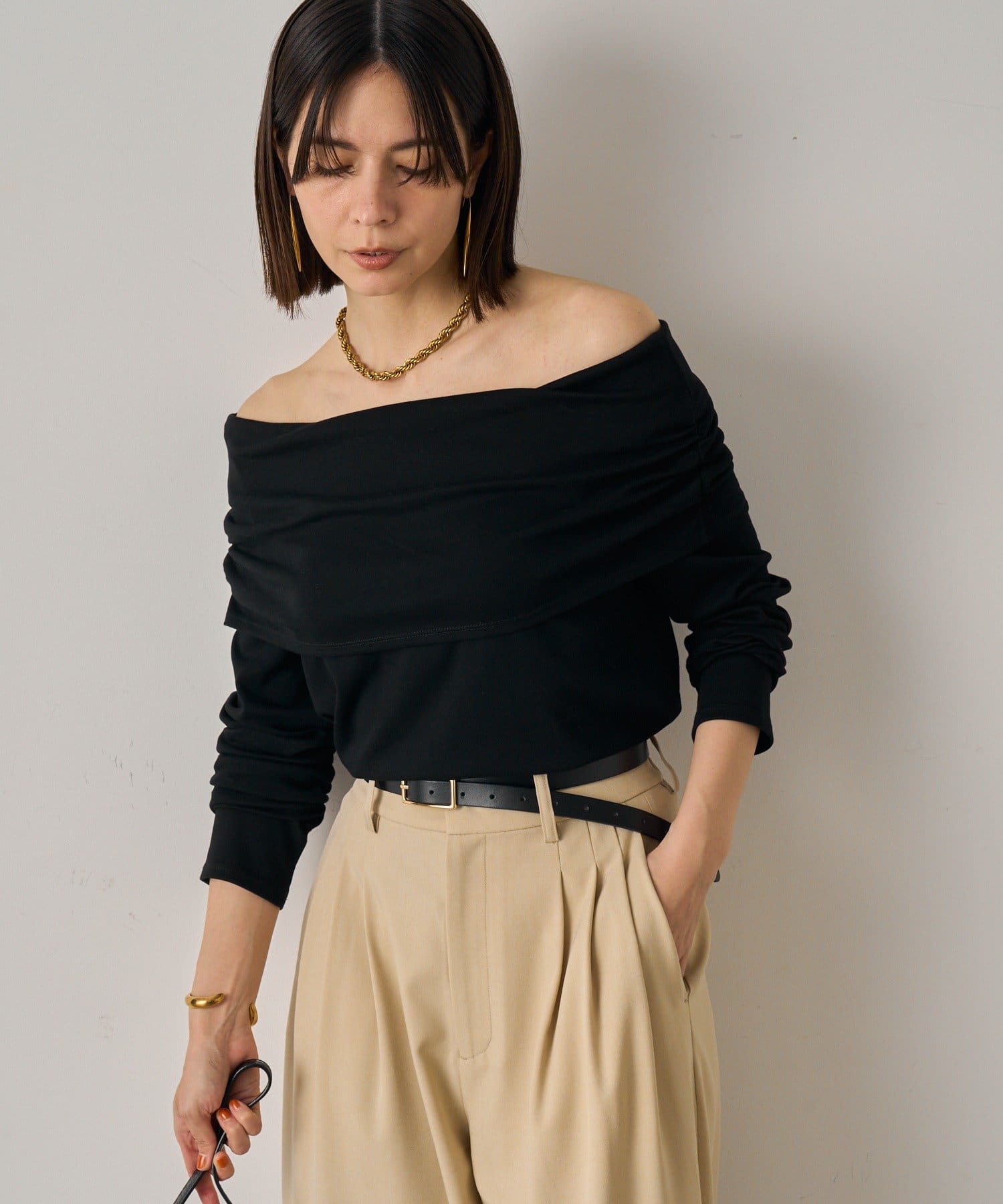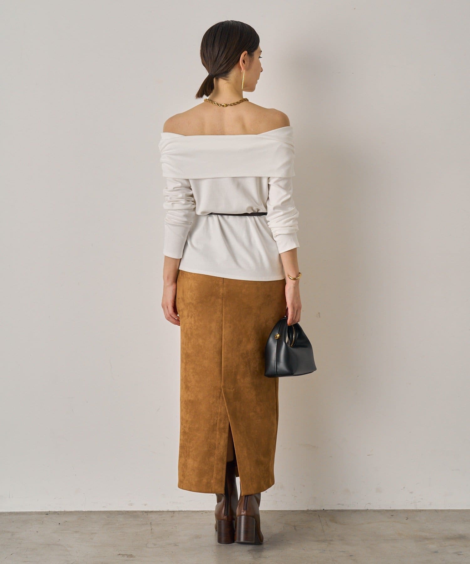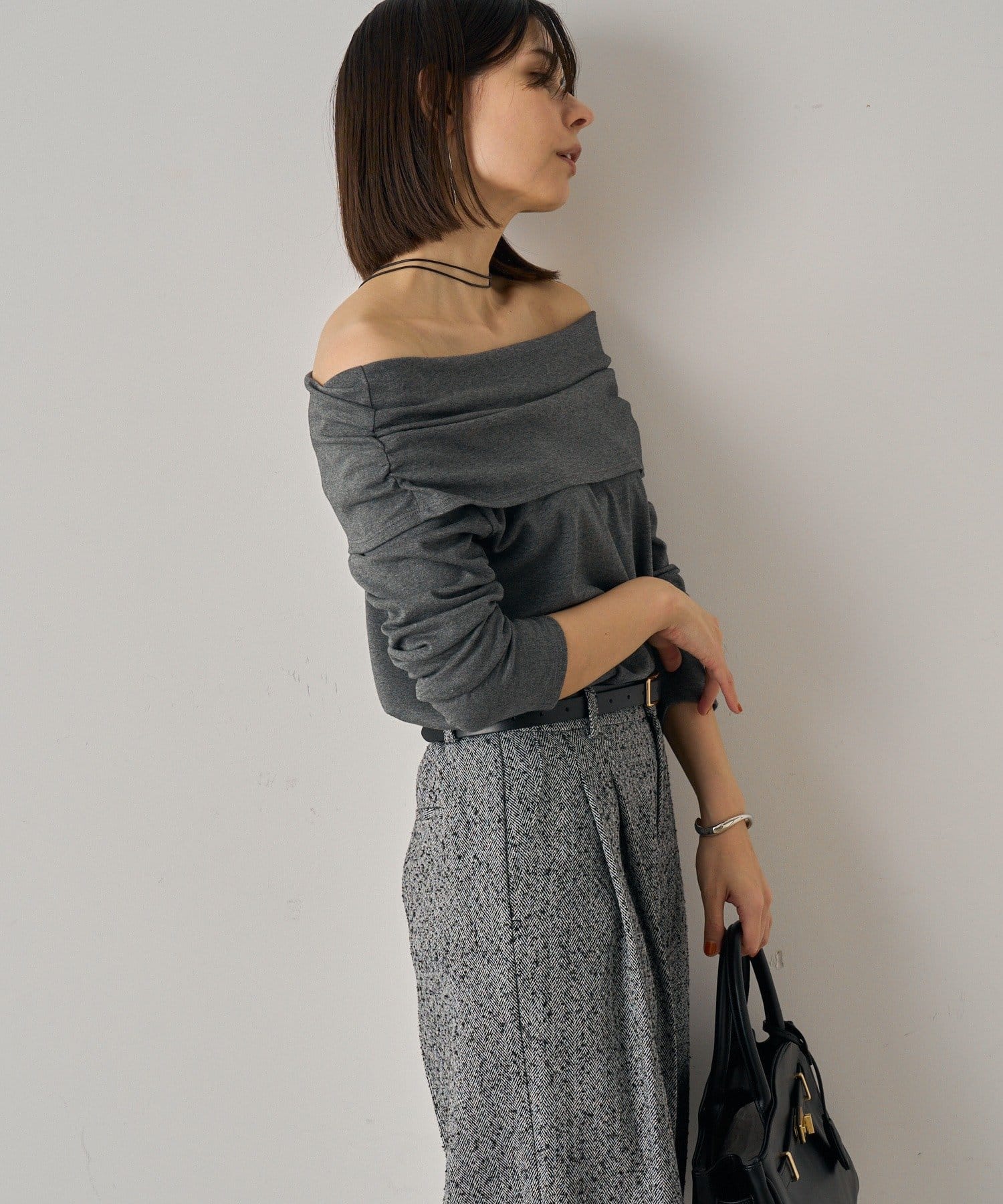 デコルテを美しく見せるオフショルダーデザインのトップス。