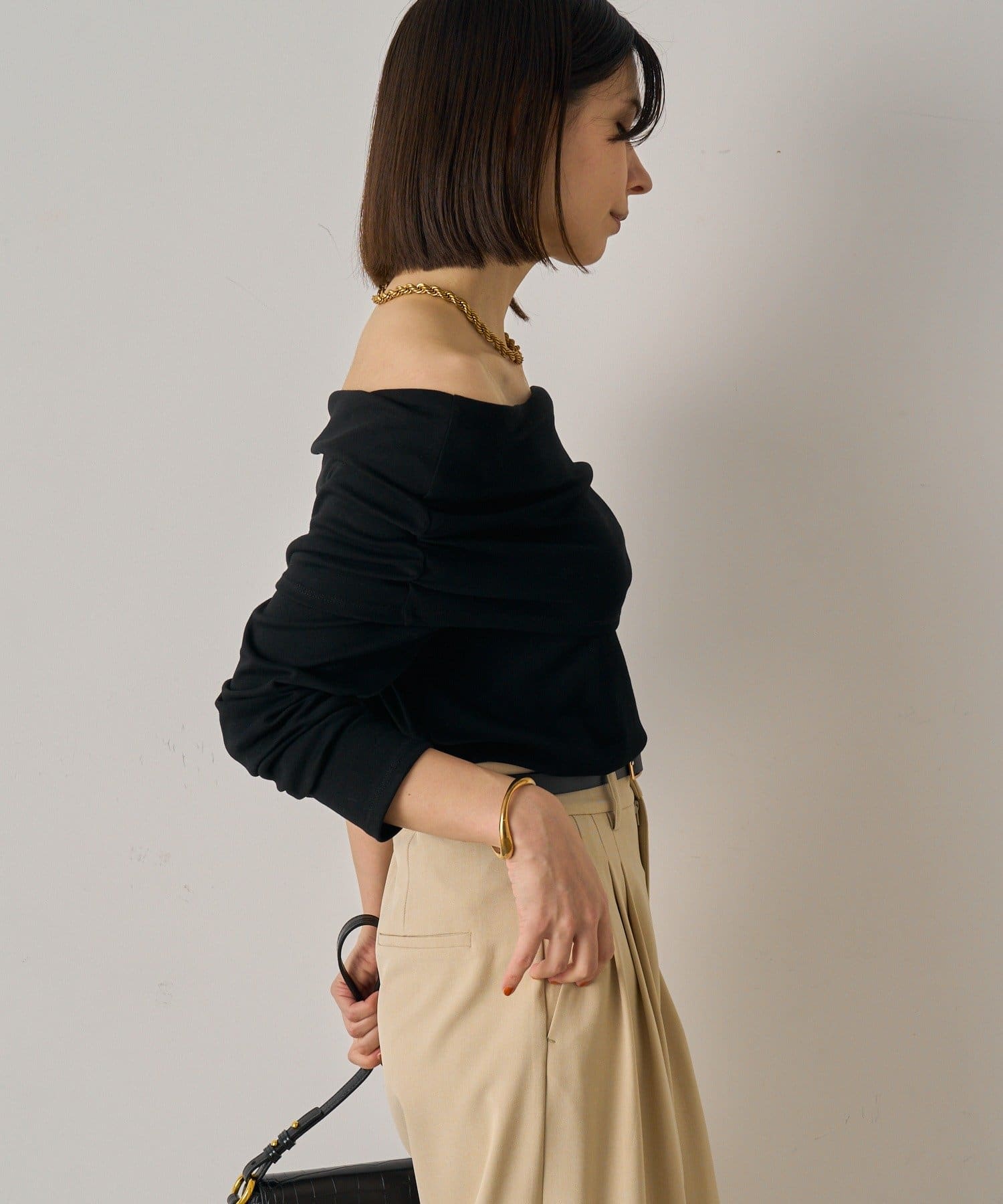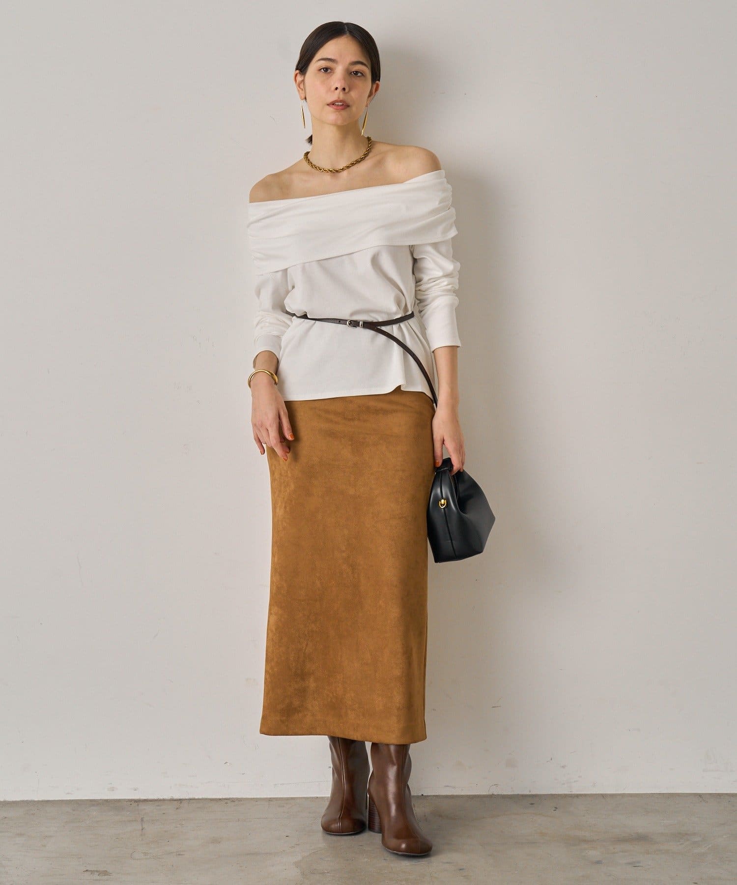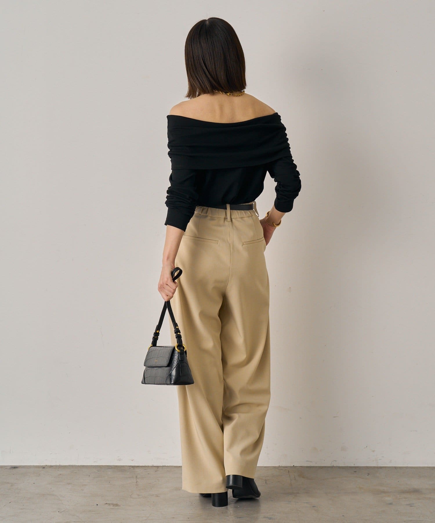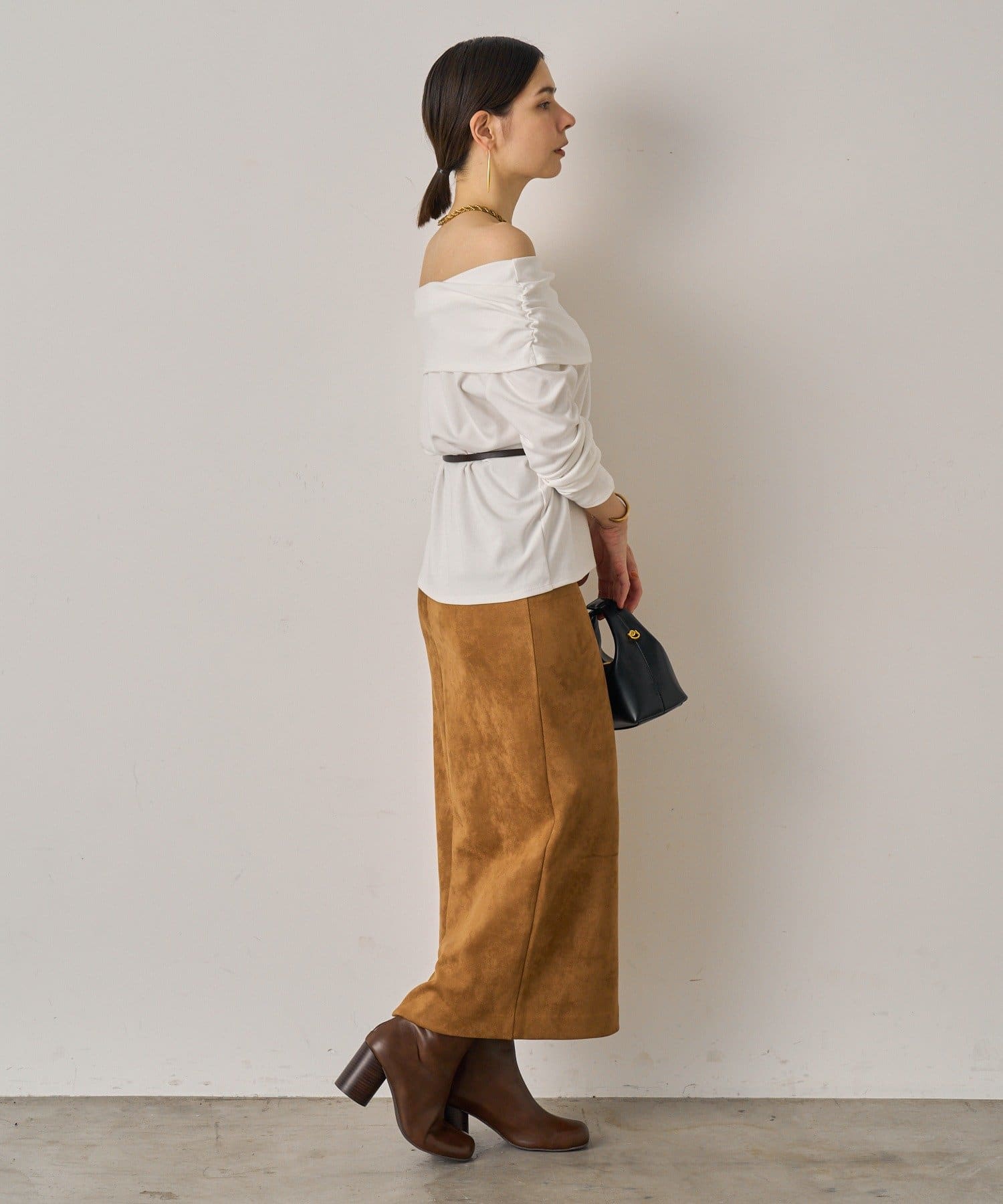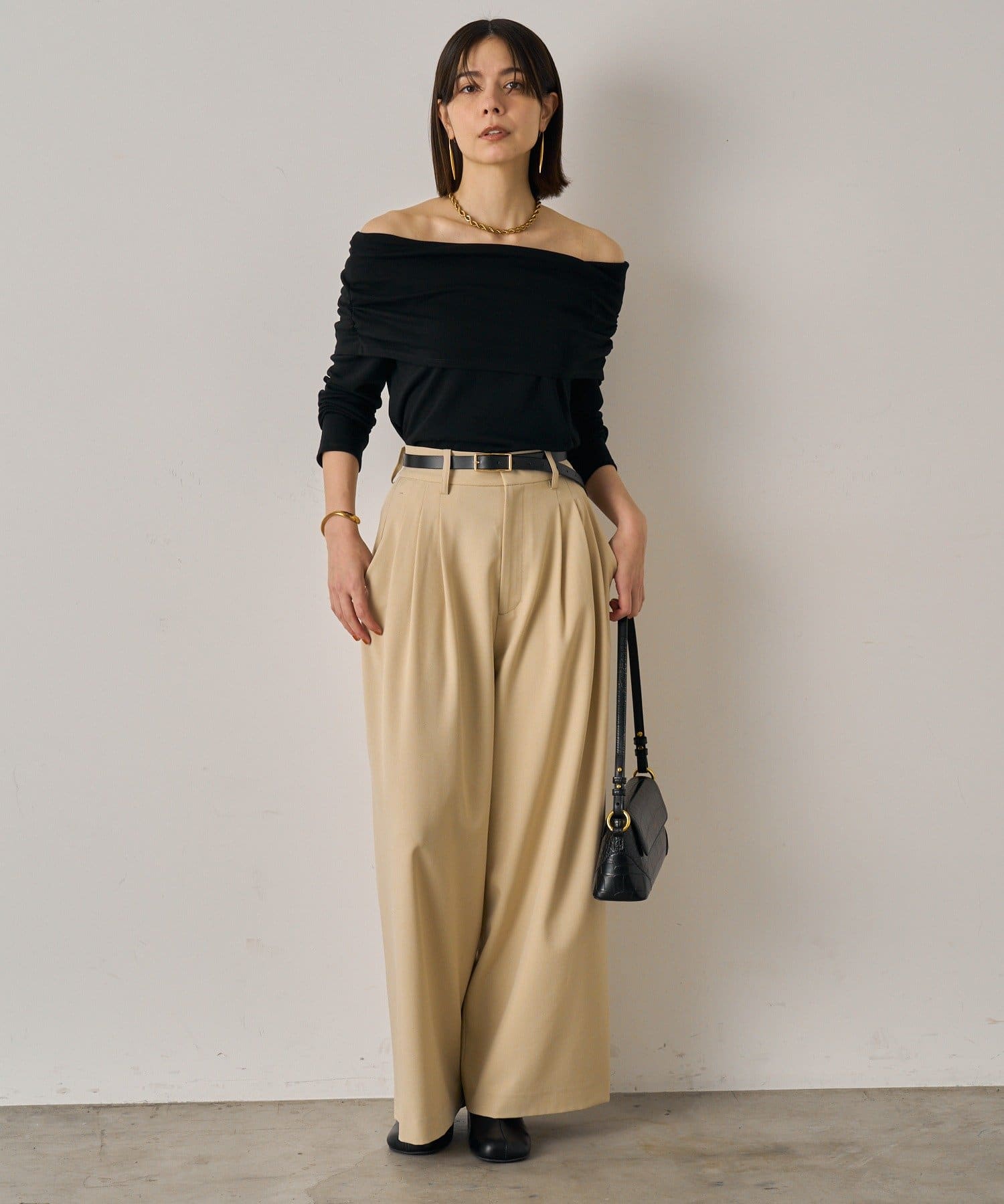 デコルテを美しく見せるオフショルダーデザインのトップス。