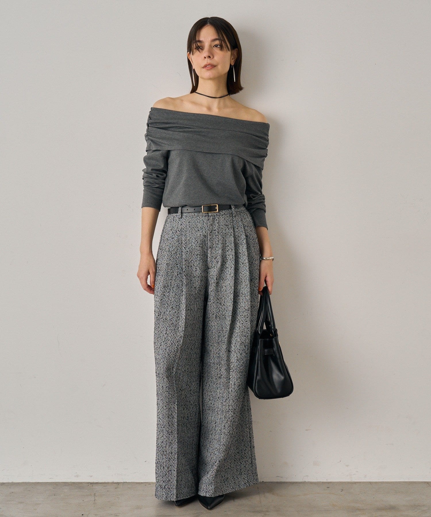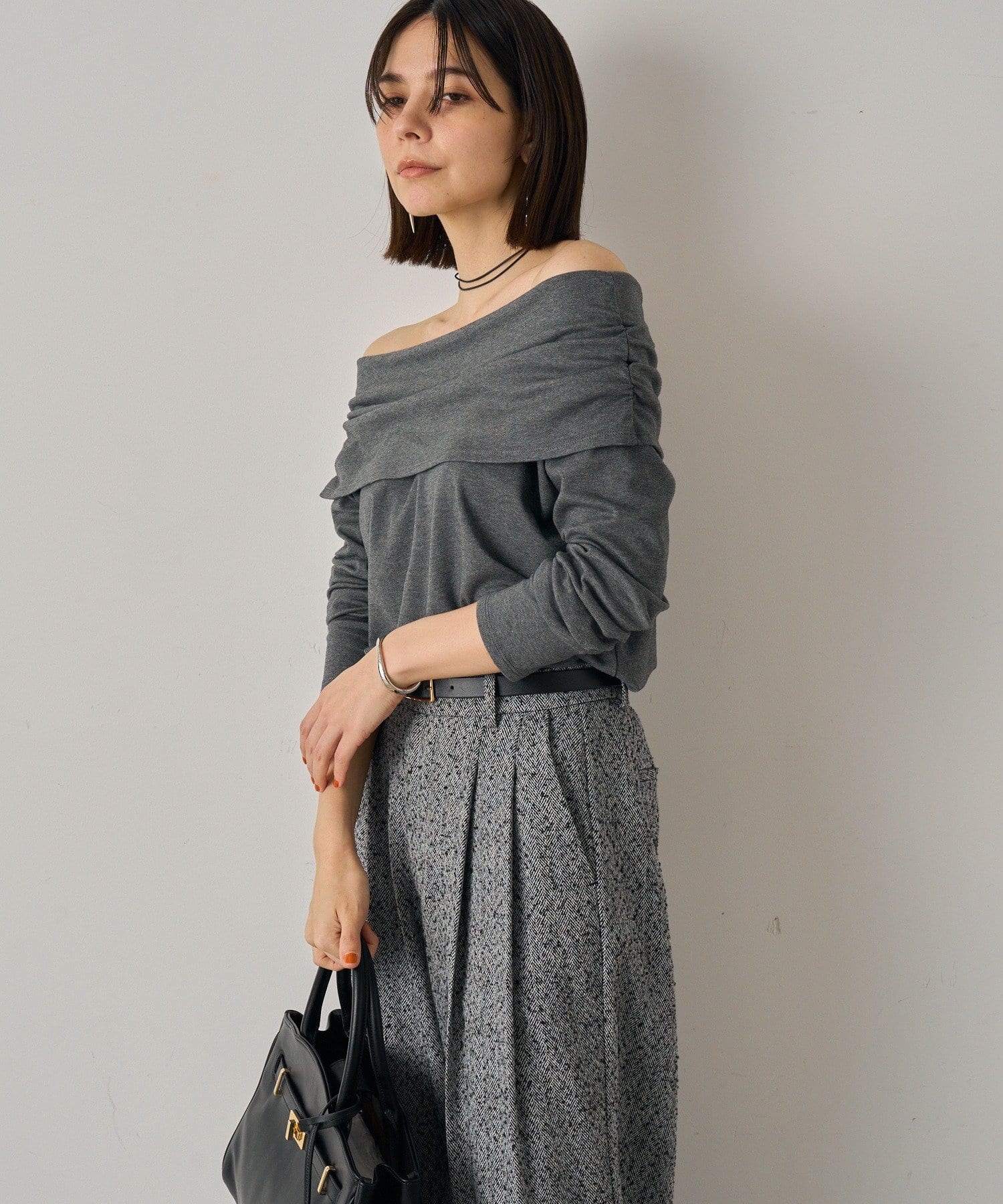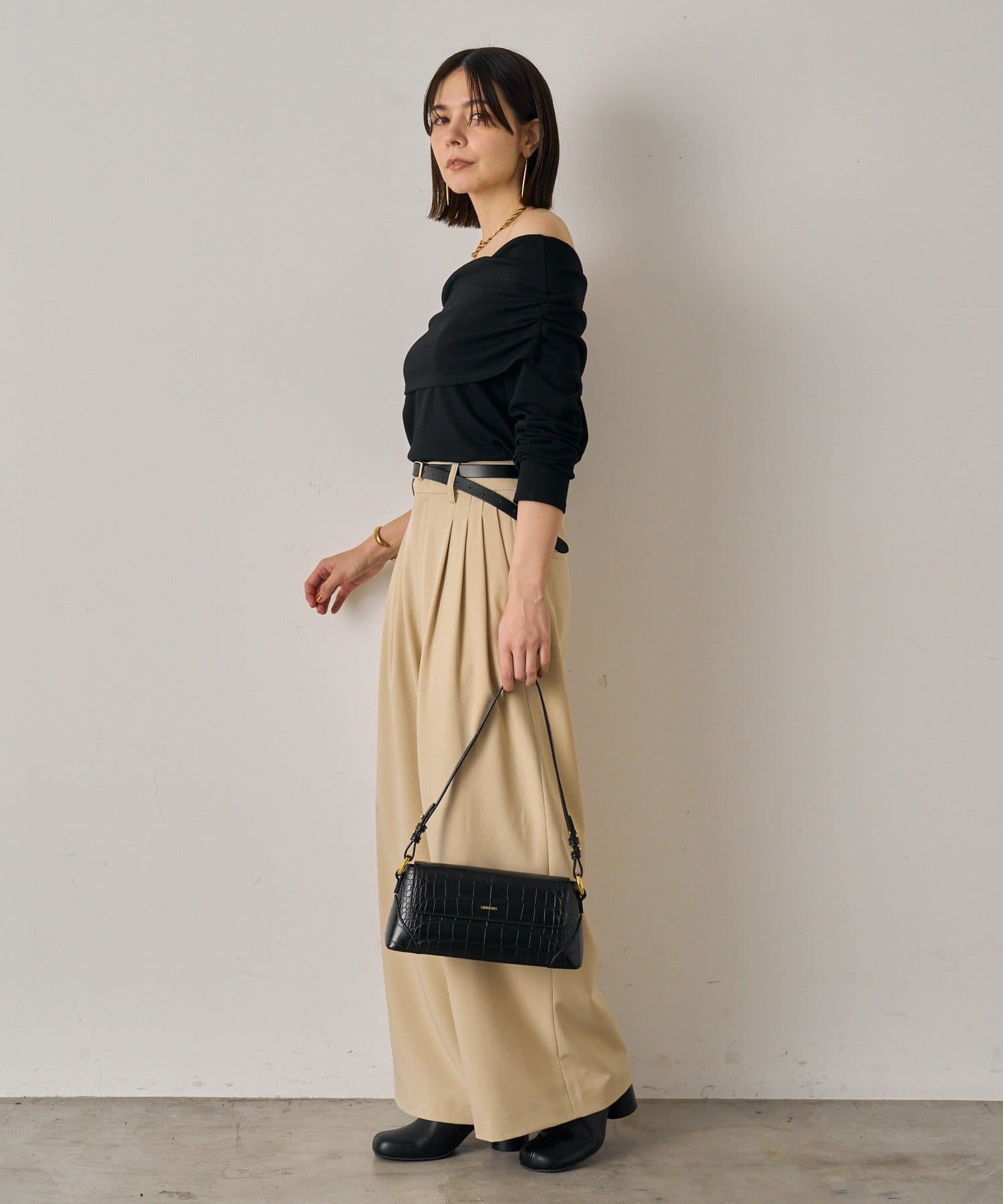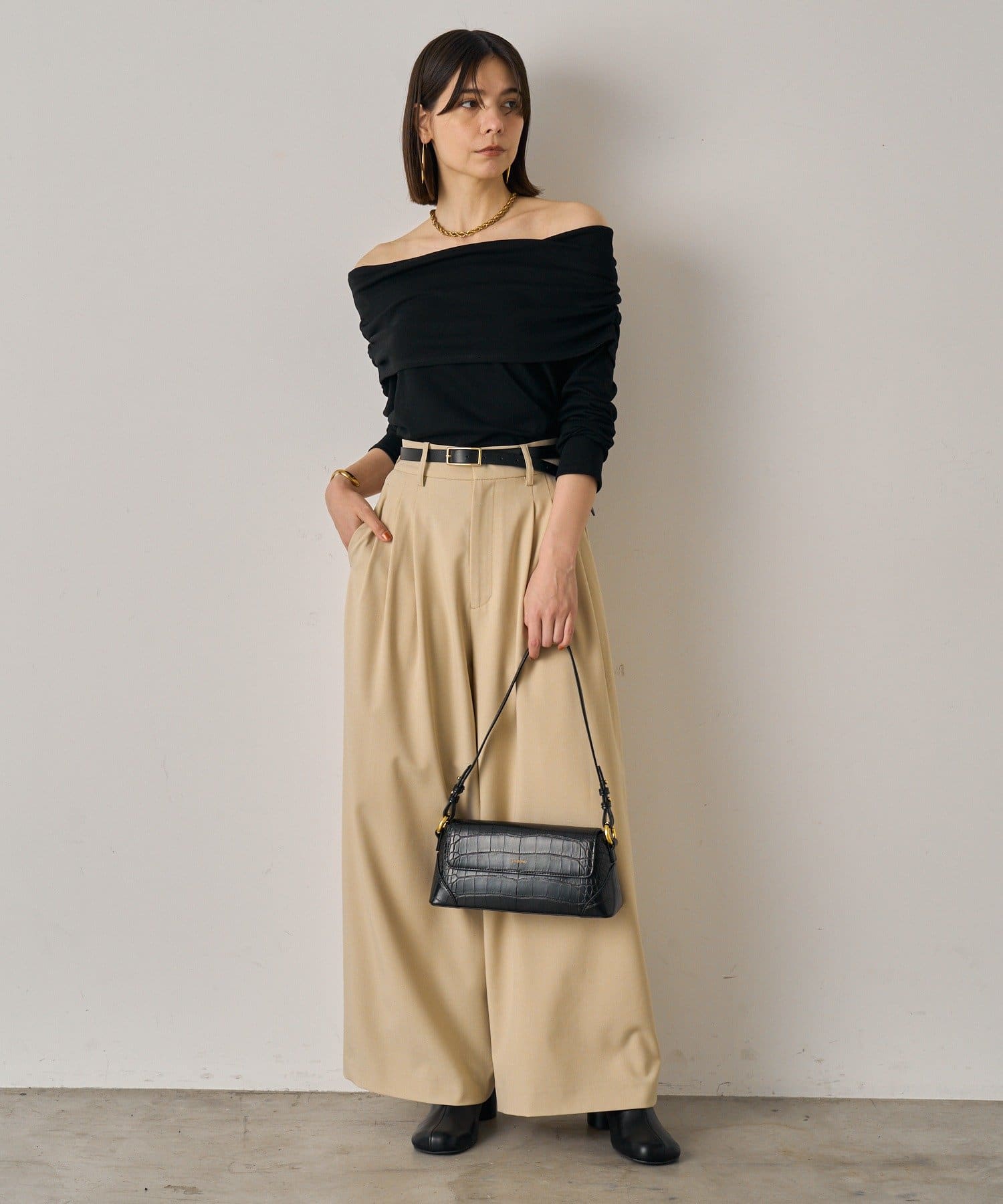 デコルテを美しく見せるオフショルダーデザインのトップス。