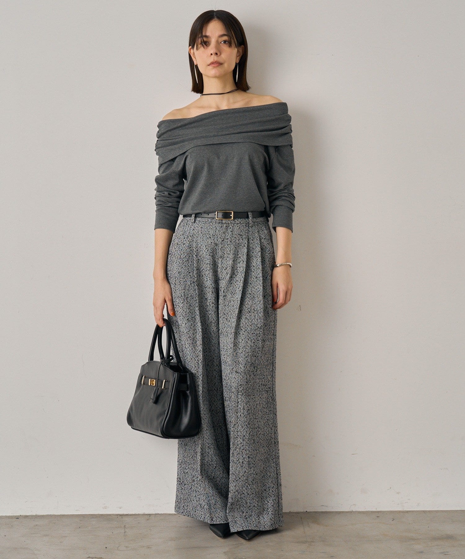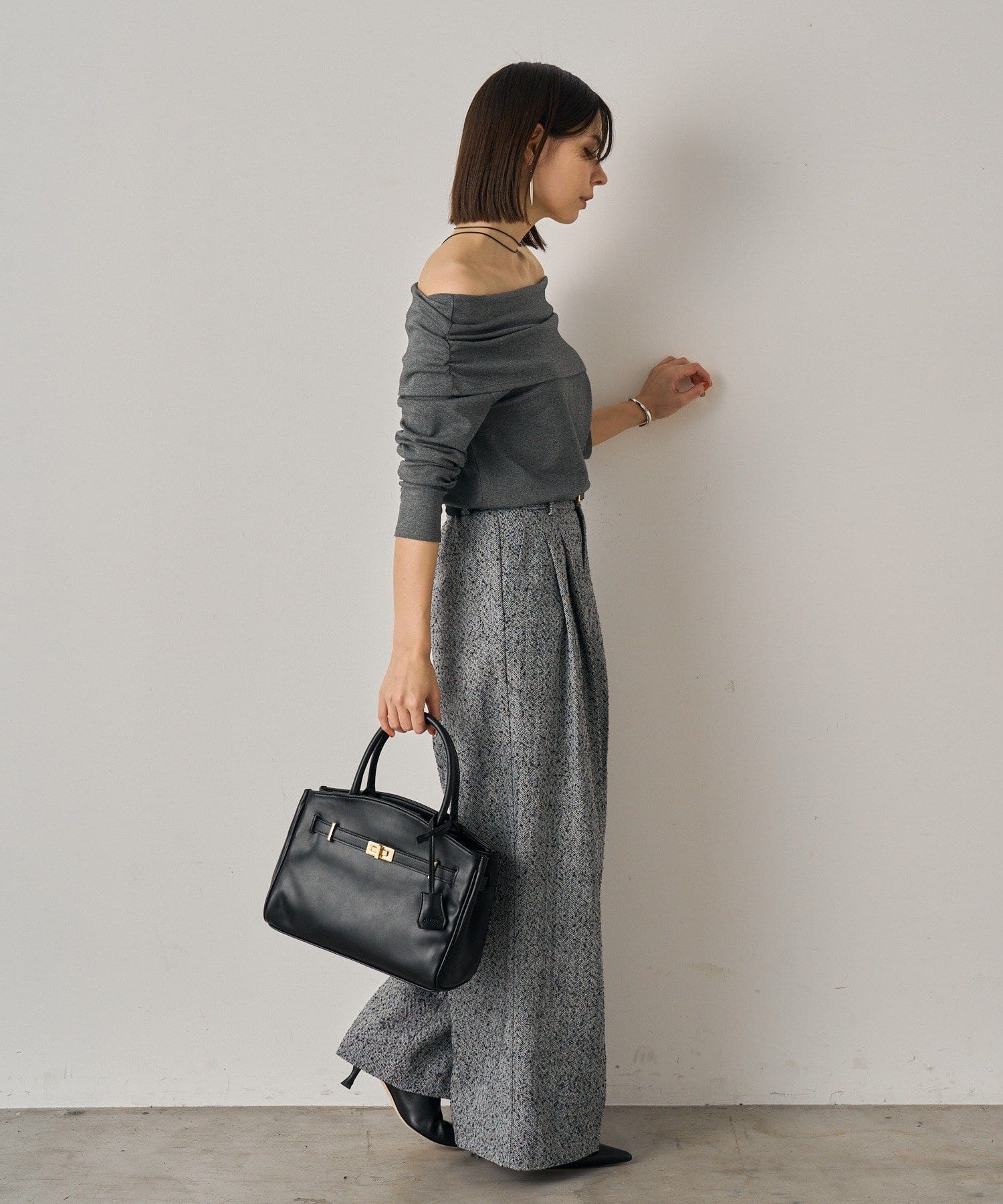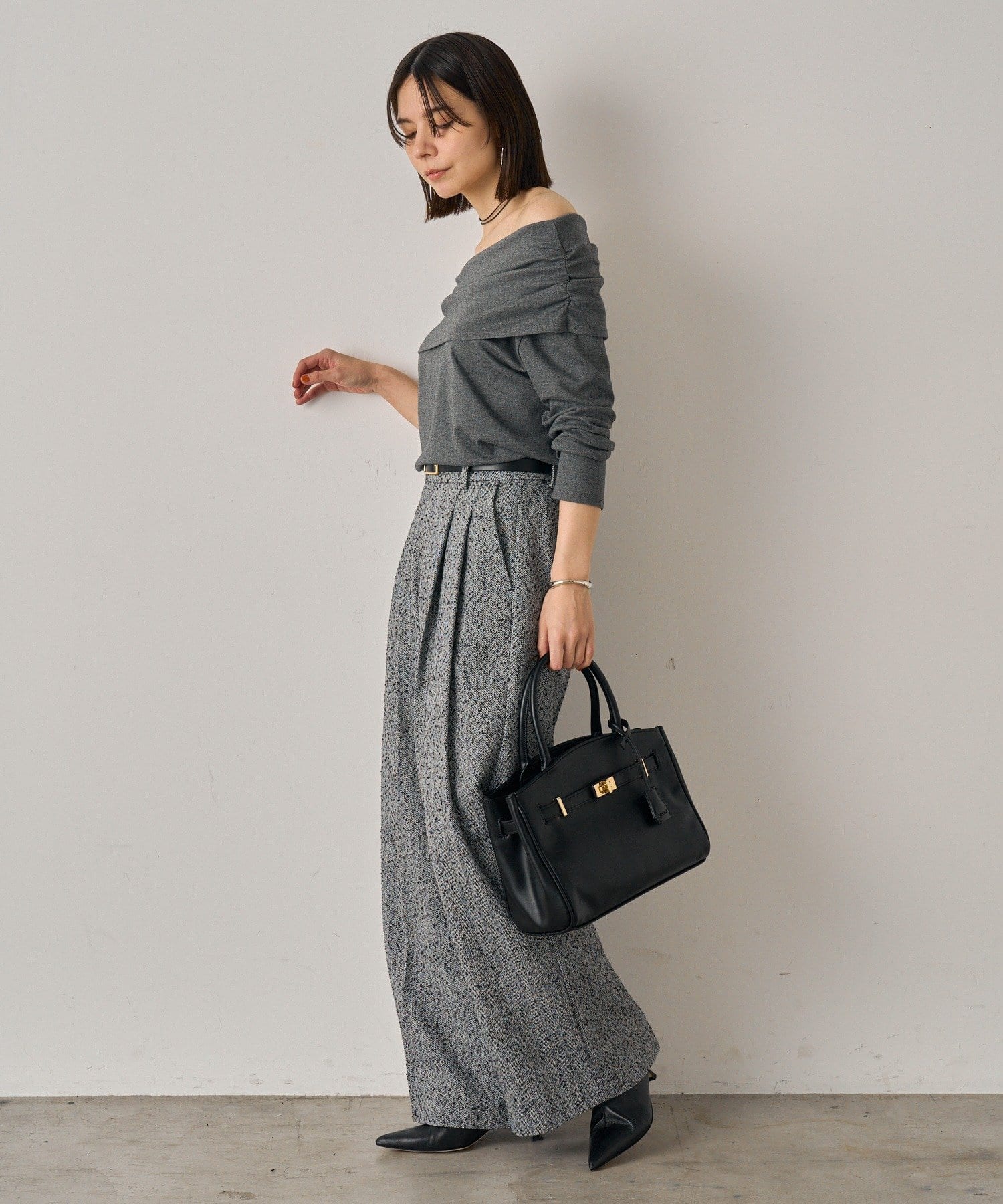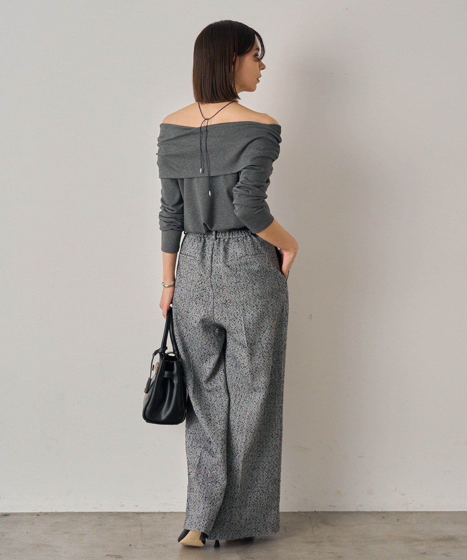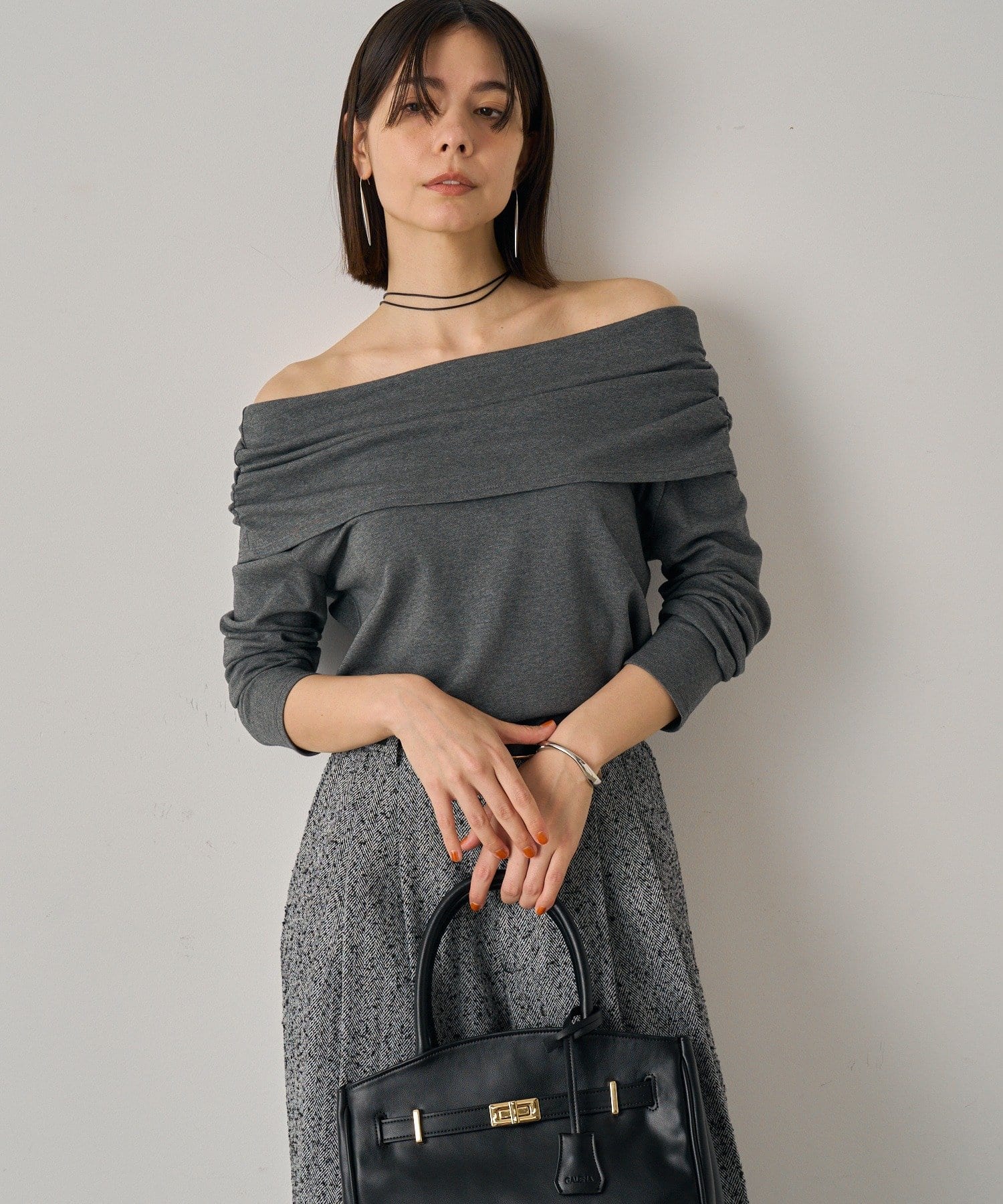 デコルテを美しく見せるオフショルダーデザインのトップス。
