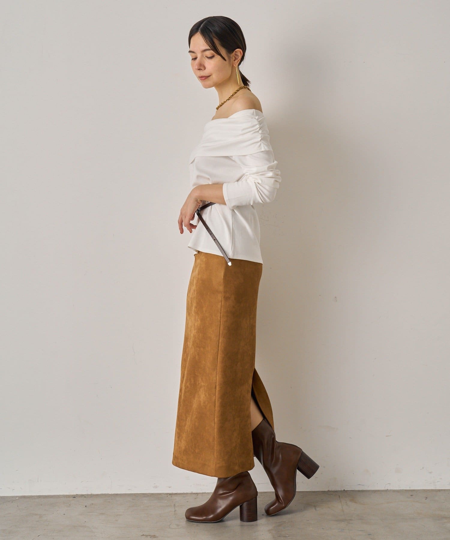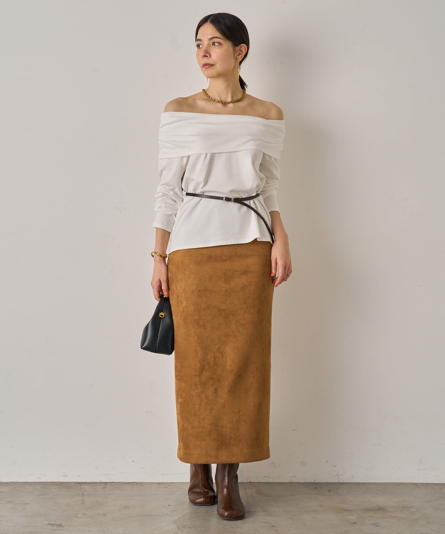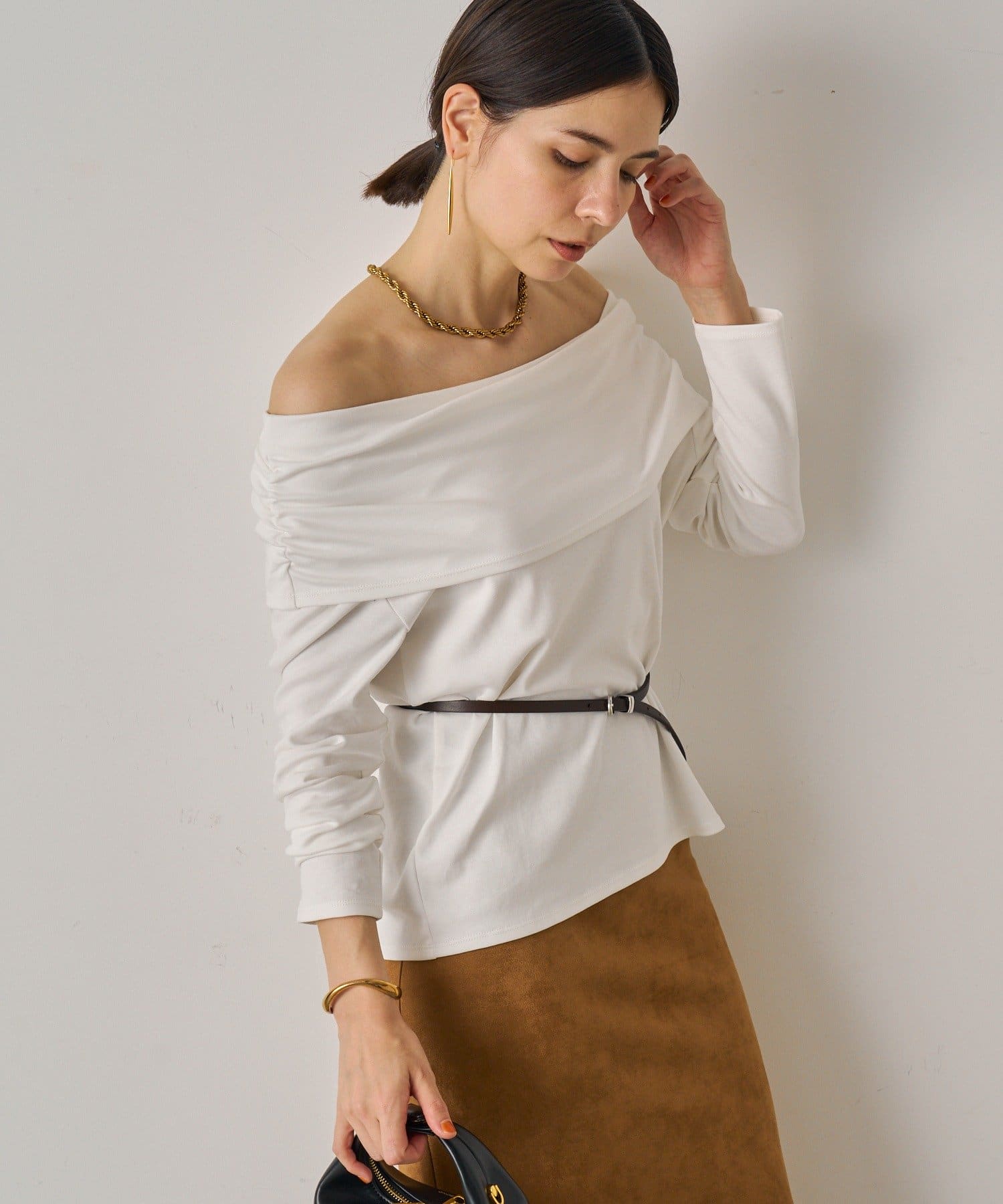 大人の抜け感を演出するオフショルカットソー