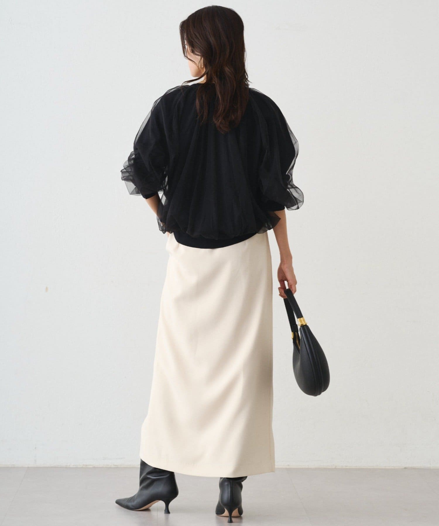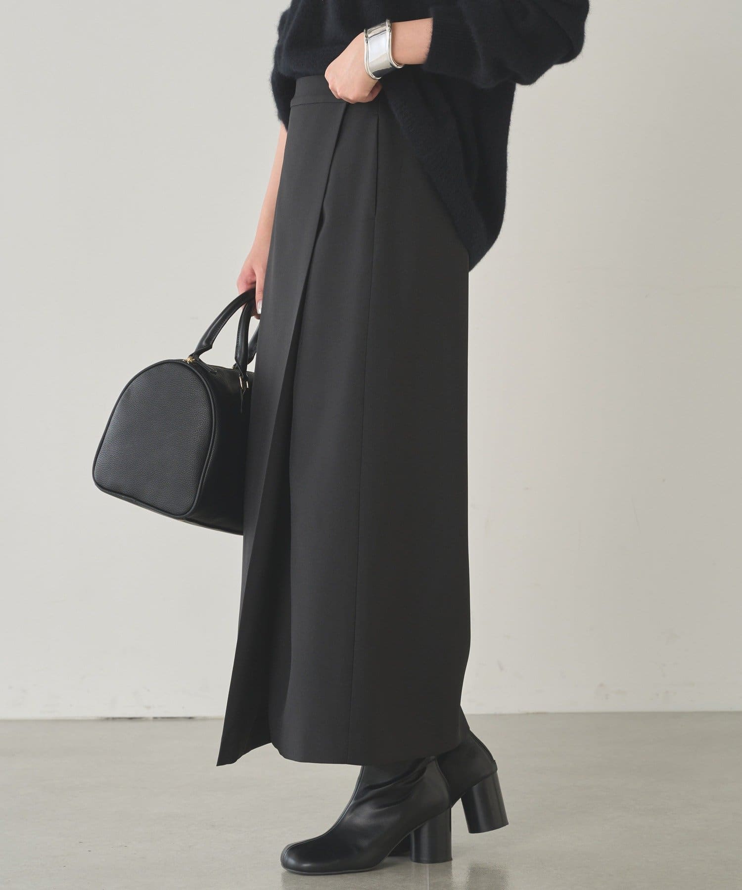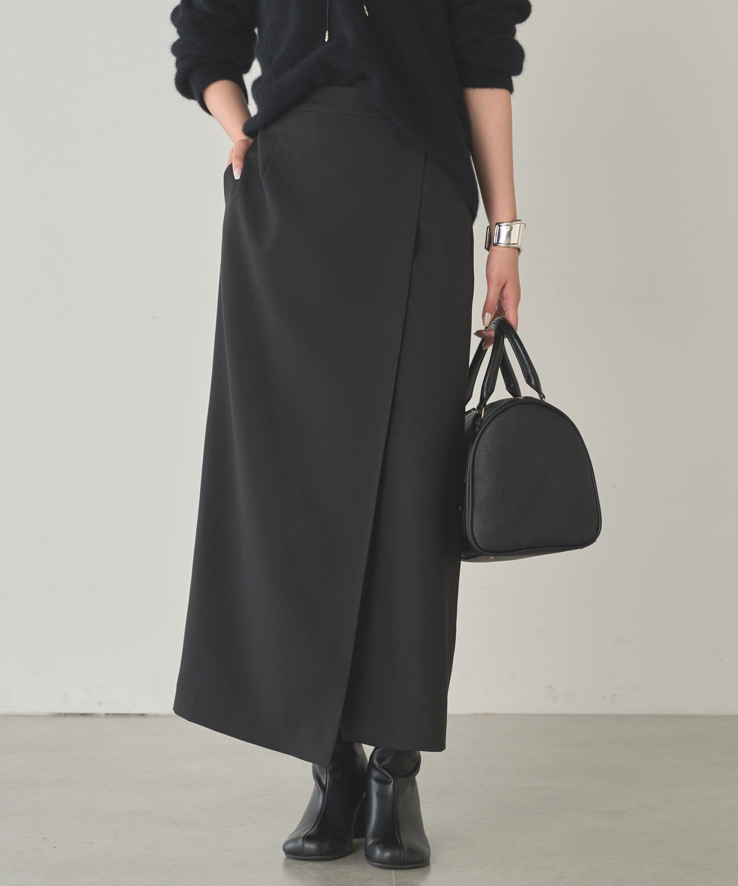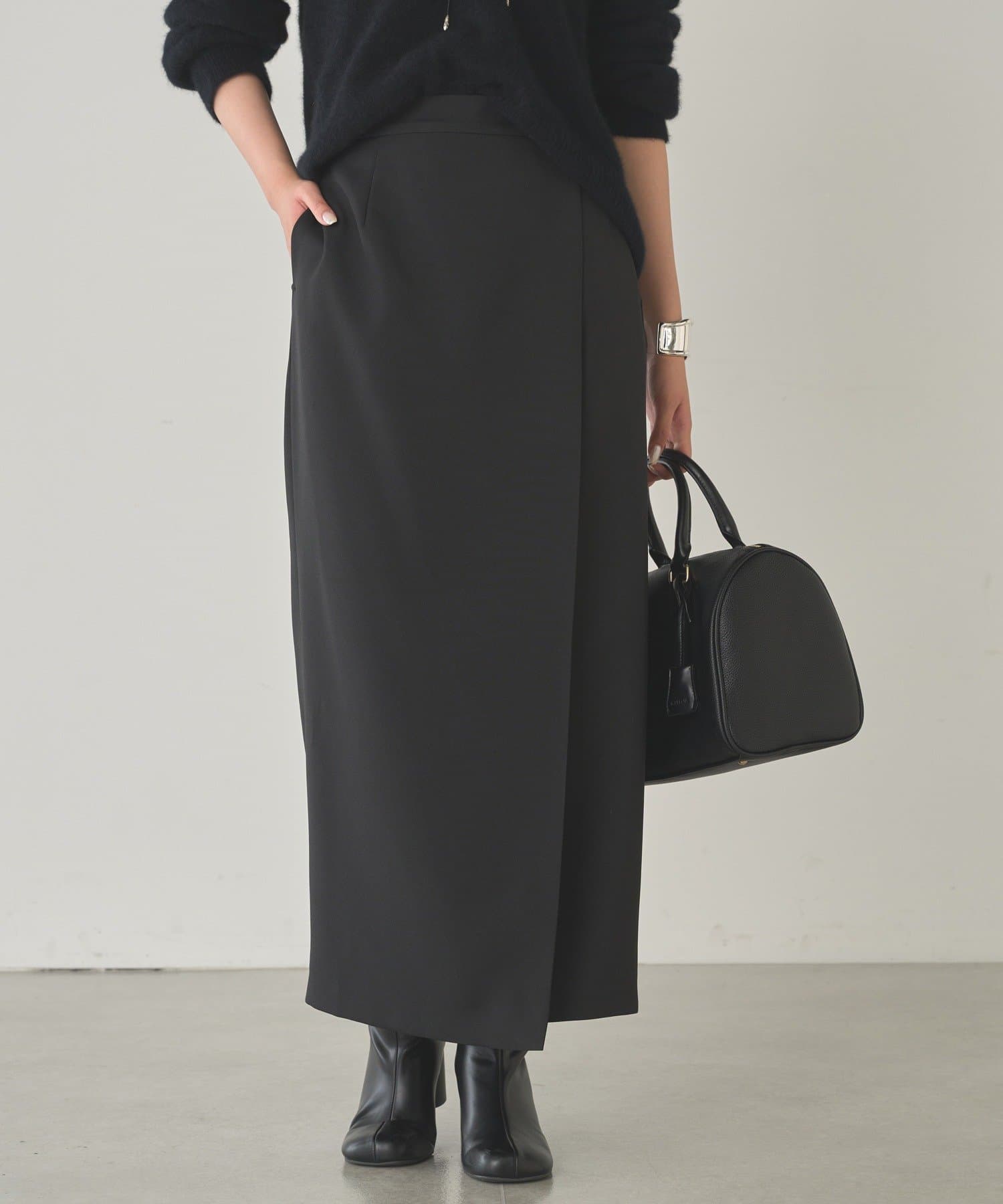 一見するとシンプルなブラックのスカート。しかし、アシンメトリーに重なるラップデザインが、あなたの個性を際立たせます。