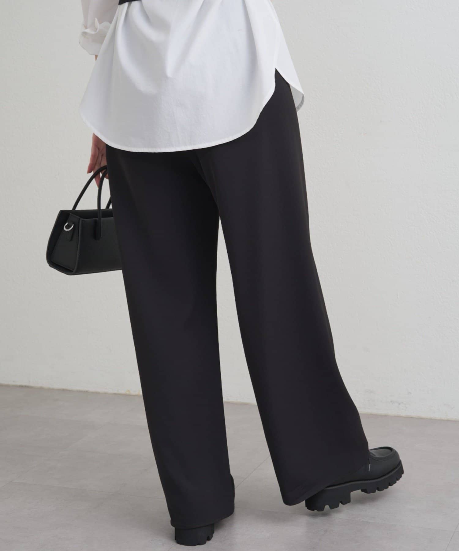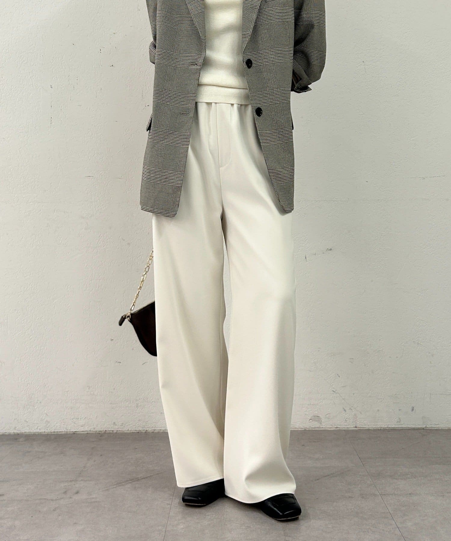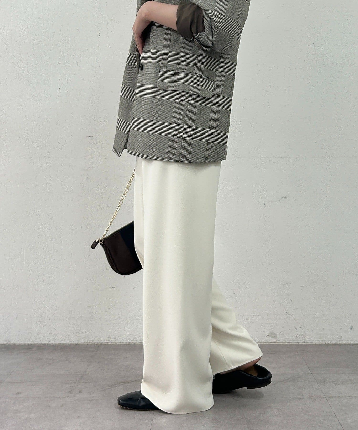 ストンと落ちるワイドシルエットが、気になるラインをカバーしつつ、スタイルアップ効果も。